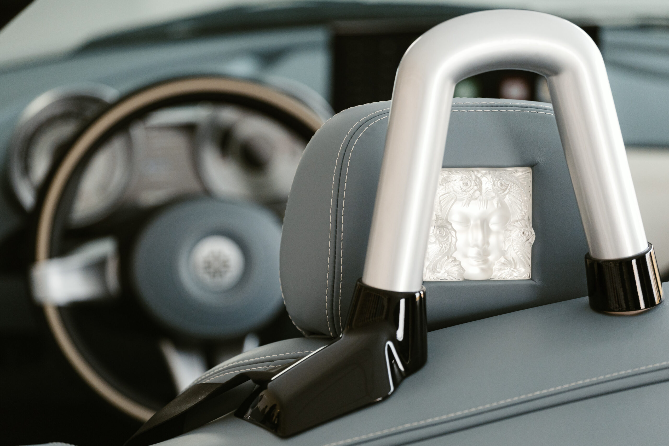 À l’intérieur, c’est une célébration du savoir-faire de Lalique. L’habitacle est orné de 13 éléments en cristal, façonnés à la main, complétés par du chêne anglais et du cuir raffiné. Ces cristaux arborent des motifs iconiques tels que Masque de Femme et Coutard, adaptés spécifiquement pour cette création.