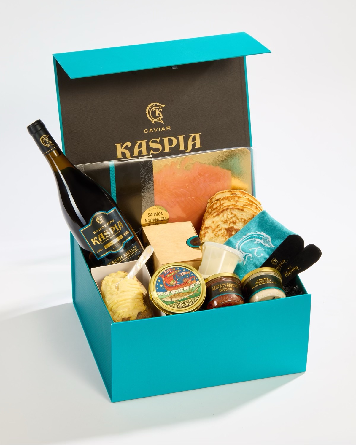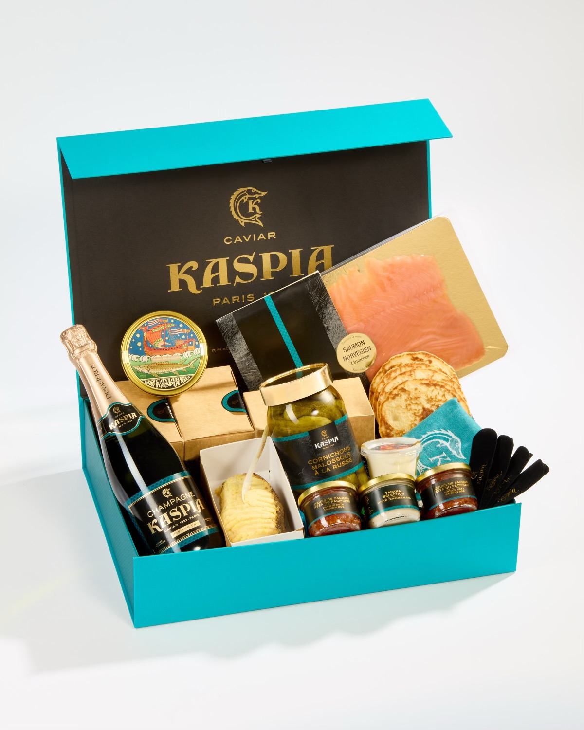 Ces coffrets, conçus pour deux ou quatre personnes, débutent à 250€ et incarnent le menu emblématique de la maison. Chaque coffret comprend un éventail de délices tels que le Tarama Kaspia accompagné de cornichons Malossols, du saumon fumé norvégien sur blinis, et de pommes de terre au four garnies de caviar Baeri. Chaque élément du menu est sélectionné avec soin pour assurer une expérience culinaire inoubliable, équivalente à celle des plus grands restaurants.