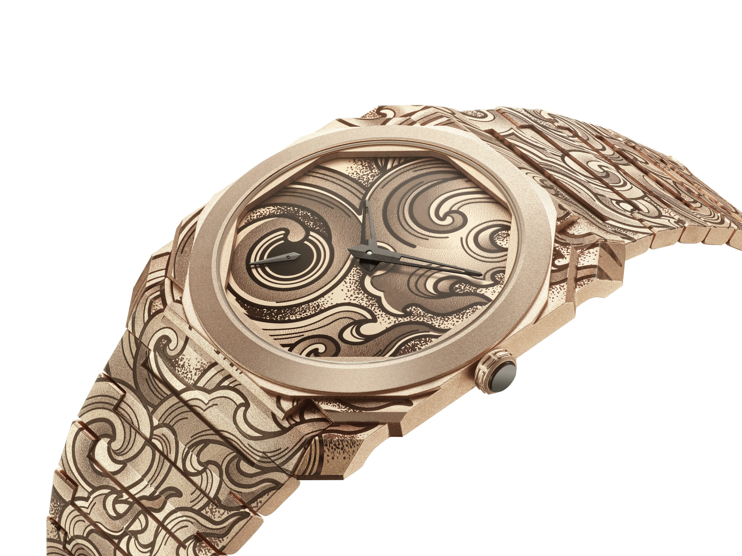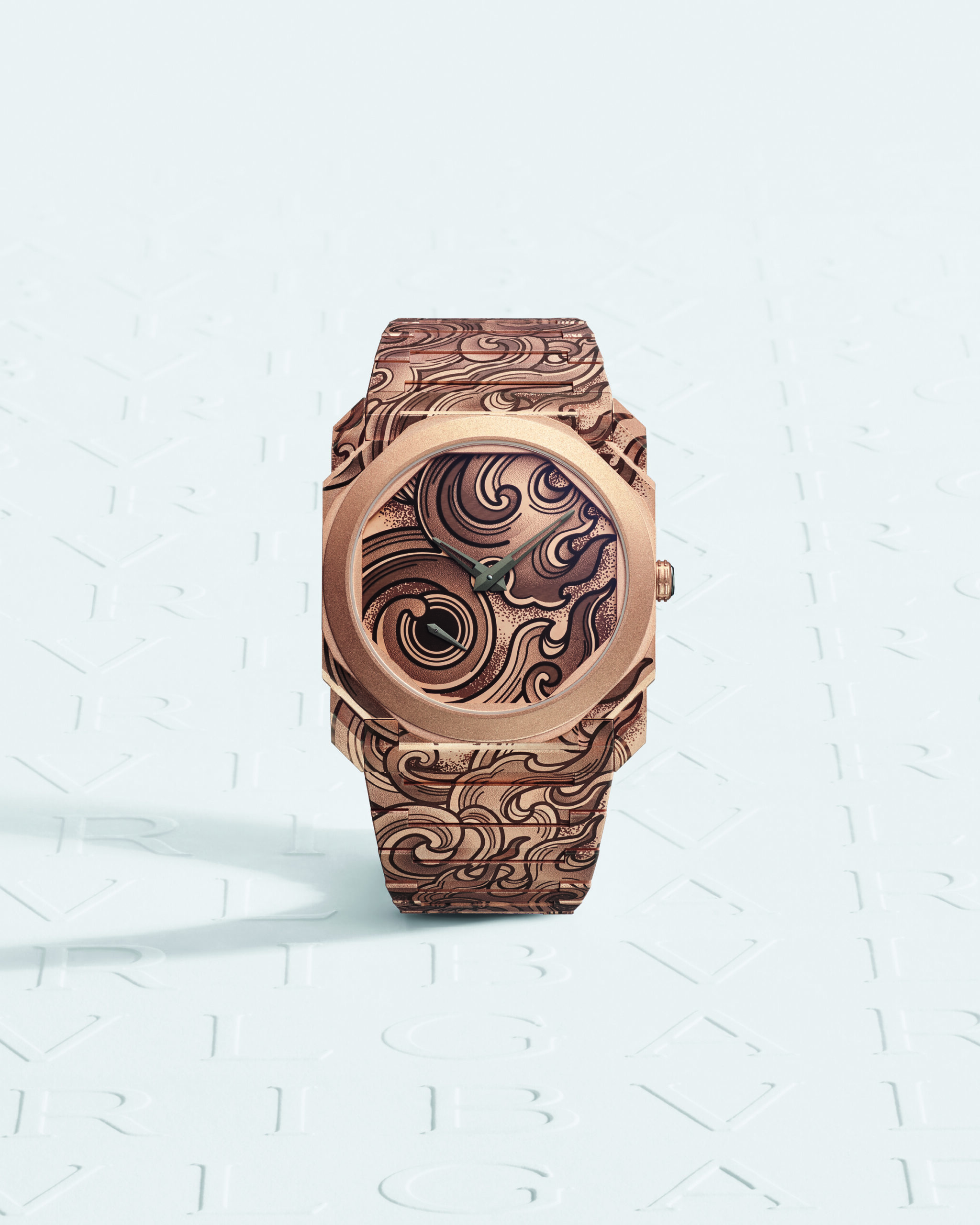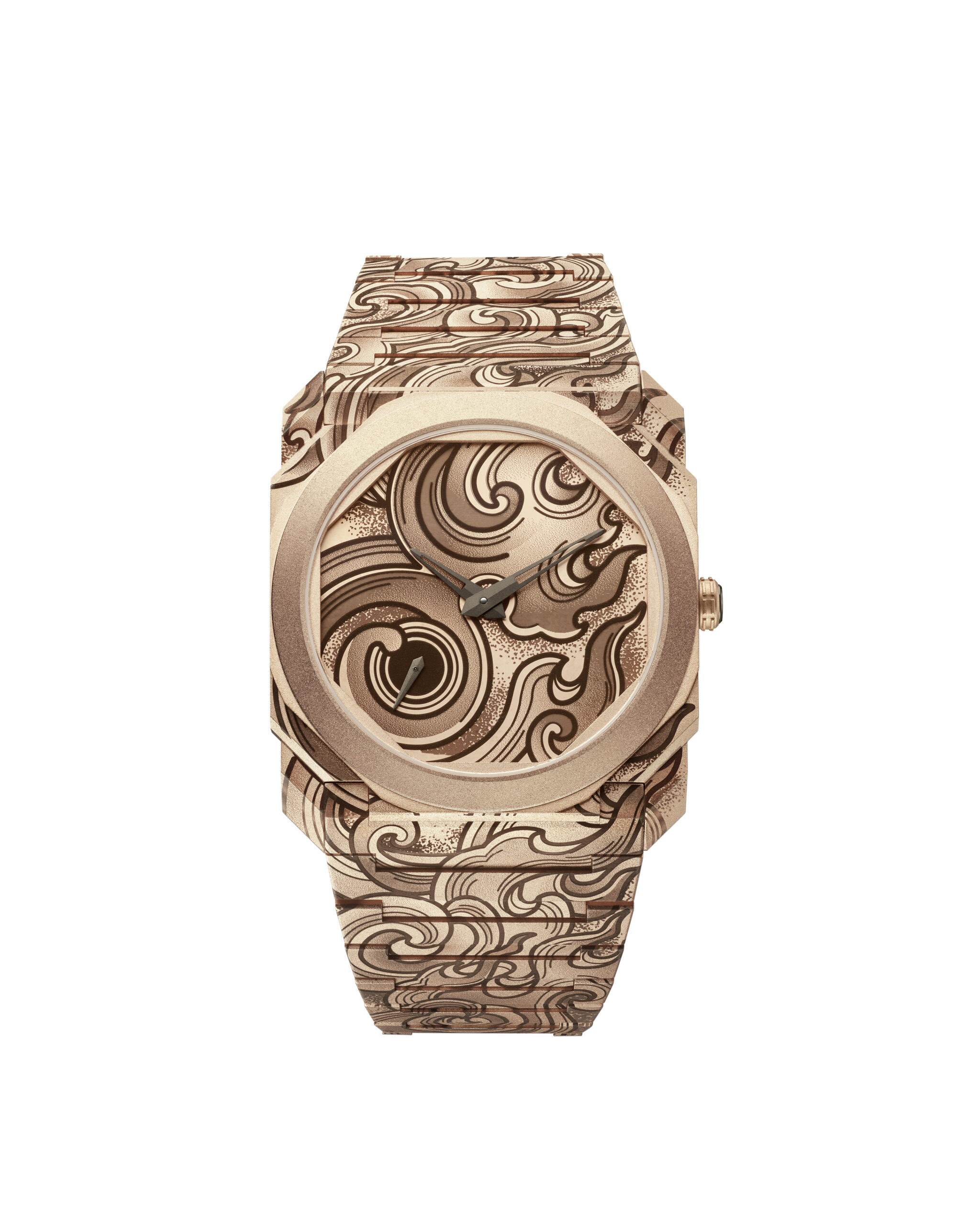 Après le lancement de l’Octo Finissimo Aria, émaillée de nuages et d’étoiles en 2021, puis celui de l’Octo Finissimo Aqua aux motifs aquatiques en 2022, la série atteint son apogée avec le modèle Fuoco. Contrairement à ses prédécesseurs en titane sablé, ce dernier opus est conçu en or rose, conférant à la montre une aura de chaleur et de raffinement caractéristique de Bvlgari.
