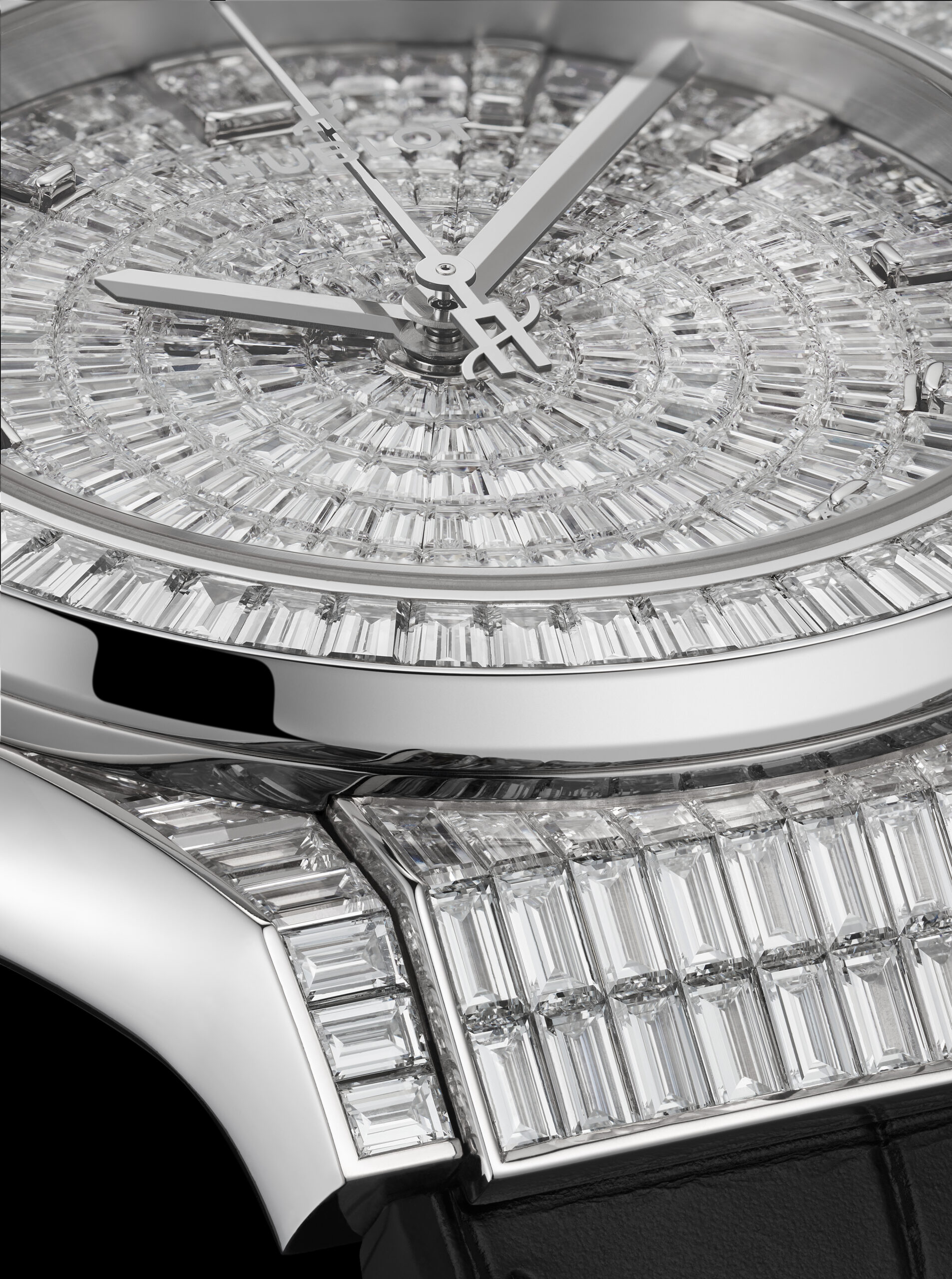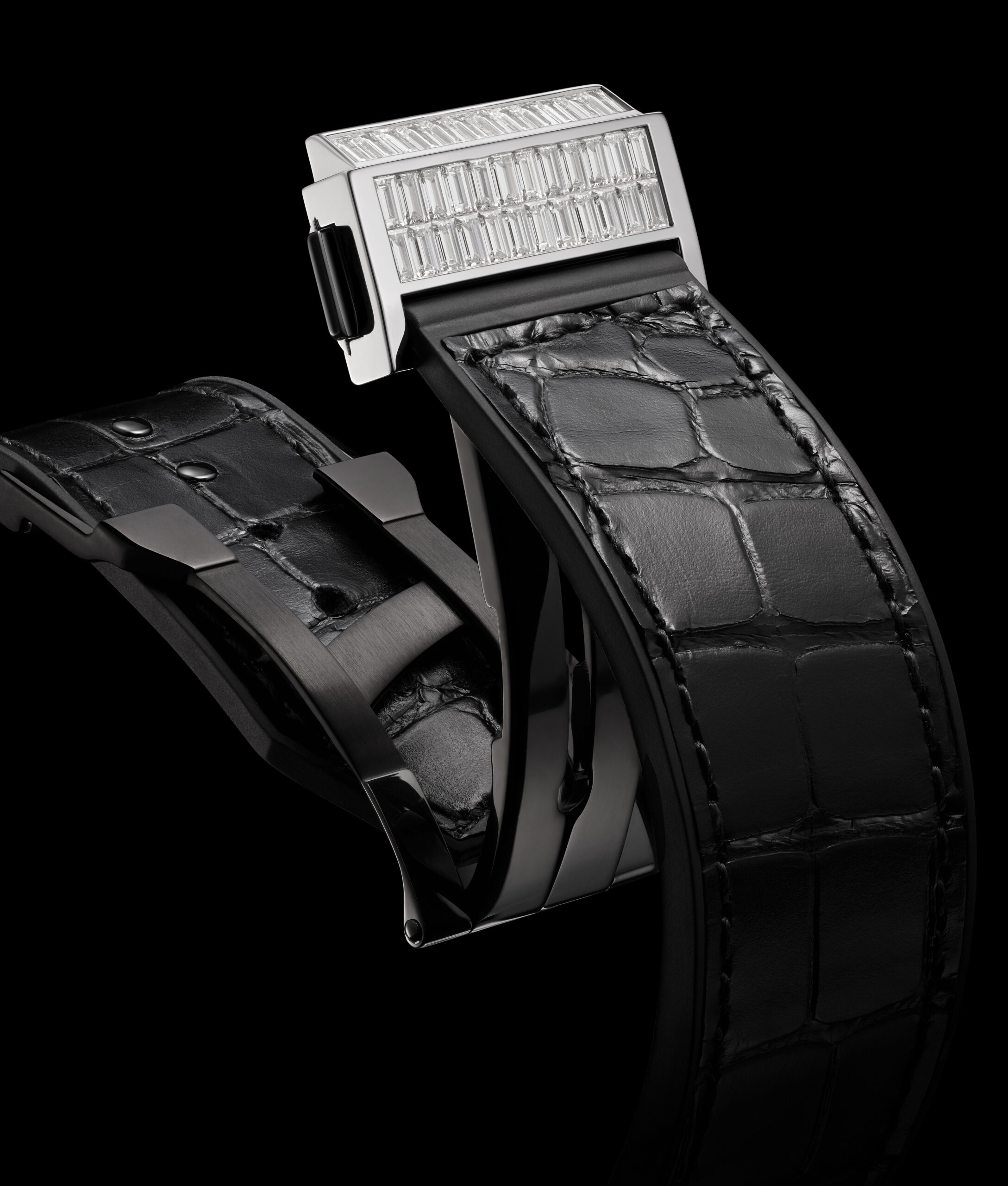 Le souci du détail est manifeste dans chaque composant de la montre, du bracelet en alligator doublé de caoutchouc noir à la boucle déployante sertie de 36 autres diamants baguette. Plus de 200 heures de travail sont nécessaires pour assembler cette montre, faisant de chaque pièce un trésor d’artisanat.