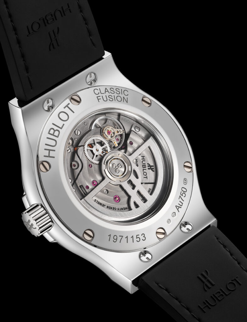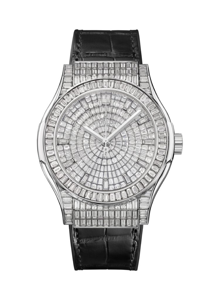 L’horlogerie et la joaillerie ne sont pas les seules maîtresses de cette création; l’ingénierie elle-même joue un rôle clé. Sous cette panoplie d’éclat se trouve le calibre HUB1710, un mouvement à remontage automatique qui bat à une fréquence de 4 Hz. Avec une réserve de marche de 50 heures, cette montre est aussi fonctionnelle qu’elle est belle. Le dos en verre saphir permet une vue imprenable sur le mécanisme, ajoutant une touche de transparence et de fascination.