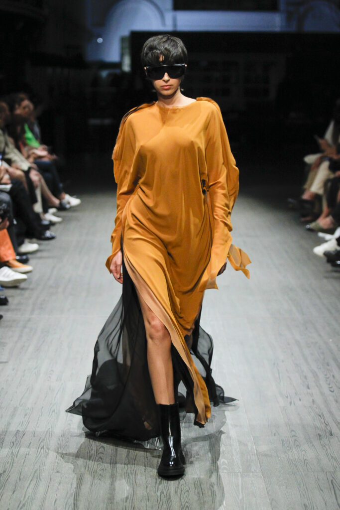 La collection mêle à la perfection une variété de matières, alternant entre l’organza éthéré, le néoprène sculptural et des tissus expérimentaux. Cette diversité matérielle donne naissance à une panoplie de visions inédites qui, tout en respectant le style caractéristique de la marque, enrichissent continuellement son ADN. On peut ainsi y retrouver l’artisanat exceptionnel qui distingue DAVII, soulignant les particularités de conception qui sont l’apanage de la maison.