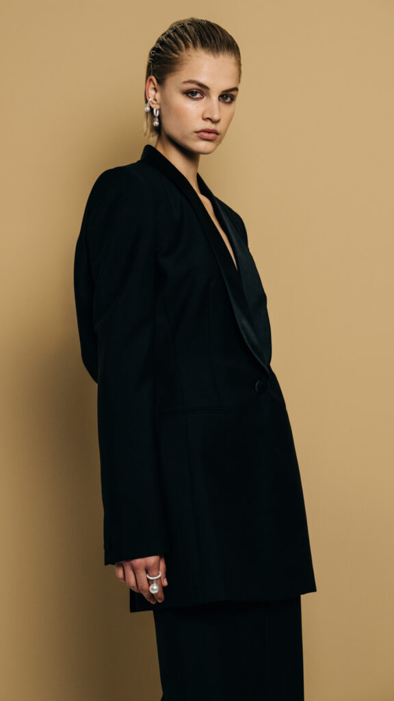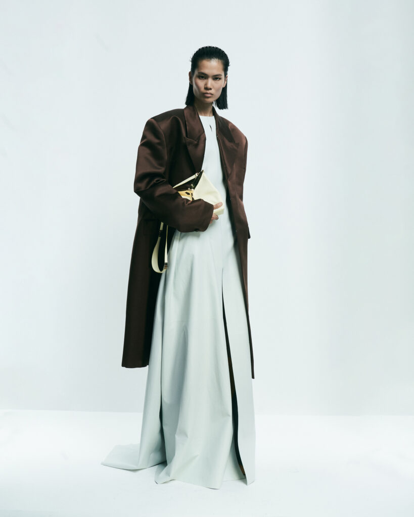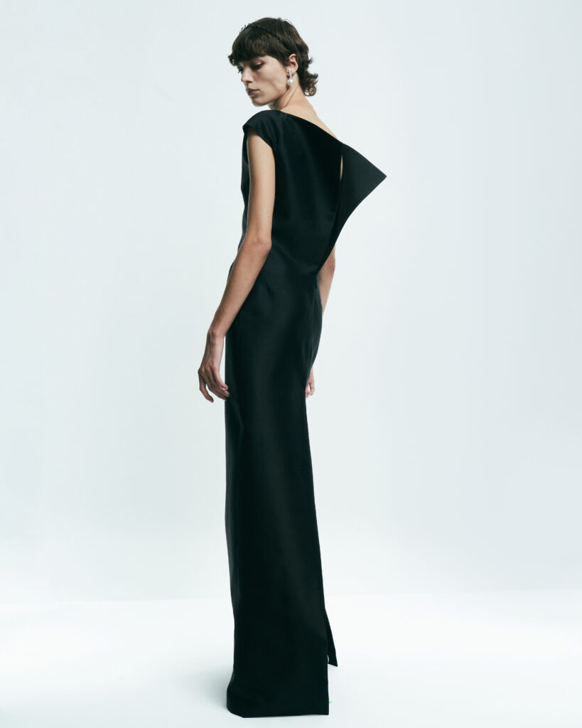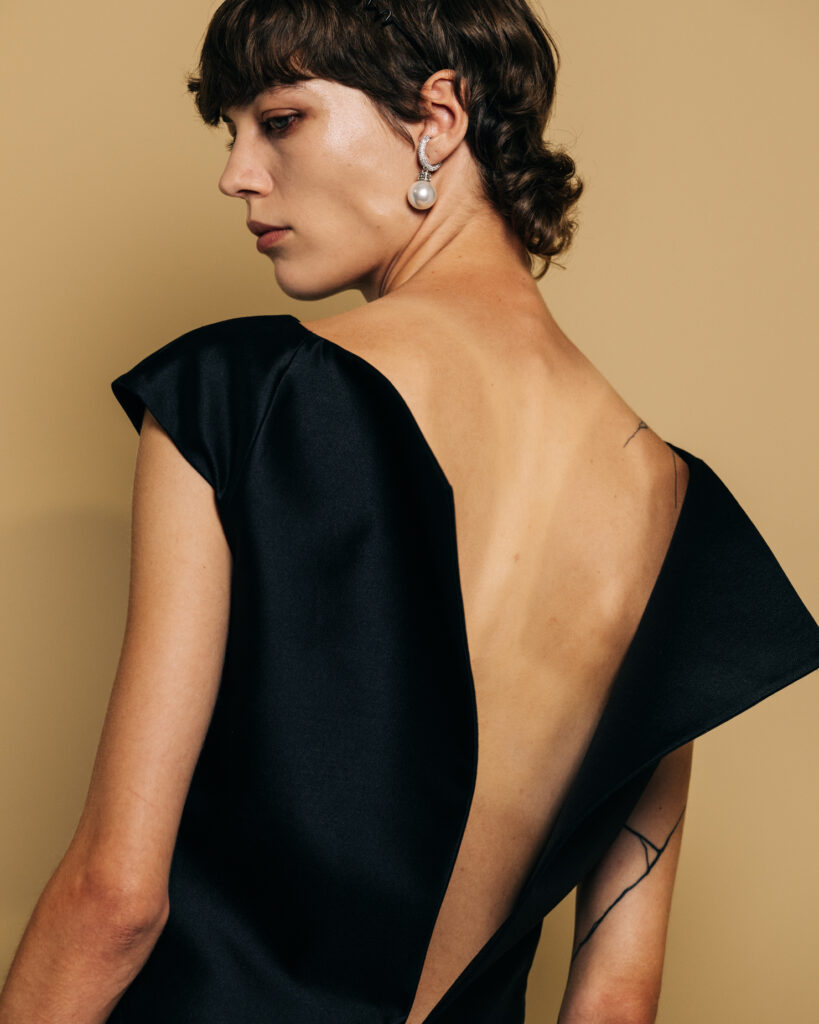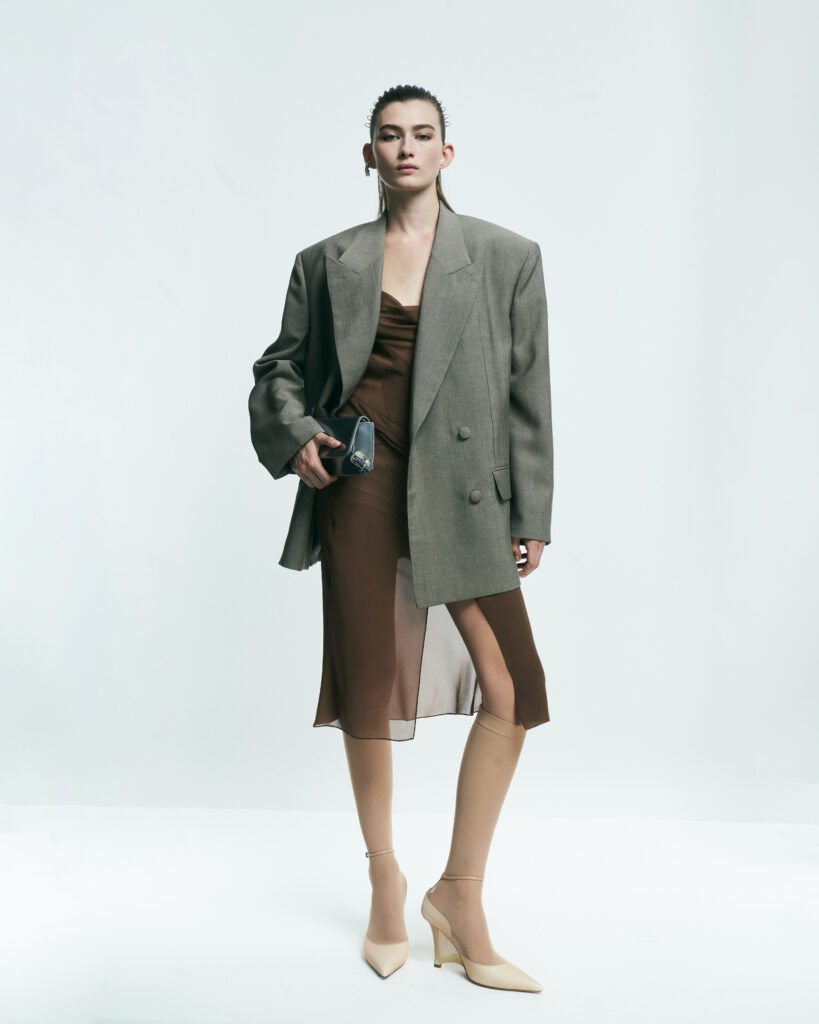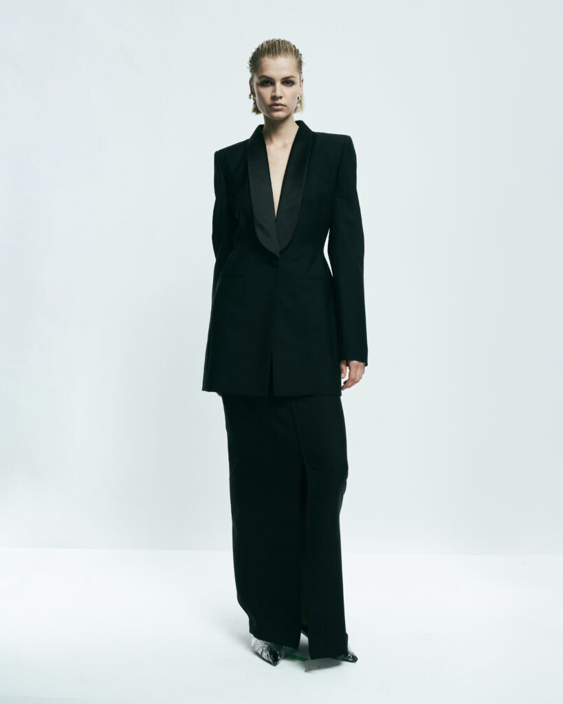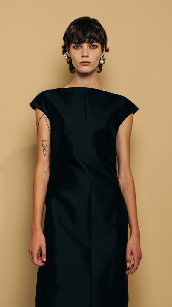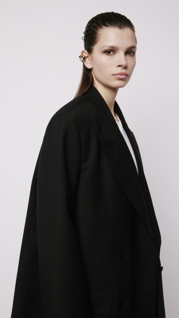 La collection révèle un dialogue entre le rigide et le détendu, où la taille architectonique et les tissus de laine raffinée sont façonnés avec des courbes en demi-lune. Les dos ouverts plongeants ou ailés des vestes et des robes rappellent la langue de la haute couture, tandis que des blazers double boutonnage doucement structurés créent une silhouette enveloppante.