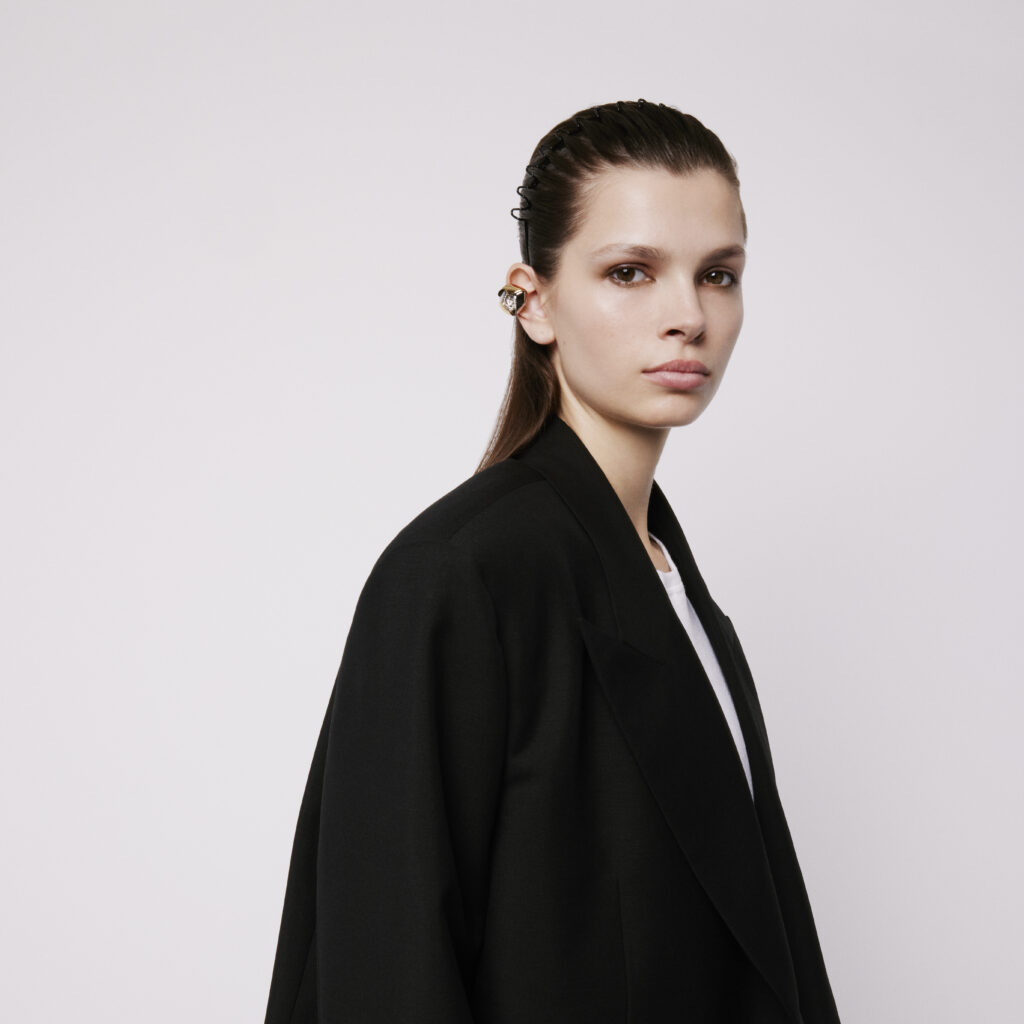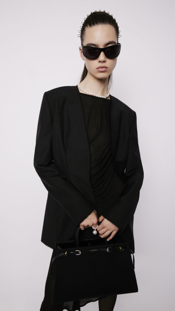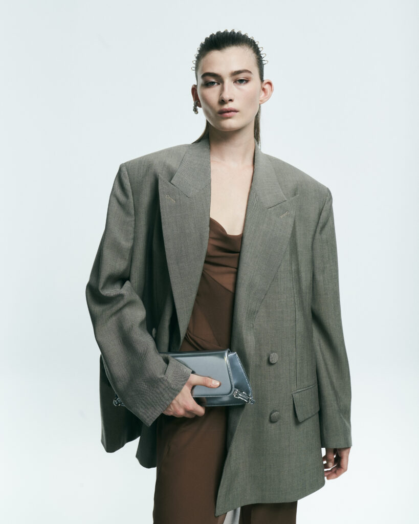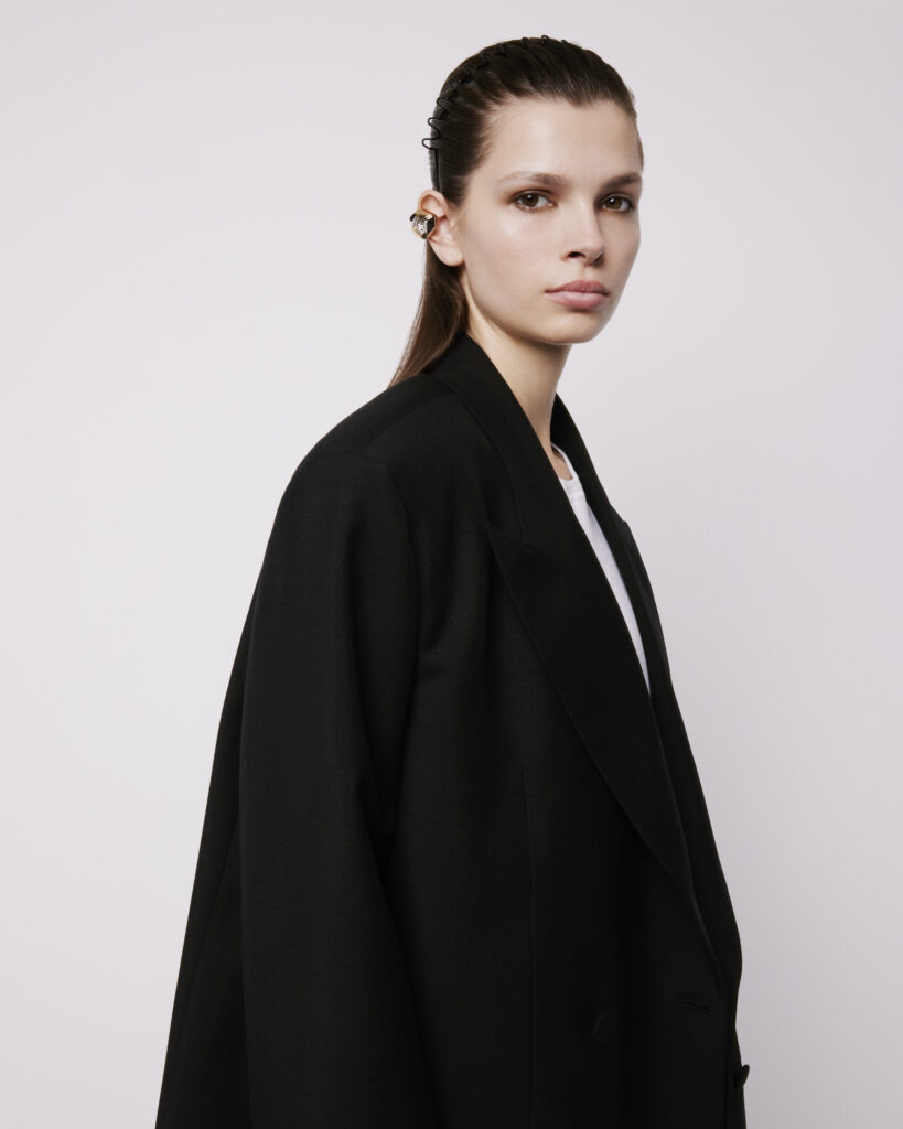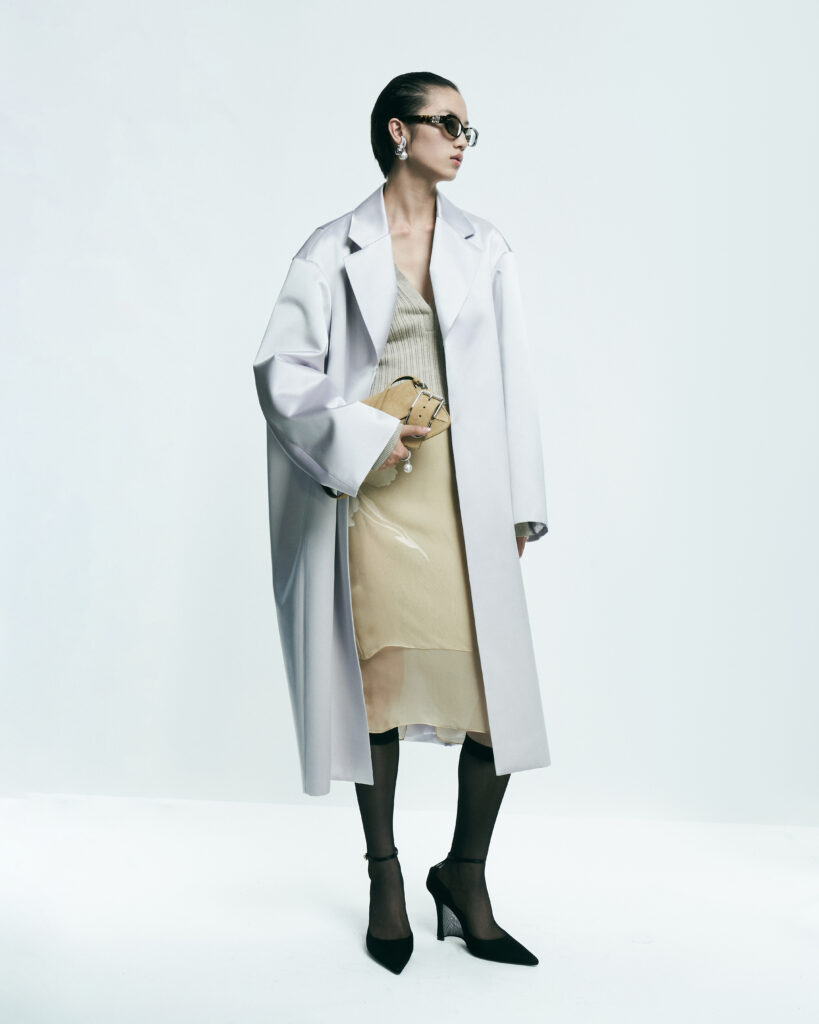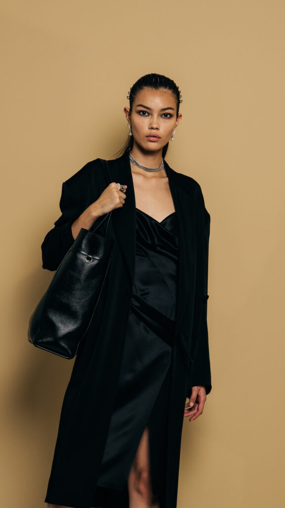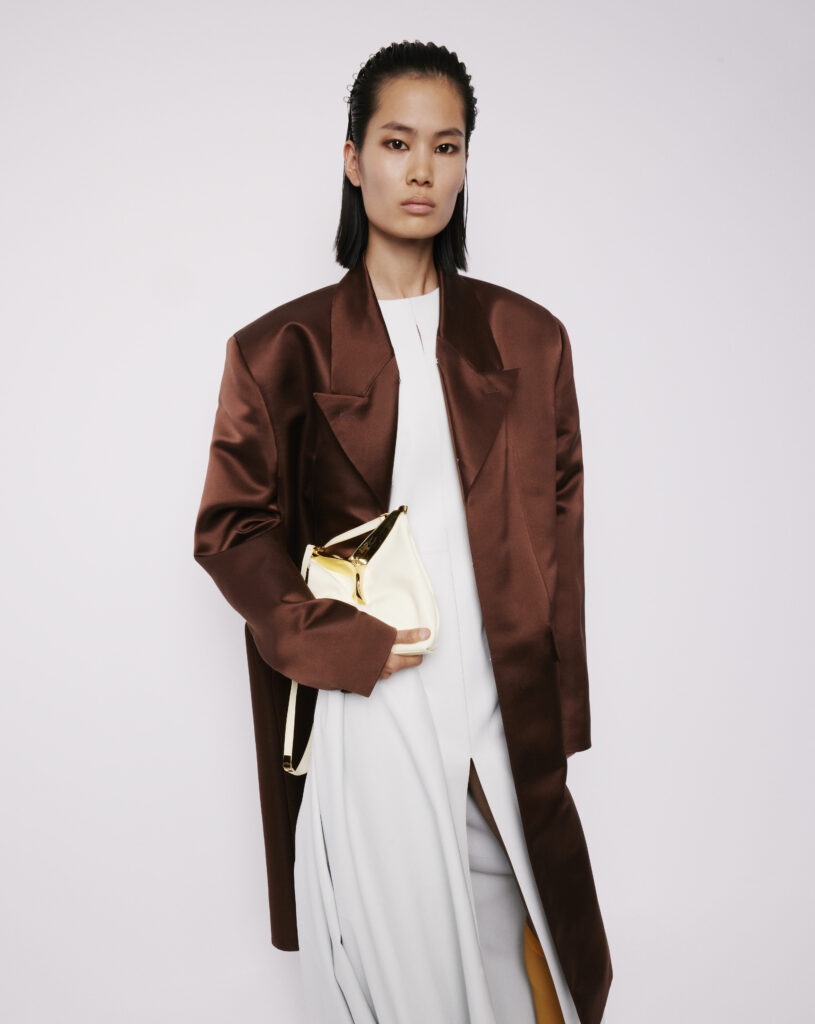 La collection révèle un dialogue entre le rigide et le détendu, où la taille architectonique et les tissus de laine raffinée sont façonnés avec des courbes en demi-lune. Les dos ouverts plongeants ou ailés des vestes et des robes rappellent la langue de la haute couture, tandis que des blazers double boutonnage doucement structurés créent une silhouette enveloppante.