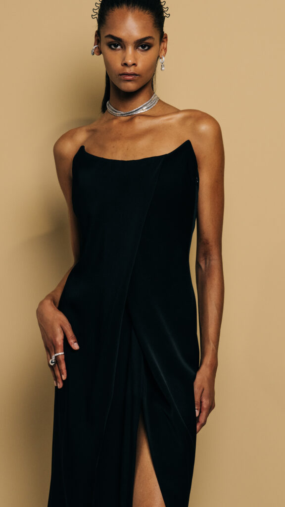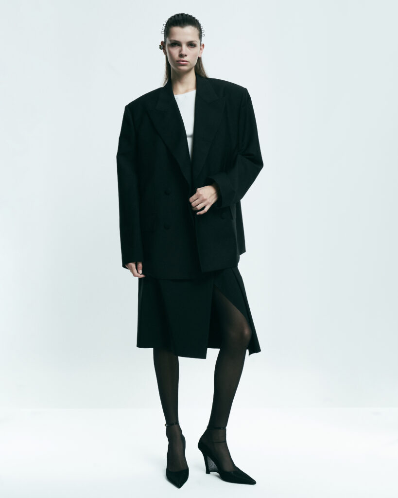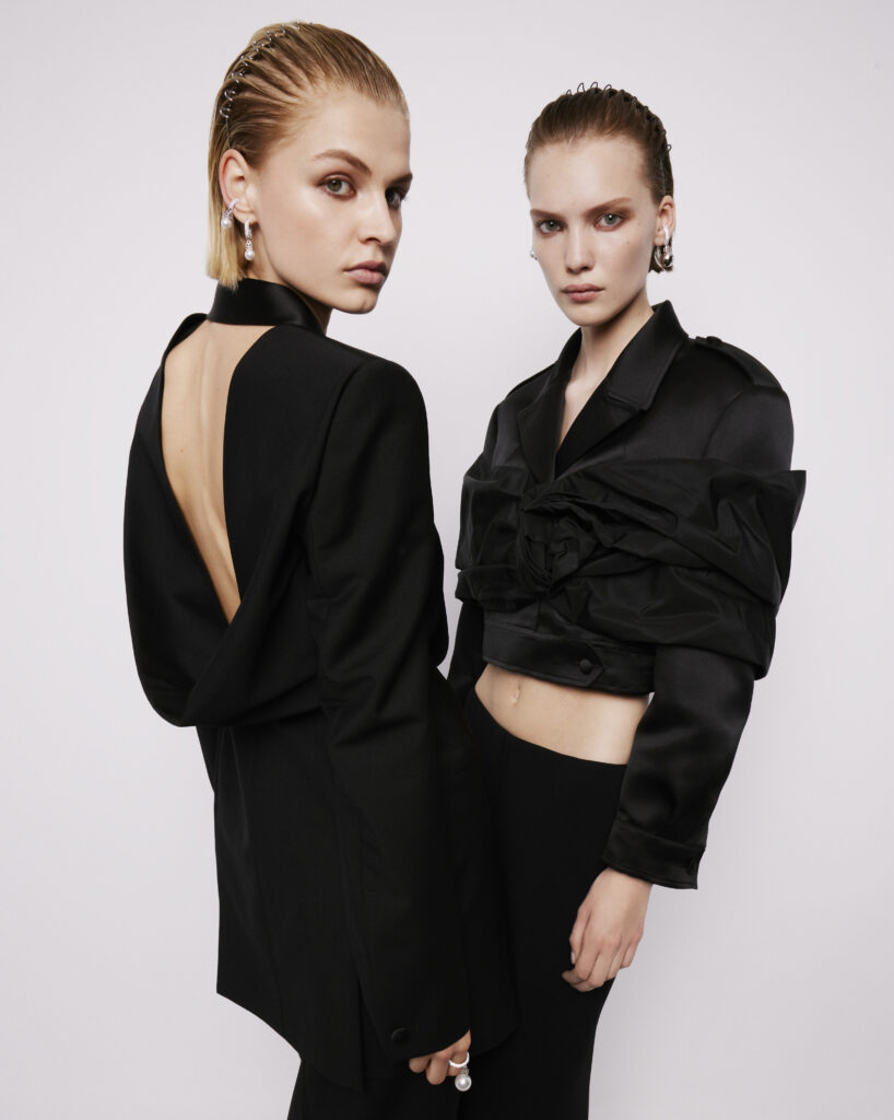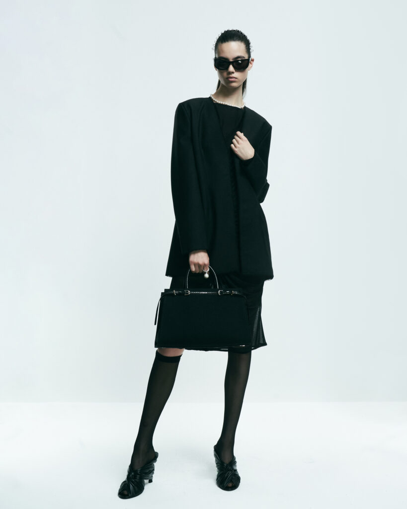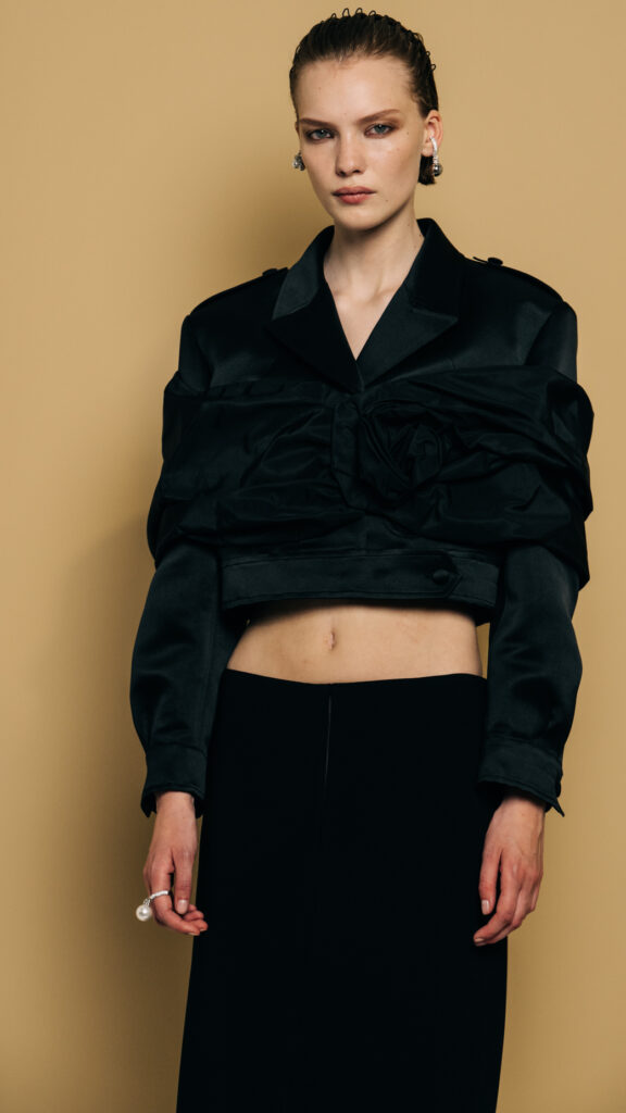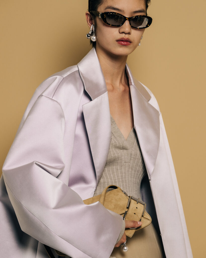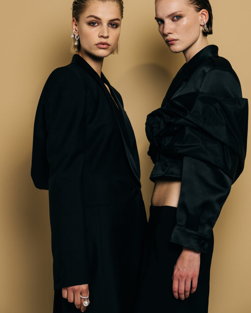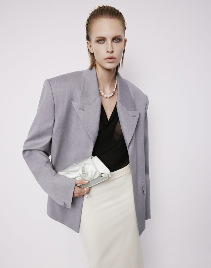 La collection révèle un dialogue entre le rigide et le détendu, où la taille architectonique et les tissus de laine raffinée sont façonnés avec des courbes en demi-lune. Les dos ouverts plongeants ou ailés des vestes et des robes rappellent la langue de la haute couture, tandis que des blazers double boutonnage doucement structurés créent une silhouette enveloppante.