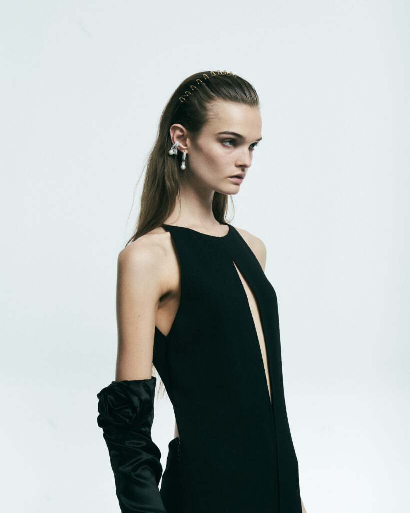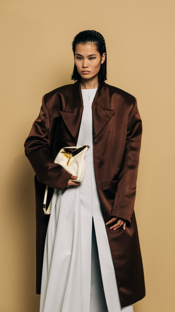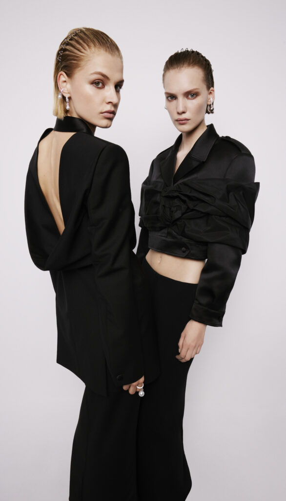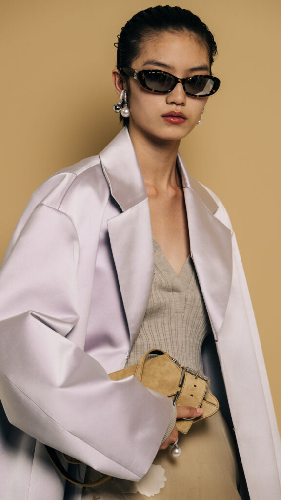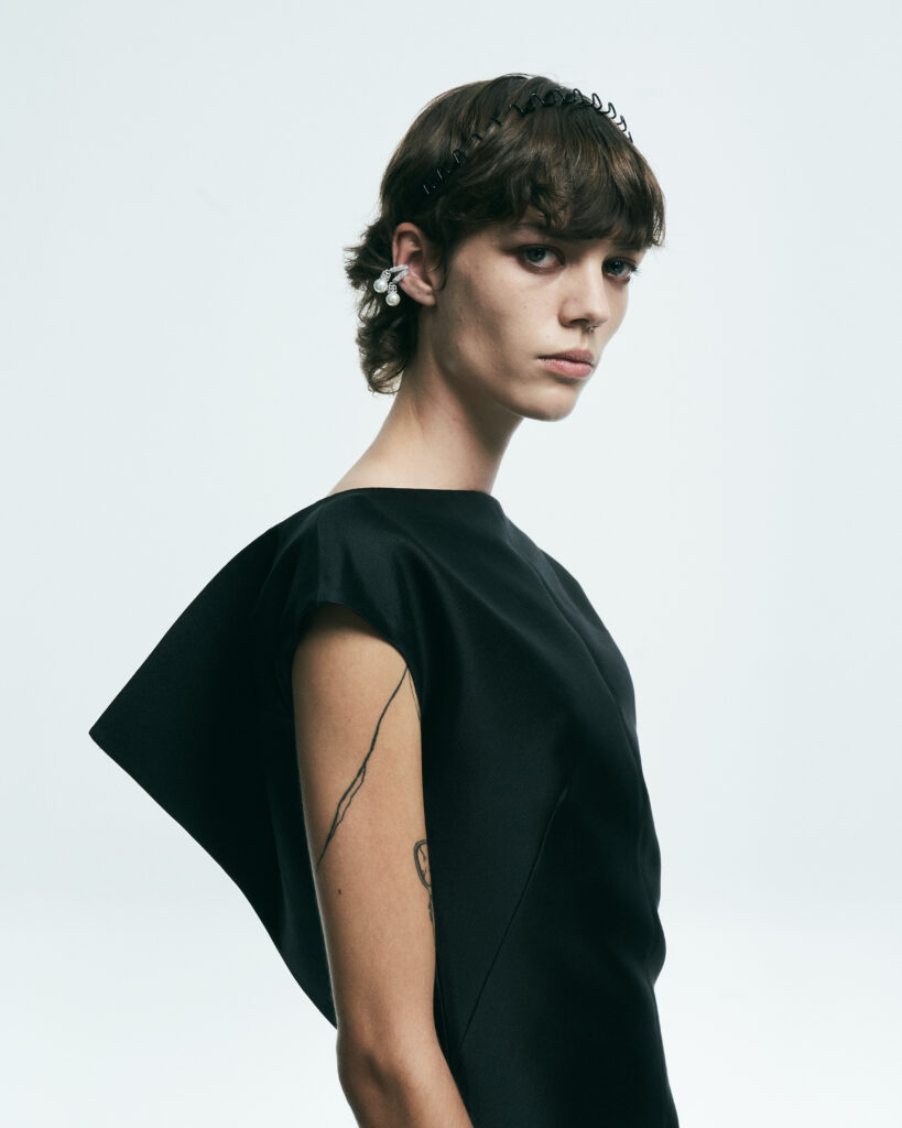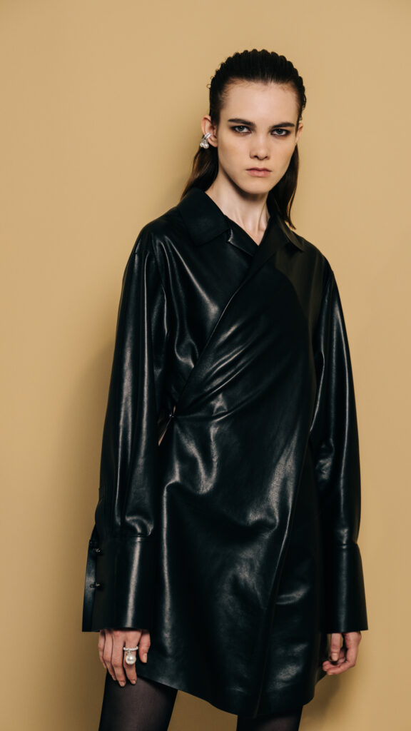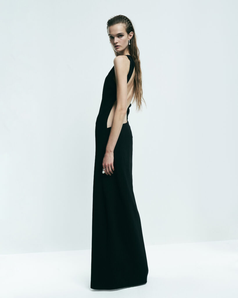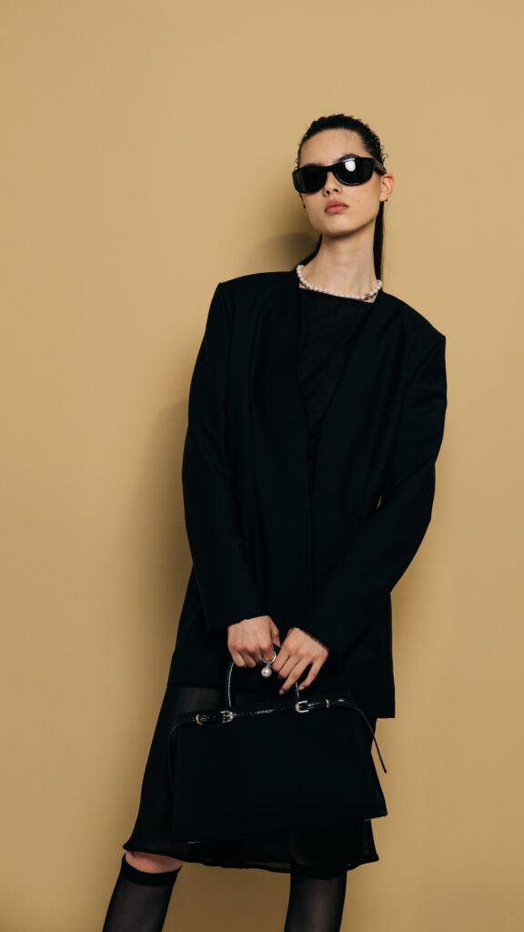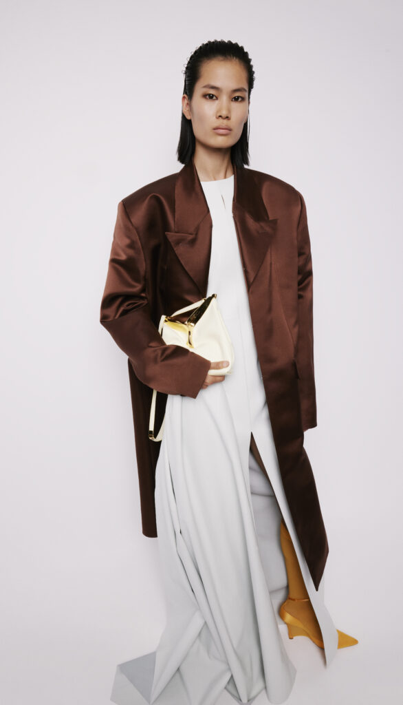 La collection révèle un dialogue entre le rigide et le détendu, où la taille architectonique et les tissus de laine raffinée sont façonnés avec des courbes en demi-lune. Les dos ouverts plongeants ou ailés des vestes et des robes rappellent la langue de la haute couture, tandis que des blazers double boutonnage doucement structurés créent une silhouette enveloppante.