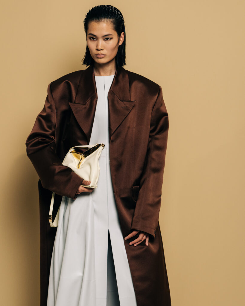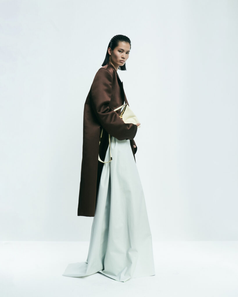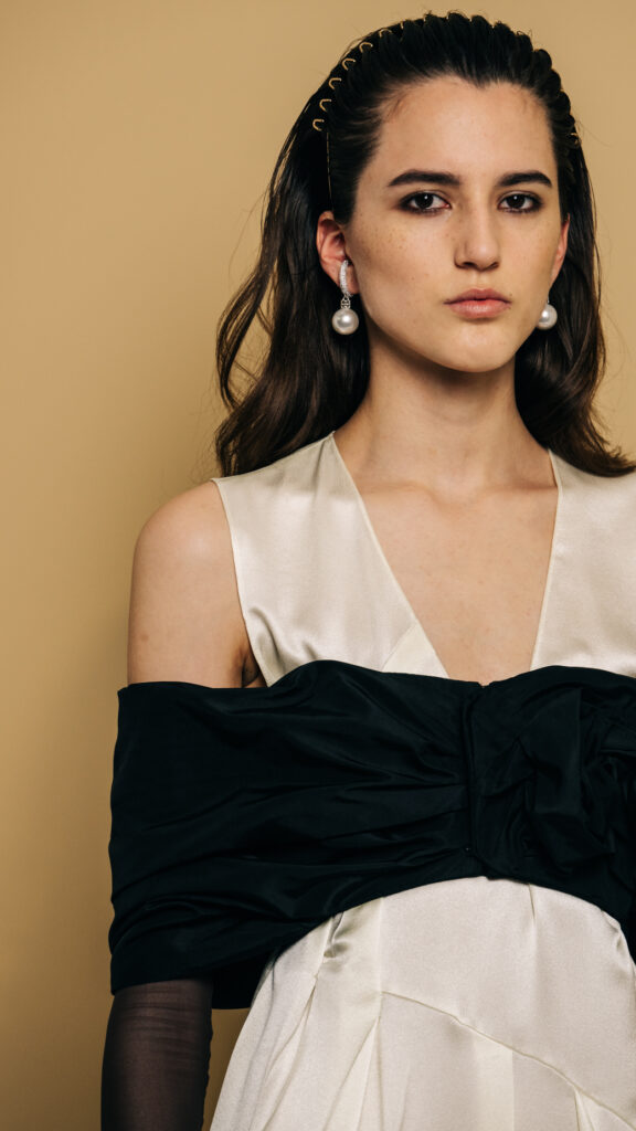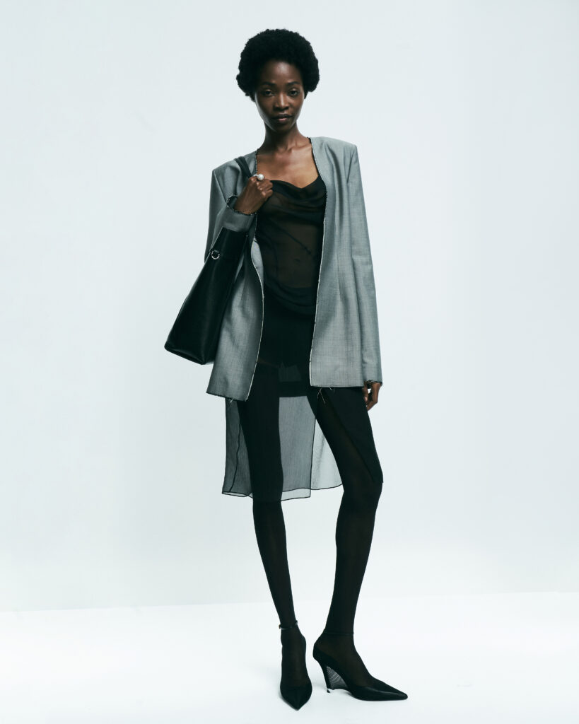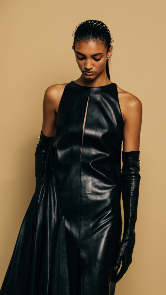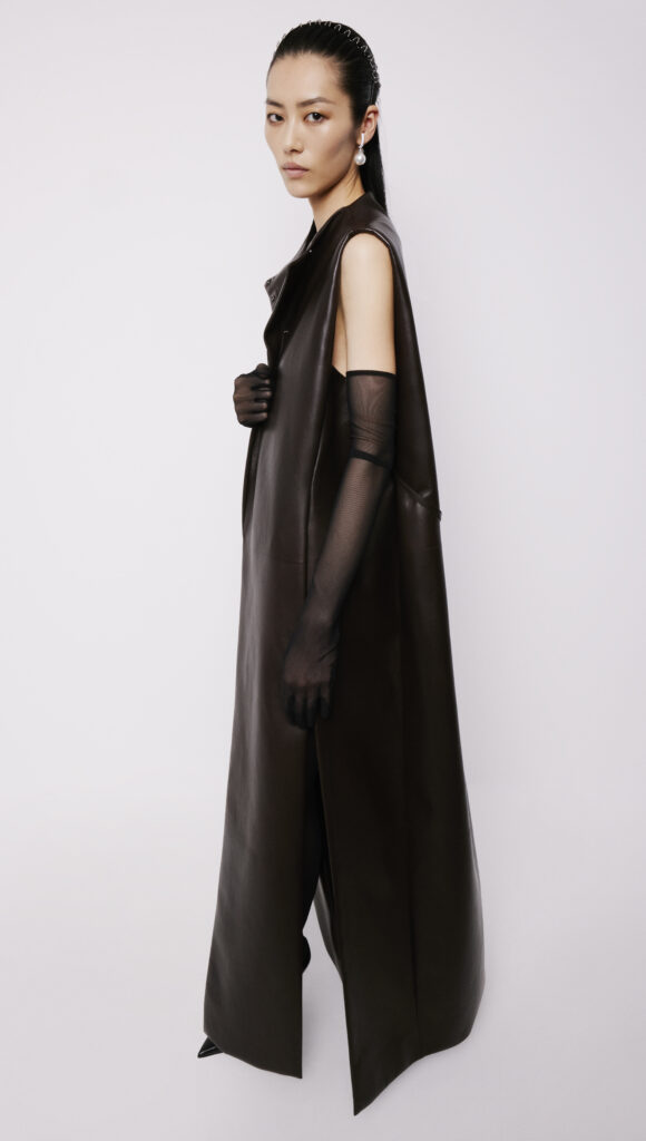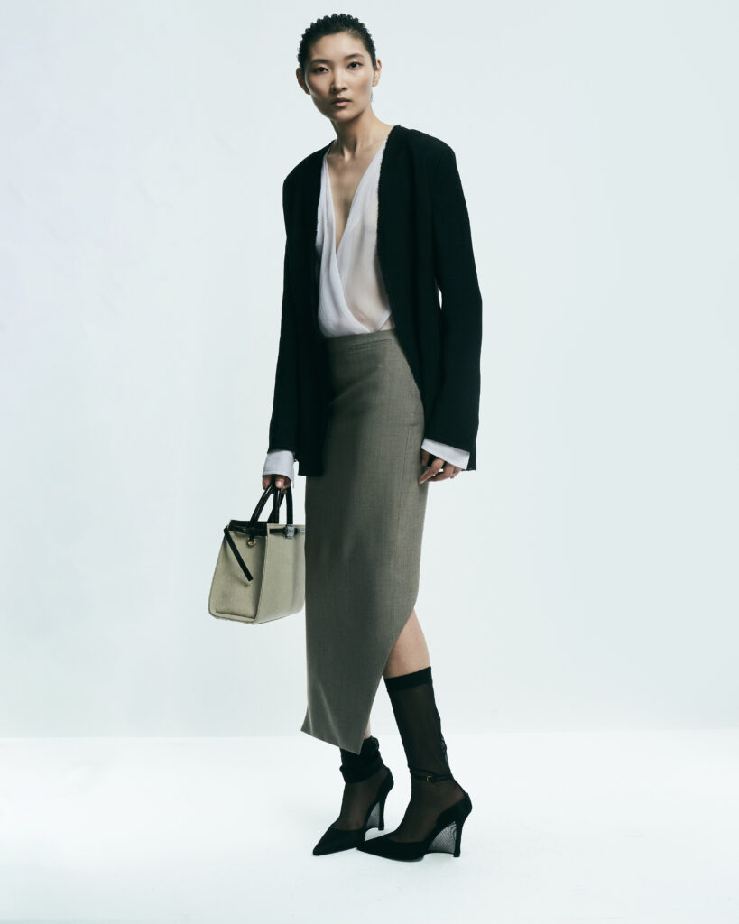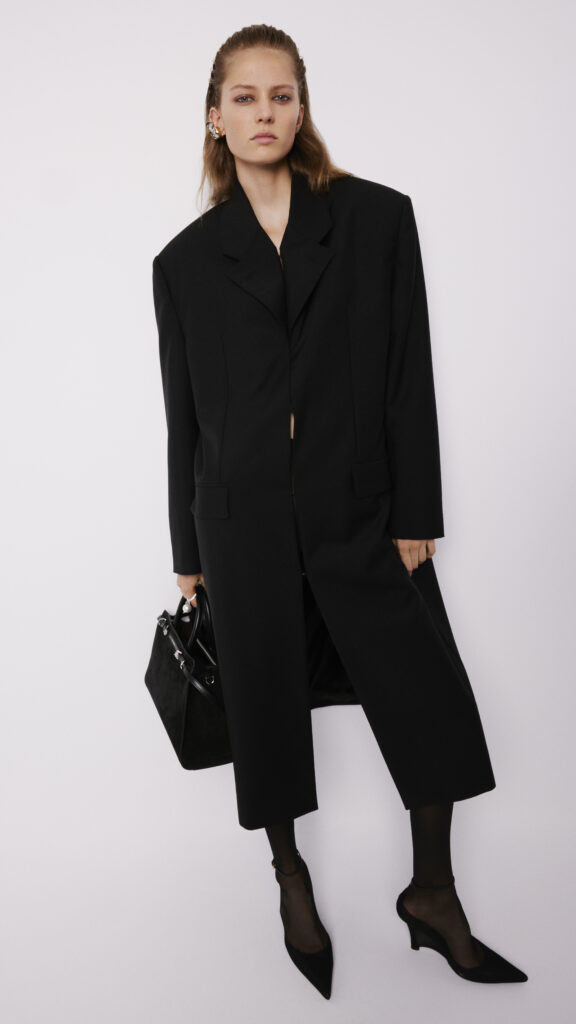 La collection révèle un dialogue entre le rigide et le détendu, où la taille architectonique et les tissus de laine raffinée sont façonnés avec des courbes en demi-lune. Les dos ouverts plongeants ou ailés des vestes et des robes rappellent la langue de la haute couture, tandis que des blazers double boutonnage doucement structurés créent une silhouette enveloppante.