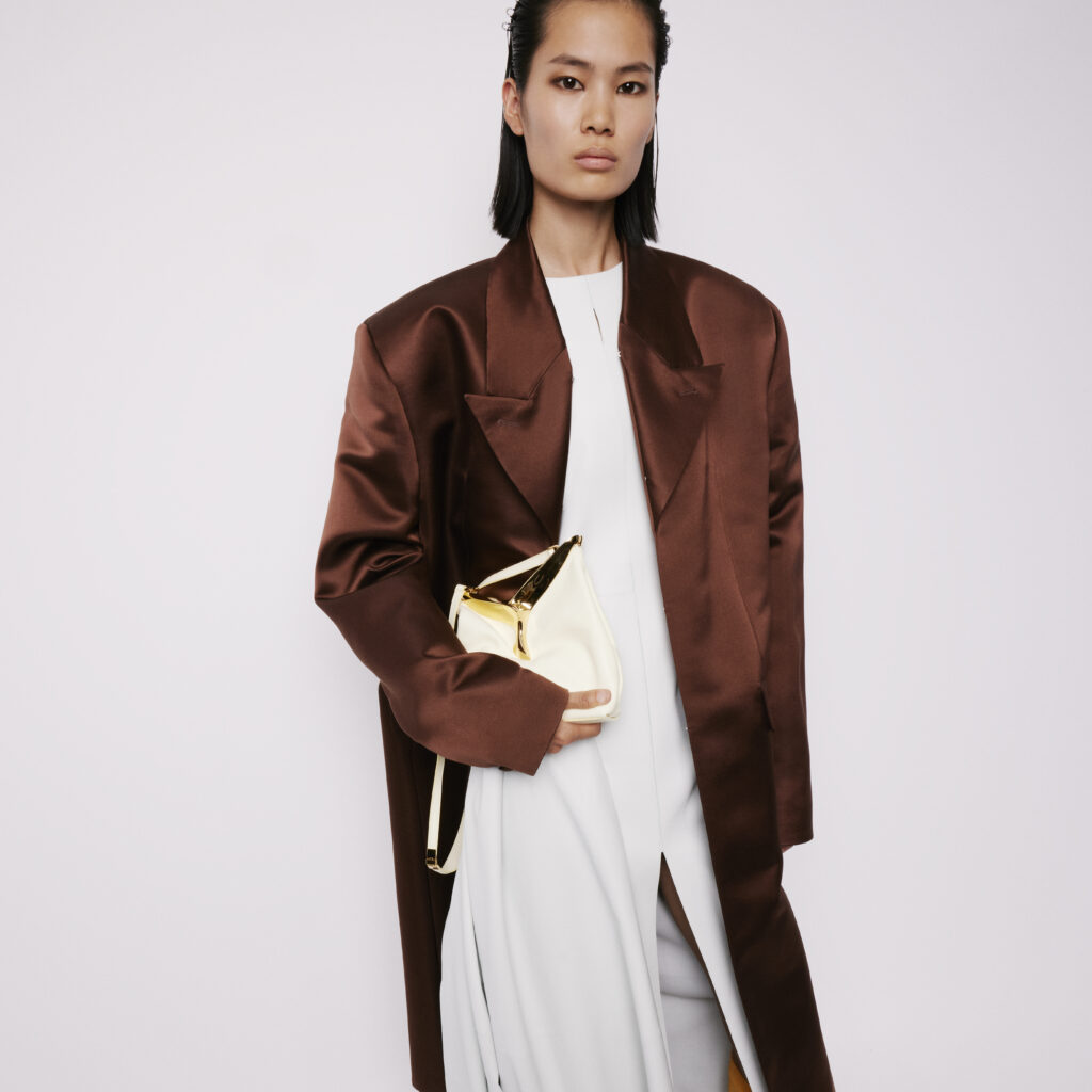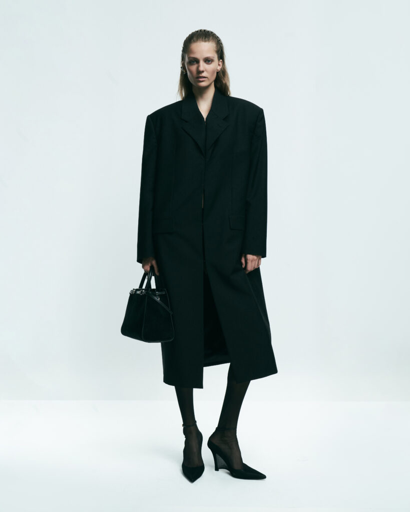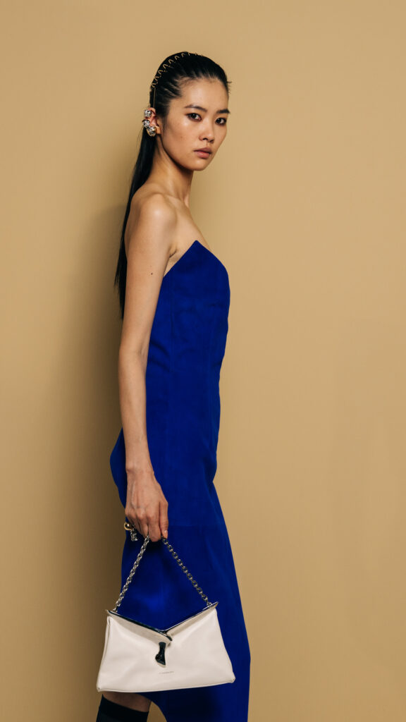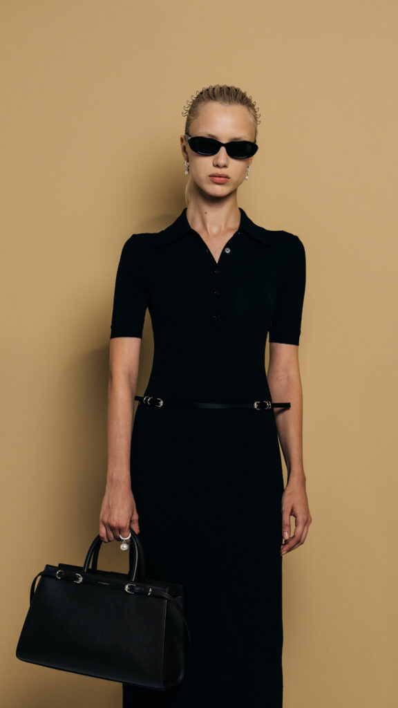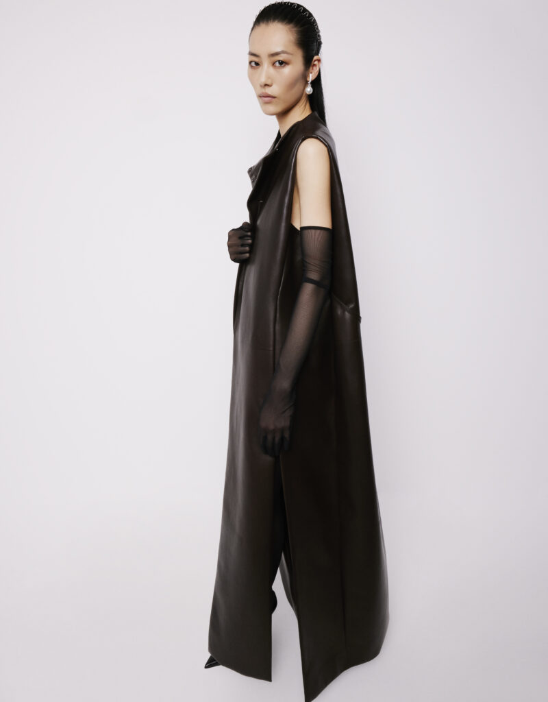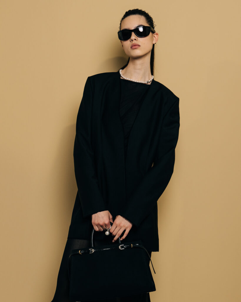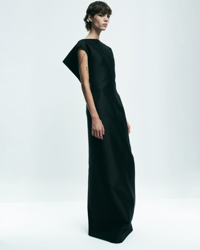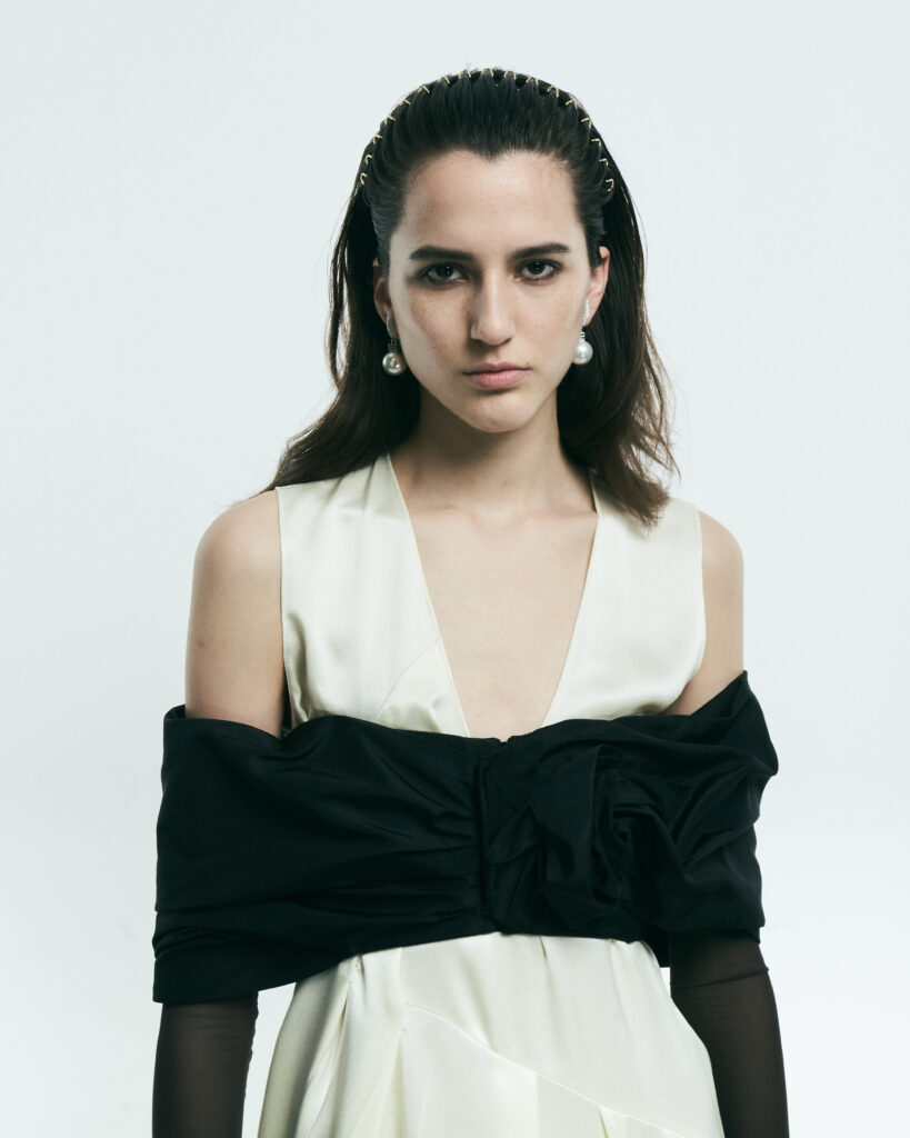 La collection révèle un dialogue entre le rigide et le détendu, où la taille architectonique et les tissus de laine raffinée sont façonnés avec des courbes en demi-lune. Les dos ouverts plongeants ou ailés des vestes et des robes rappellent la langue de la haute couture, tandis que des blazers double boutonnage doucement structurés créent une silhouette enveloppante.