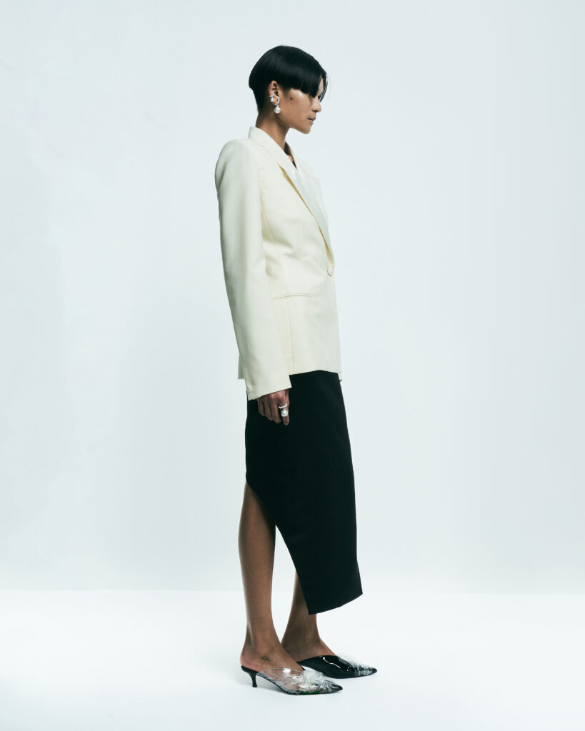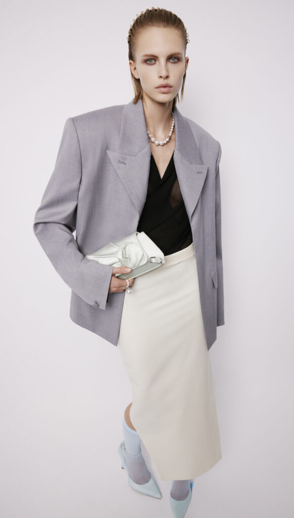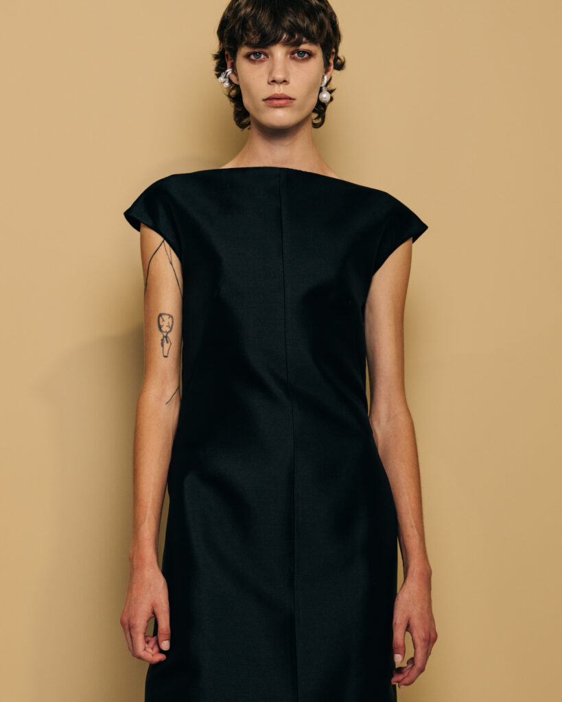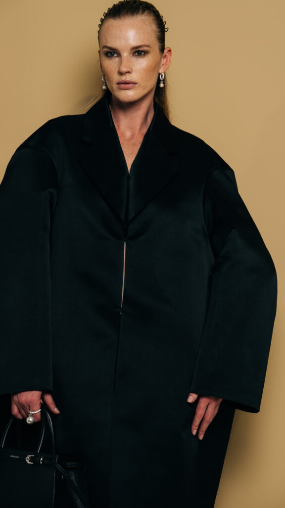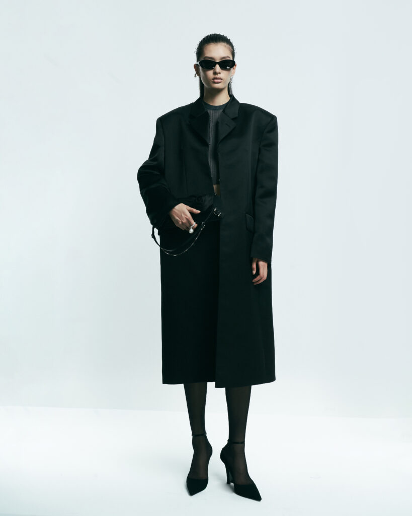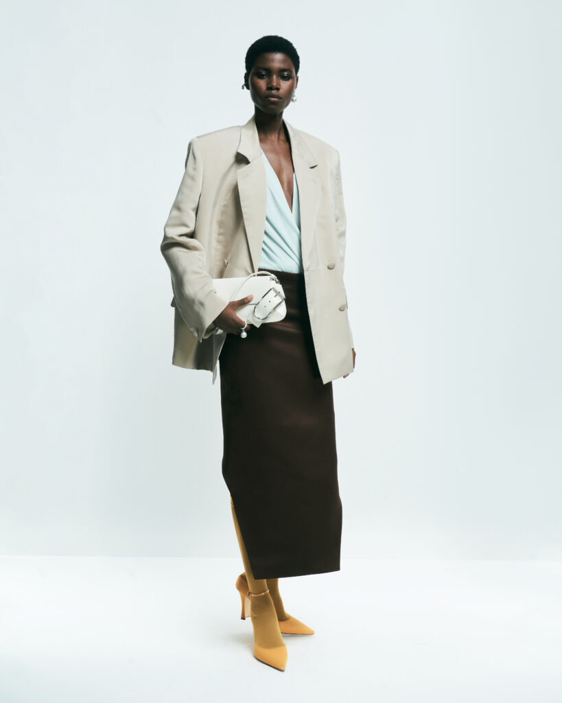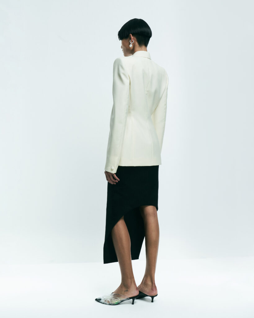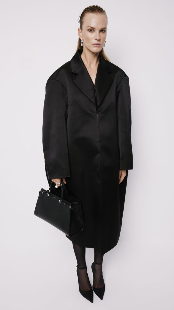 La collection révèle un dialogue entre le rigide et le détendu, où la taille architectonique et les tissus de laine raffinée sont façonnés avec des courbes en demi-lune. Les dos ouverts plongeants ou ailés des vestes et des robes rappellent la langue de la haute couture, tandis que des blazers double boutonnage doucement structurés créent une silhouette enveloppante.