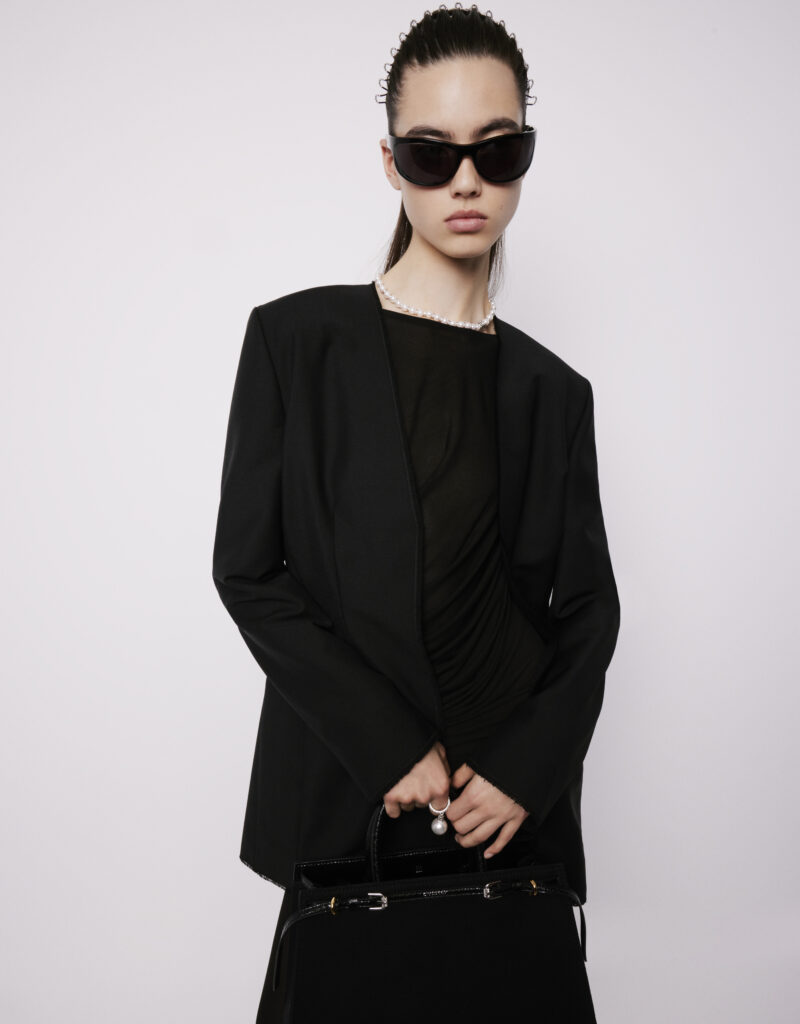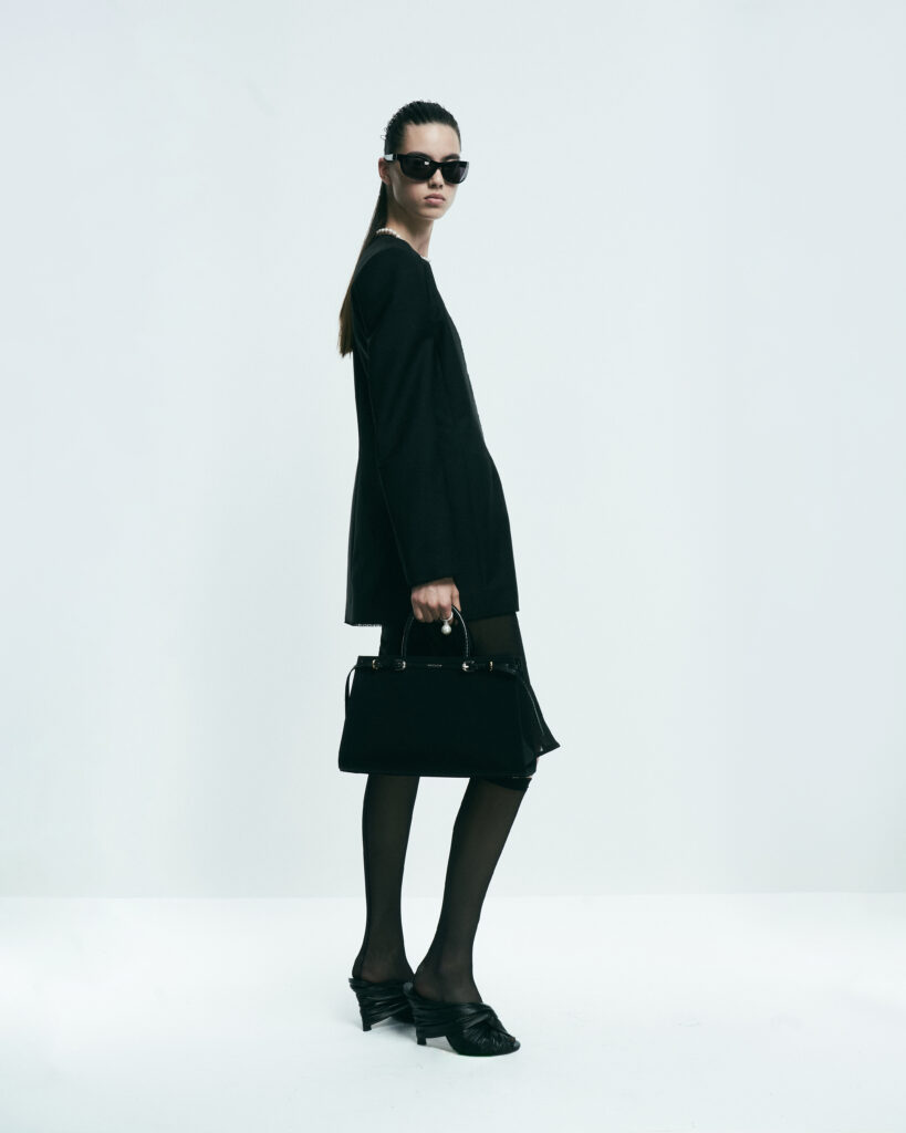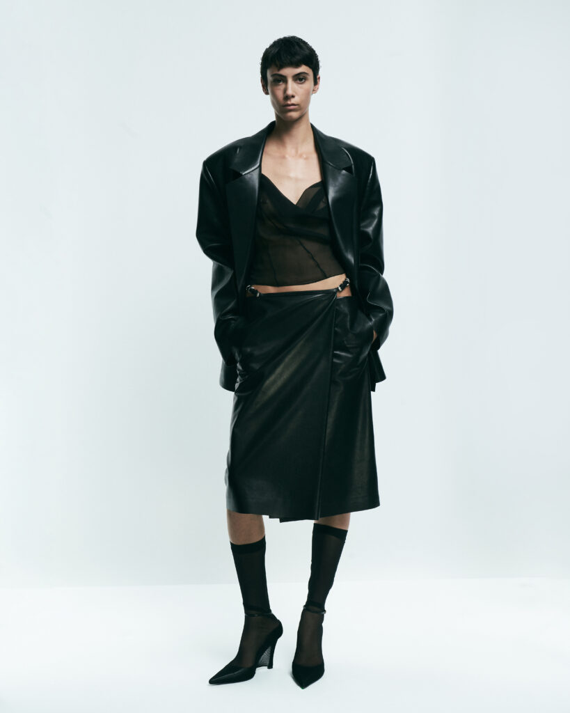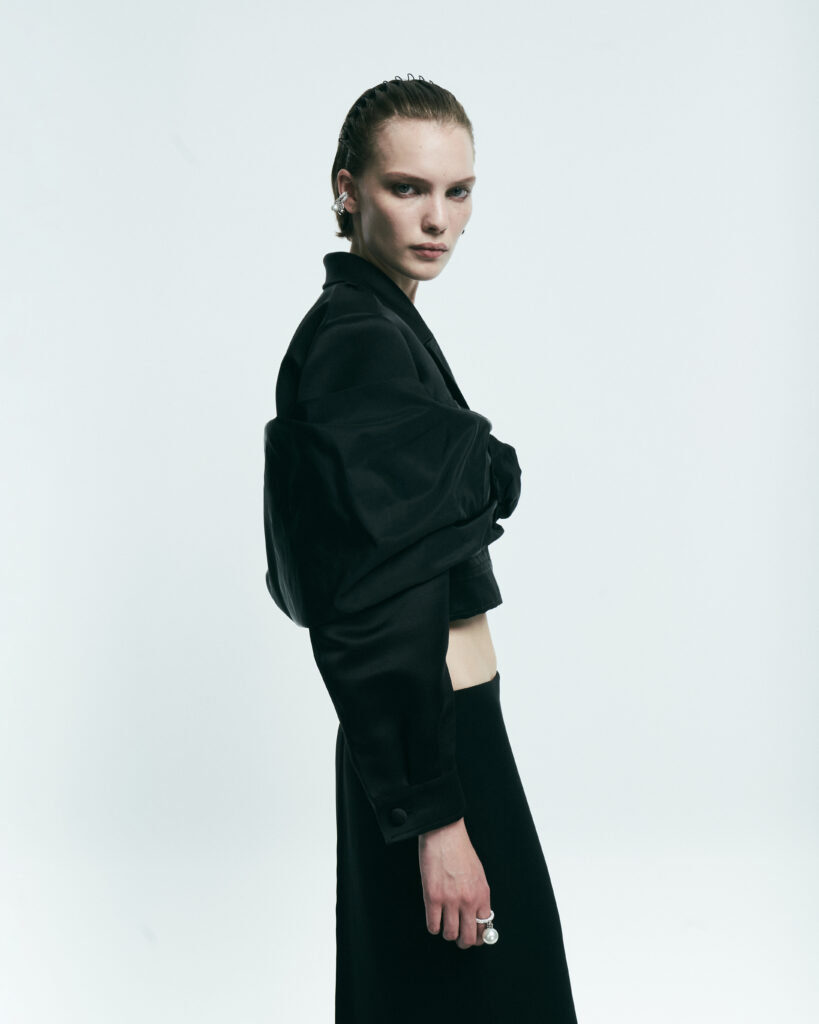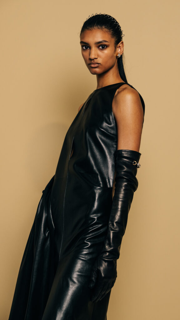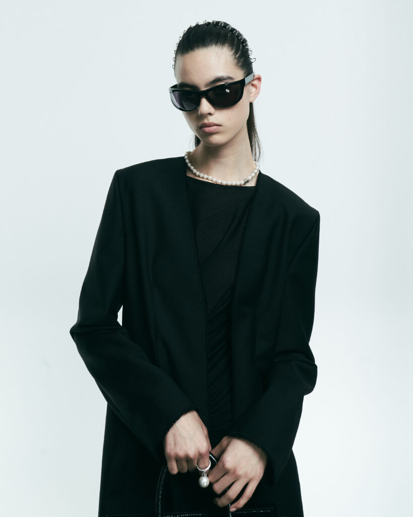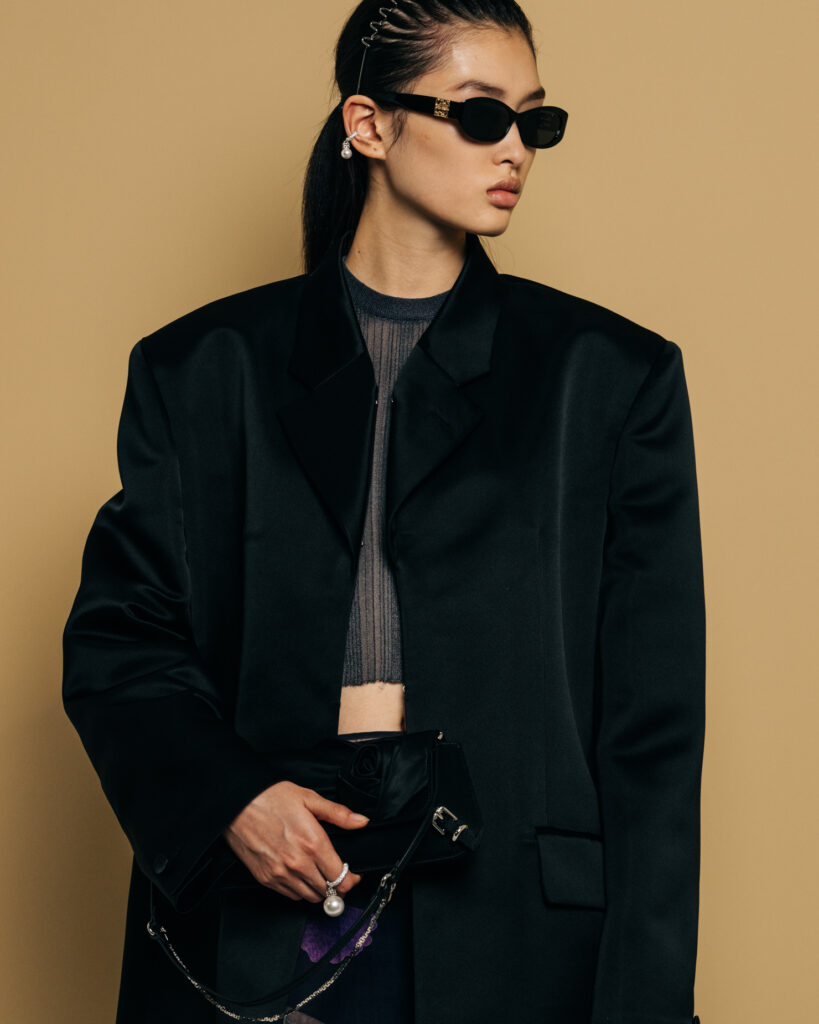La collection révèle un dialogue entre le rigide et le détendu, où la taille architectonique et les tissus de laine raffinée sont façonnés avec des courbes en demi-lune. Les dos ouverts plongeants ou ailés des vestes et des robes rappellent la langue de la haute couture, tandis que des blazers double boutonnage doucement structurés créent une silhouette enveloppante.