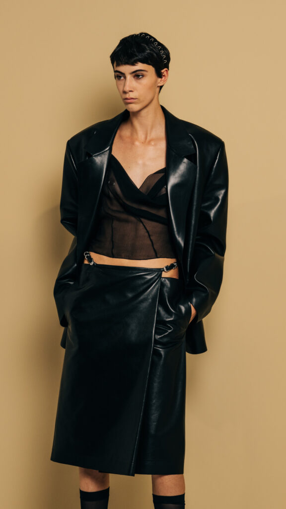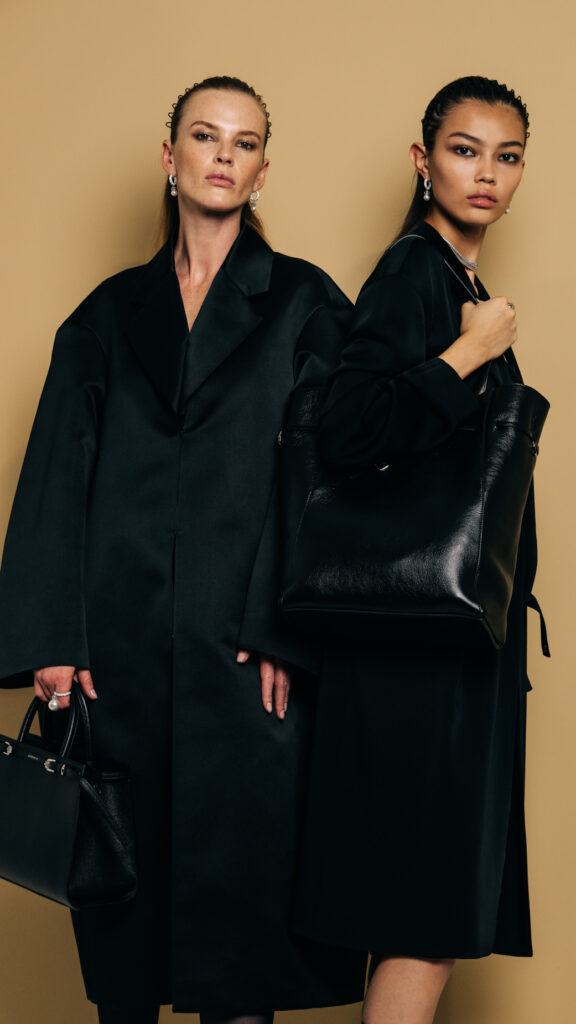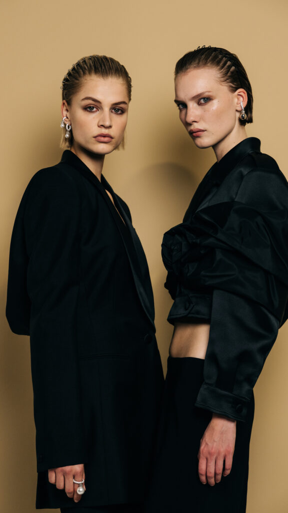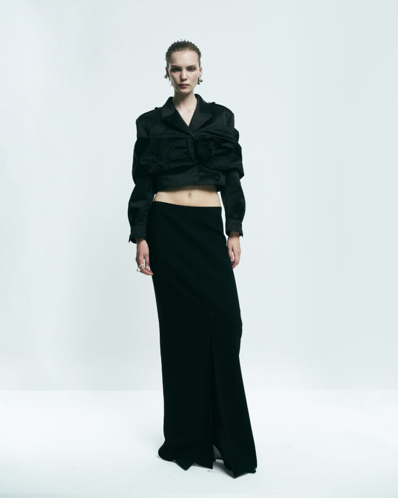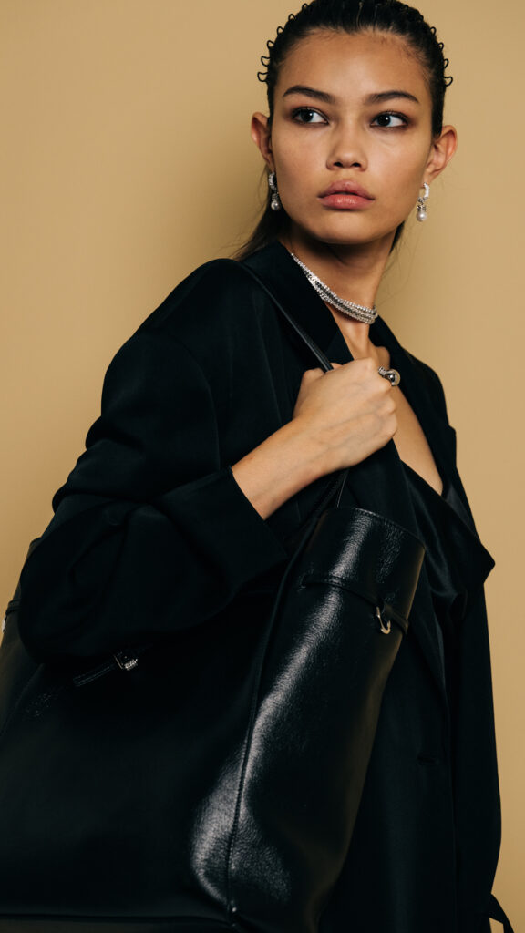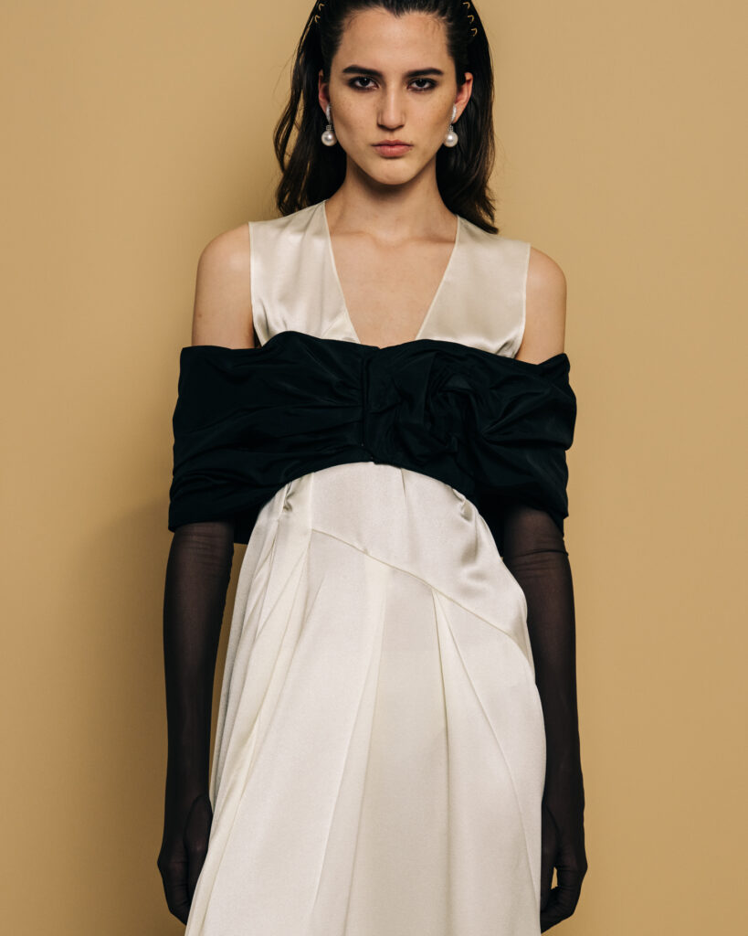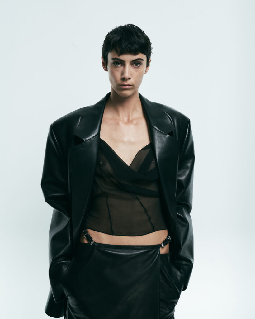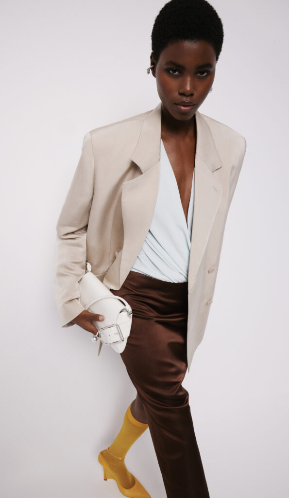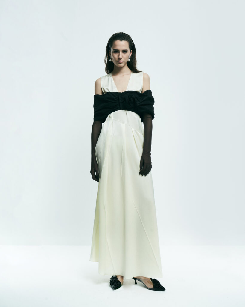 La collection révèle un dialogue entre le rigide et le détendu, où la taille architectonique et les tissus de laine raffinée sont façonnés avec des courbes en demi-lune. Les dos ouverts plongeants ou ailés des vestes et des robes rappellent la langue de la haute couture, tandis que des blazers double boutonnage doucement structurés créent une silhouette enveloppante.