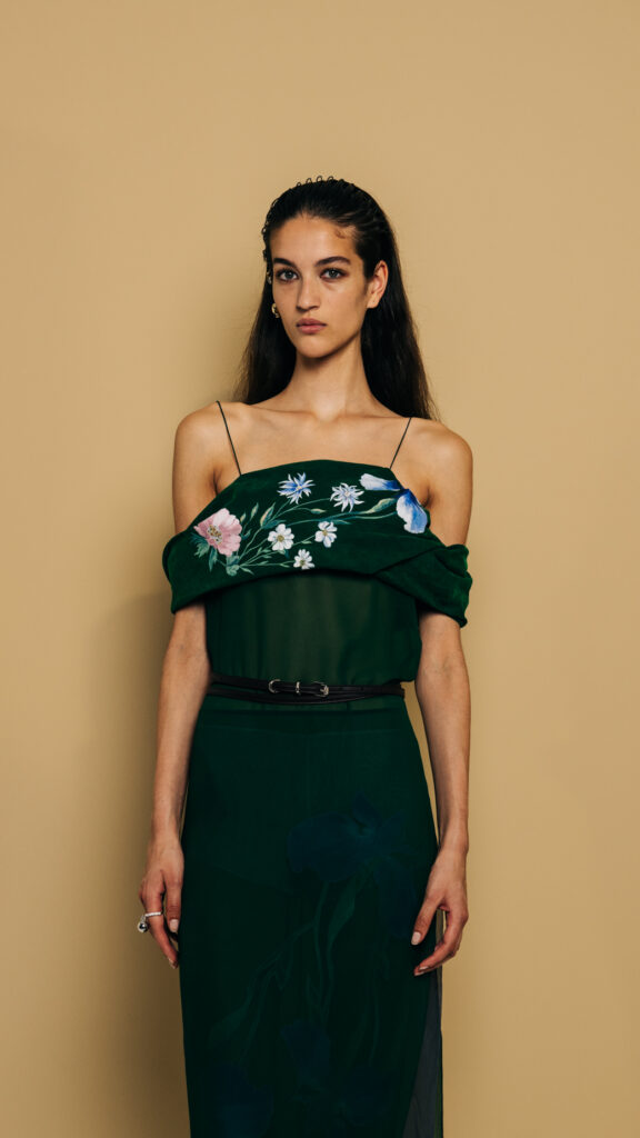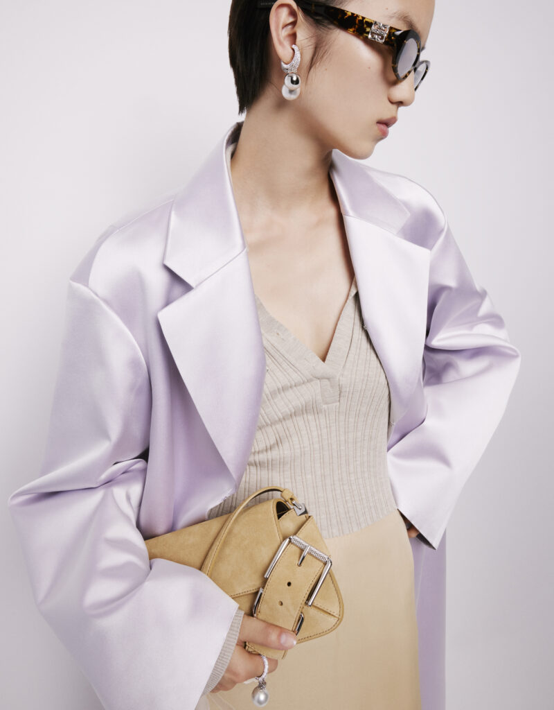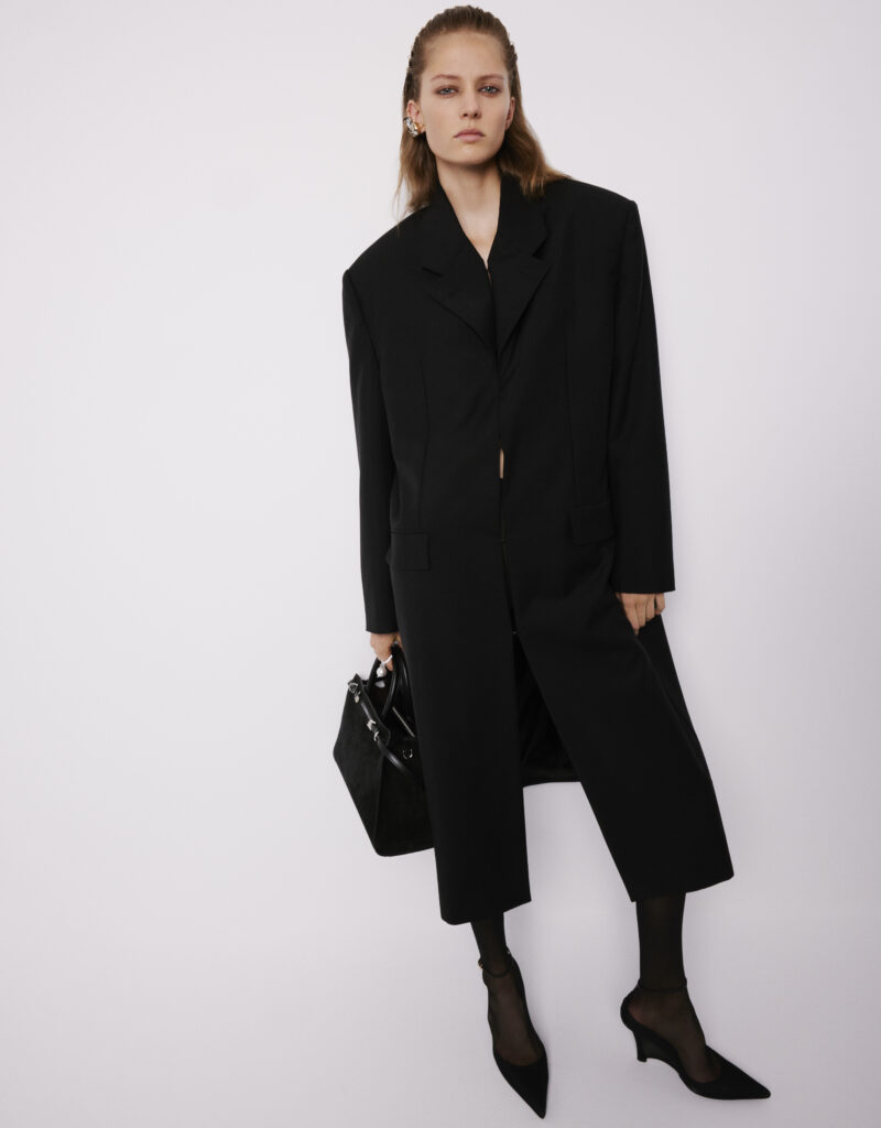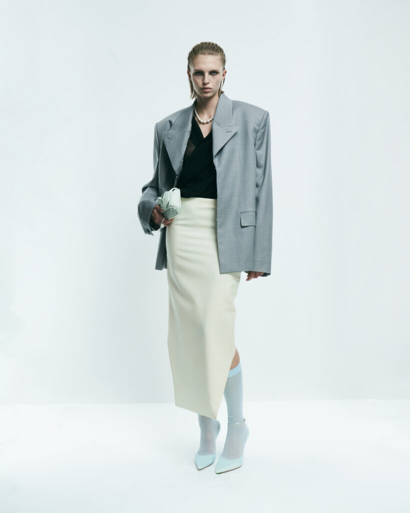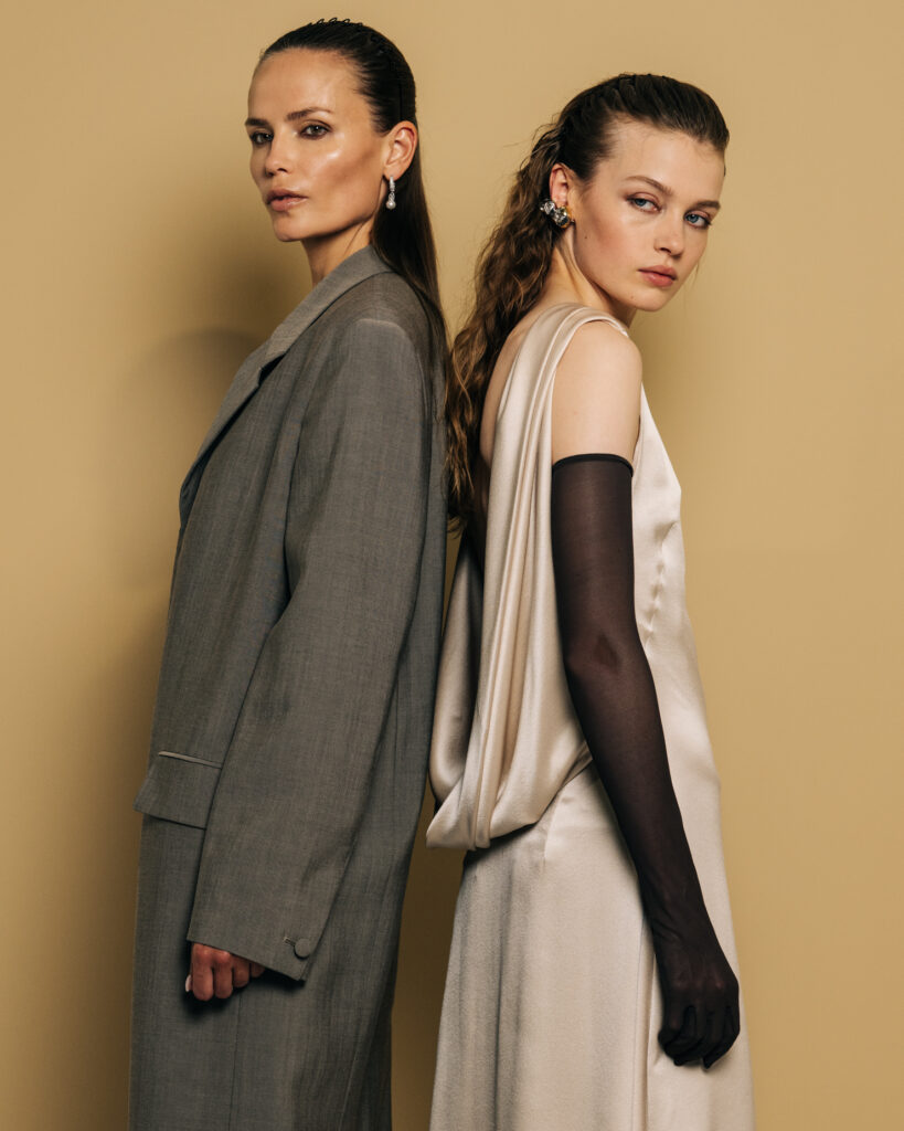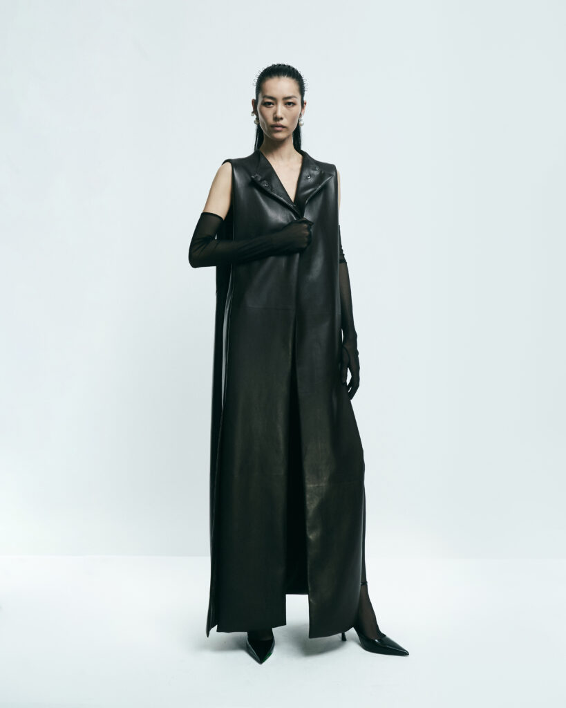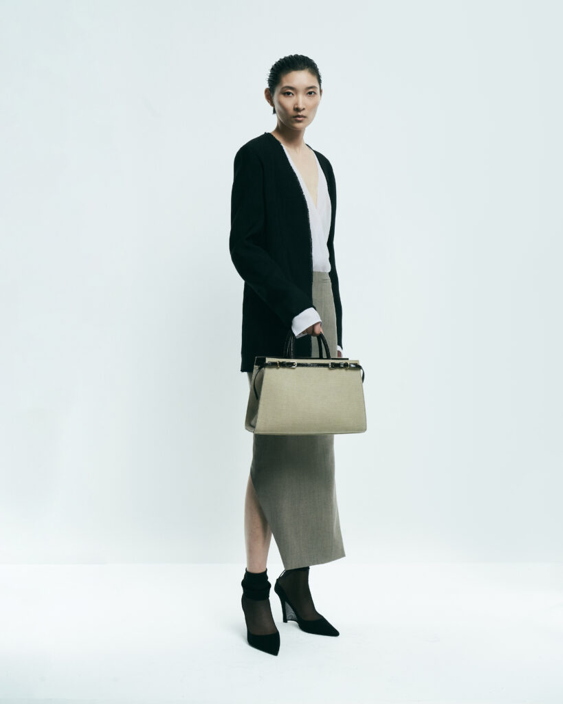 La collection révèle un dialogue entre le rigide et le détendu, où la taille architectonique et les tissus de laine raffinée sont façonnés avec des courbes en demi-lune. Les dos ouverts plongeants ou ailés des vestes et des robes rappellent la langue de la haute couture, tandis que des blazers double boutonnage doucement structurés créent une silhouette enveloppante.