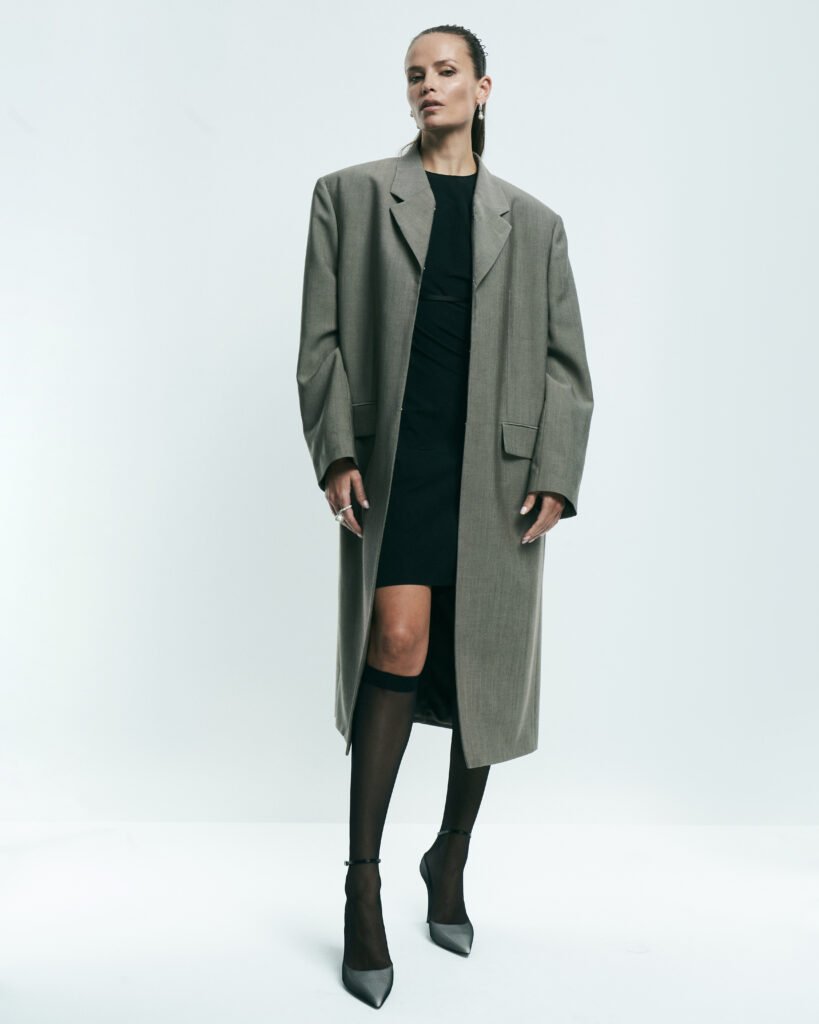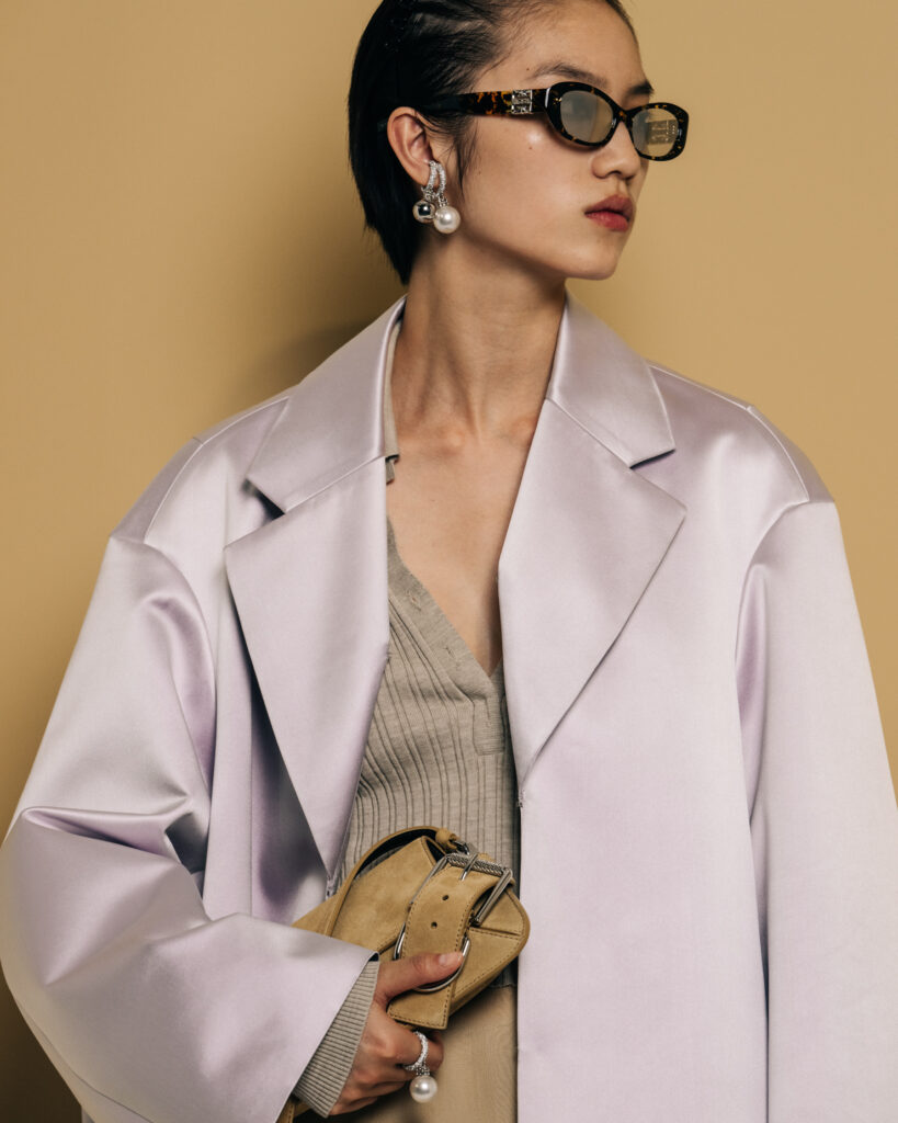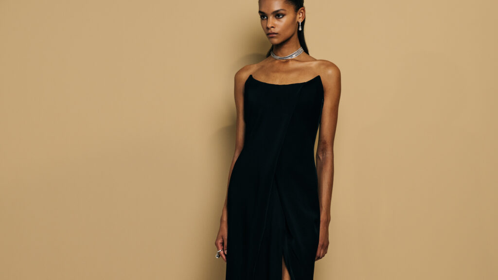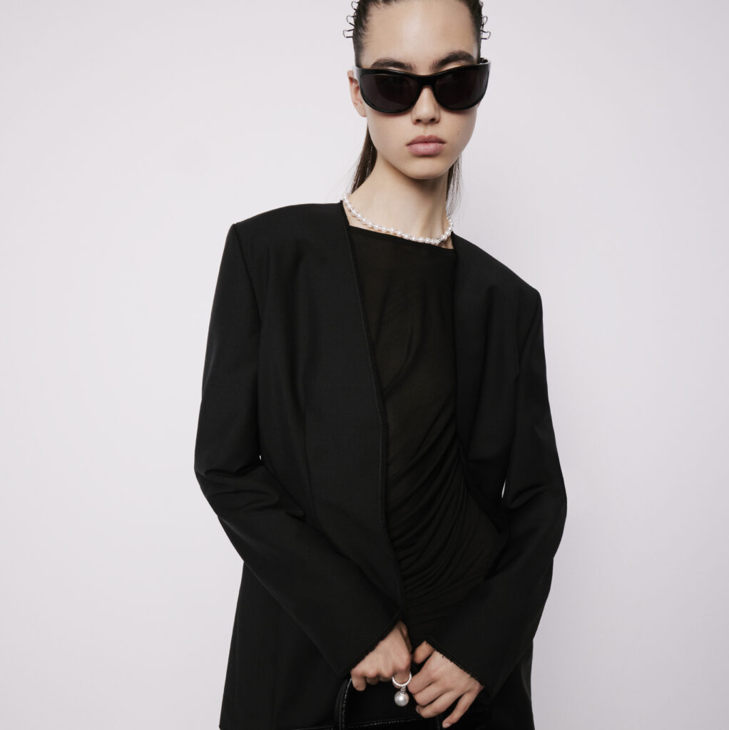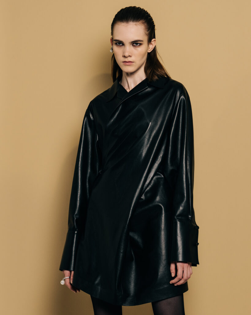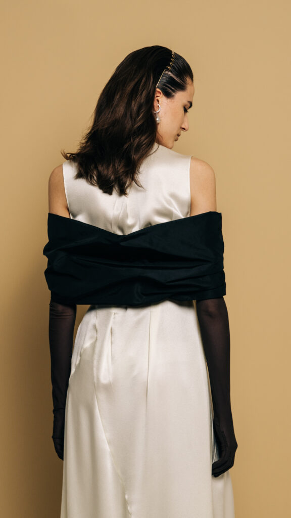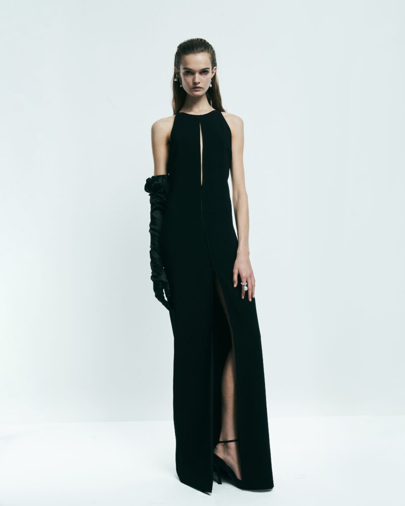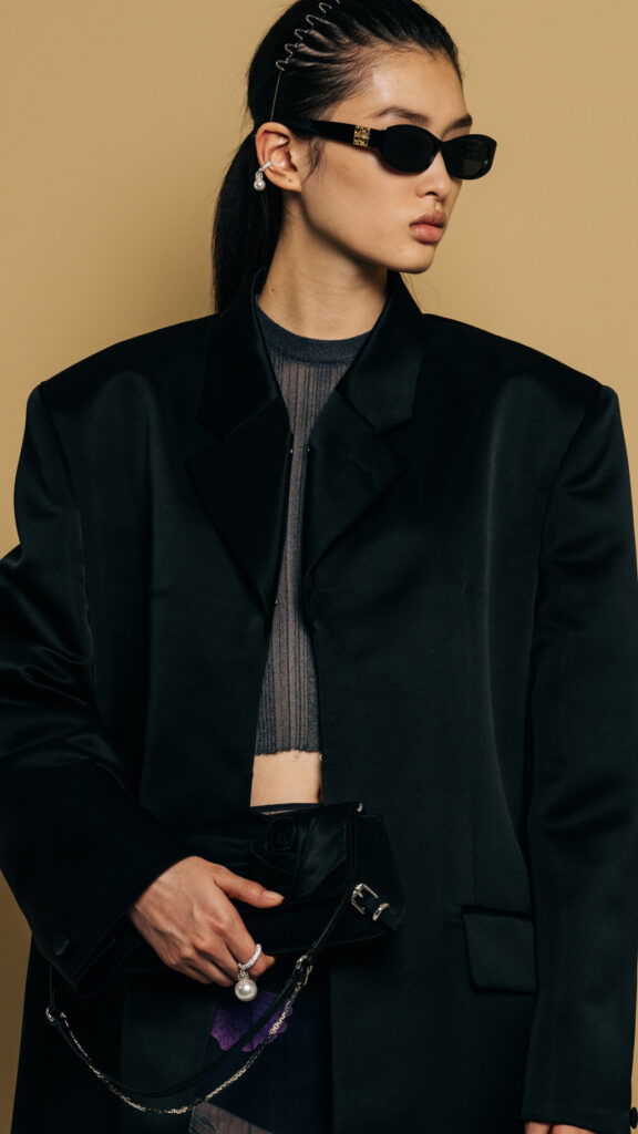 La collection révèle un dialogue entre le rigide et le détendu, où la taille architectonique et les tissus de laine raffinée sont façonnés avec des courbes en demi-lune. Les dos ouverts plongeants ou ailés des vestes et des robes rappellent la langue de la haute couture, tandis que des blazers double boutonnage doucement structurés créent une silhouette enveloppante.