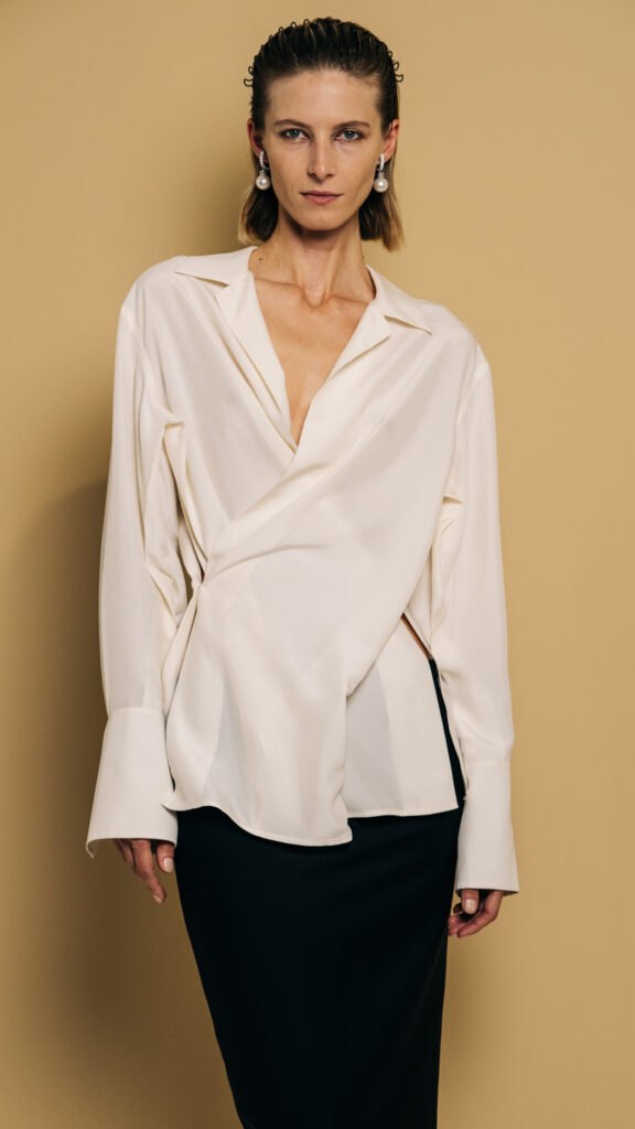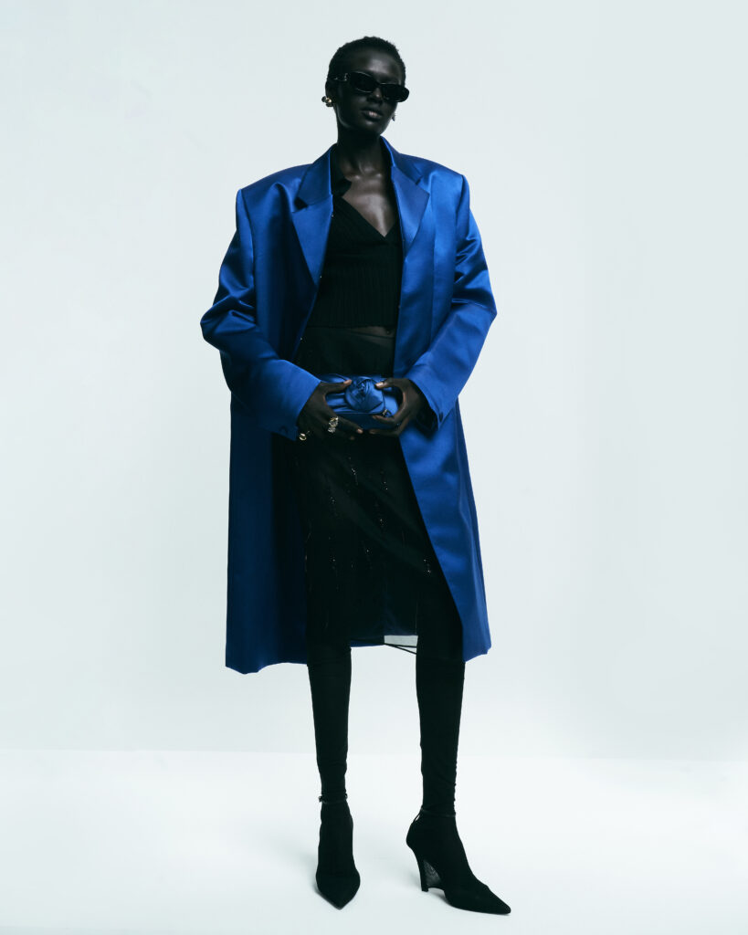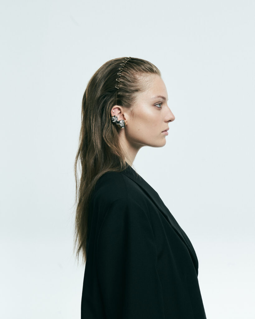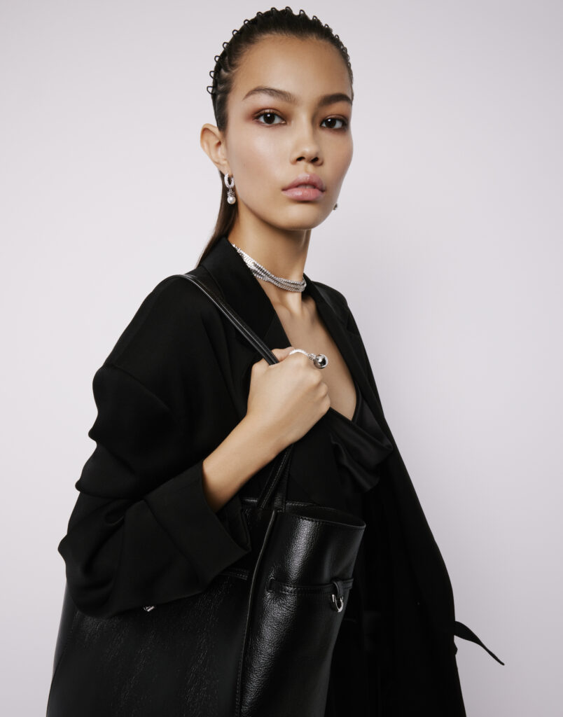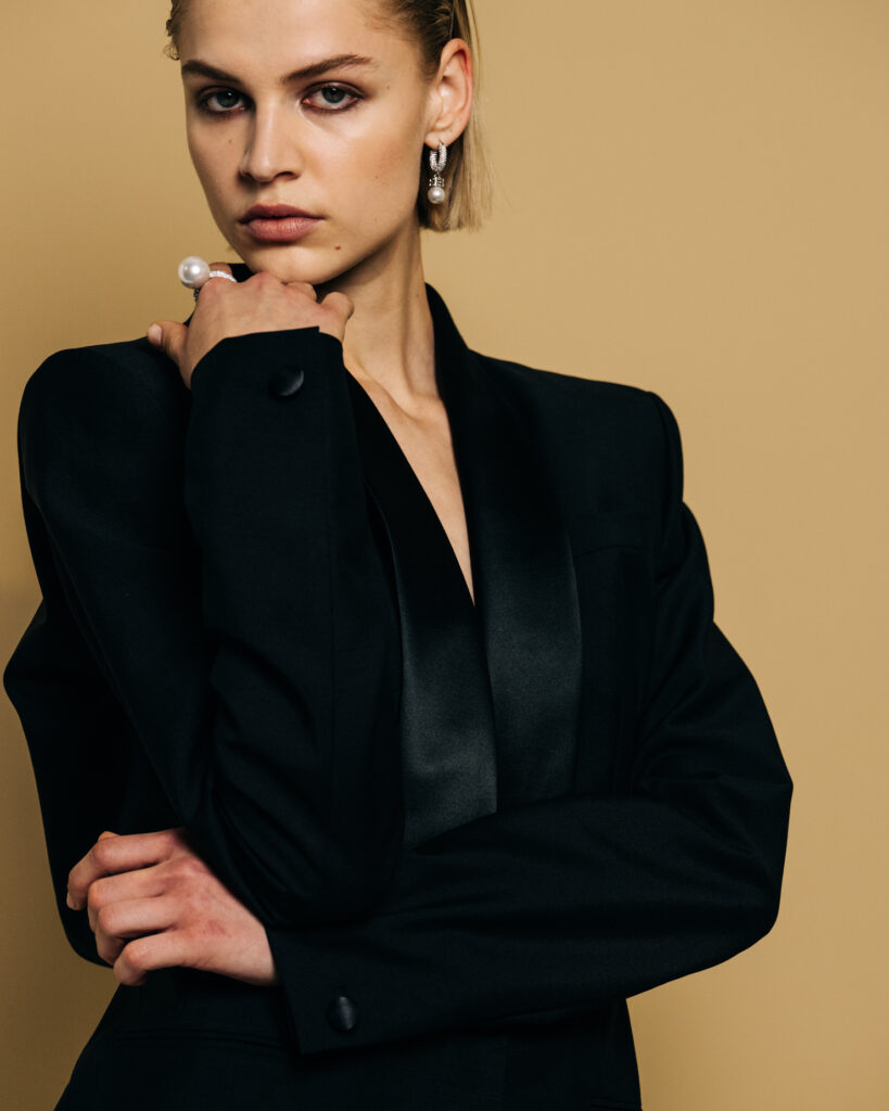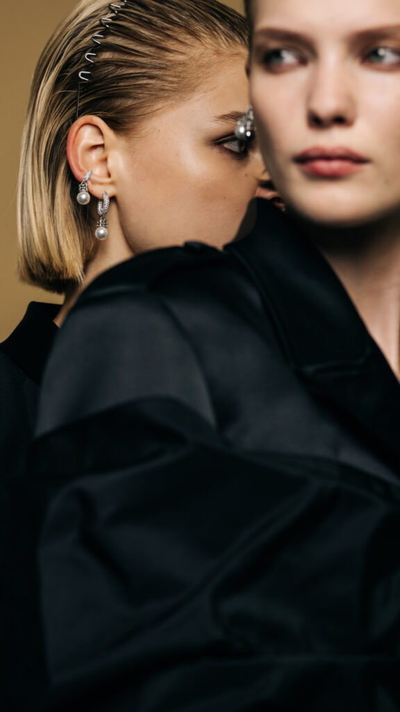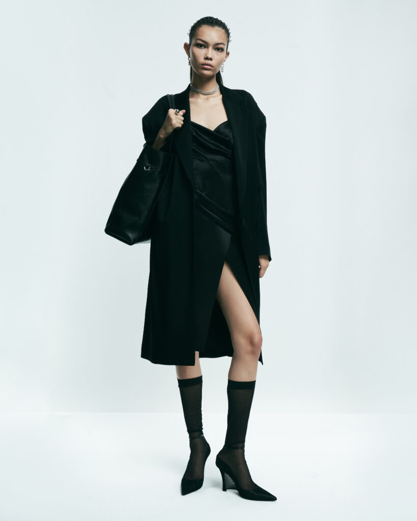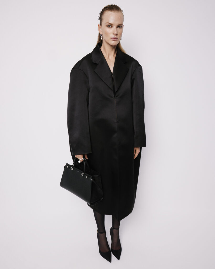 La collection révèle un dialogue entre le rigide et le détendu, où la taille architectonique et les tissus de laine raffinée sont façonnés avec des courbes en demi-lune. Les dos ouverts plongeants ou ailés des vestes et des robes rappellent la langue de la haute couture, tandis que des blazers double boutonnage doucement structurés créent une silhouette enveloppante.