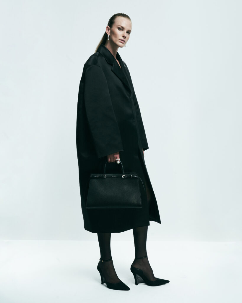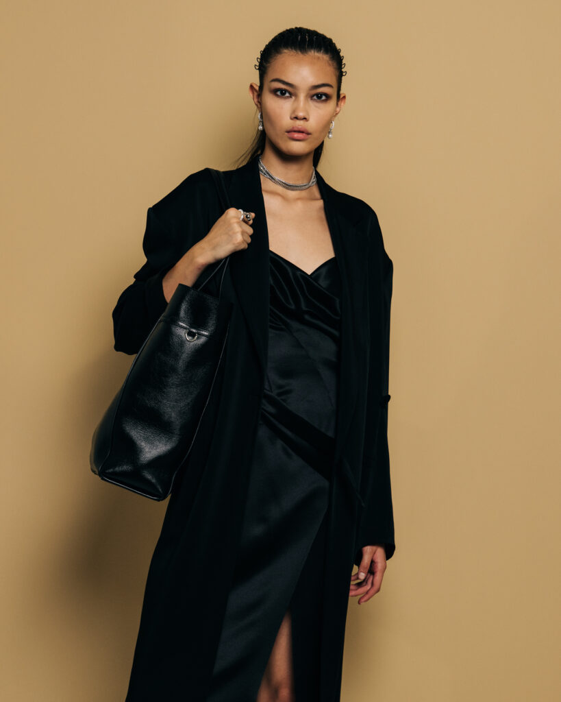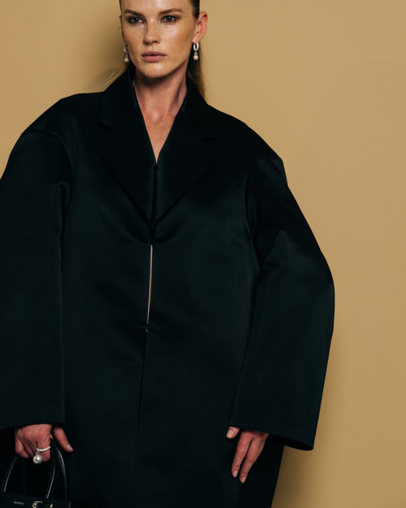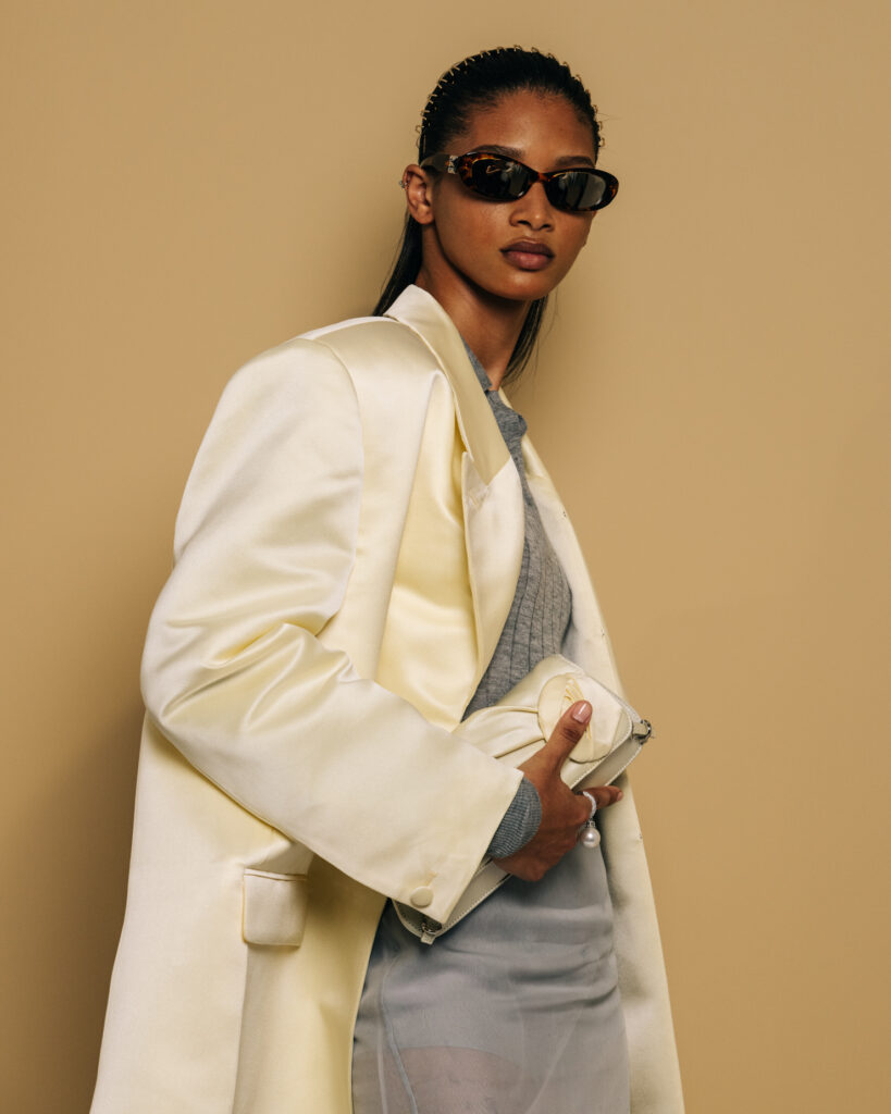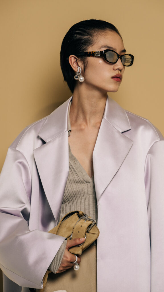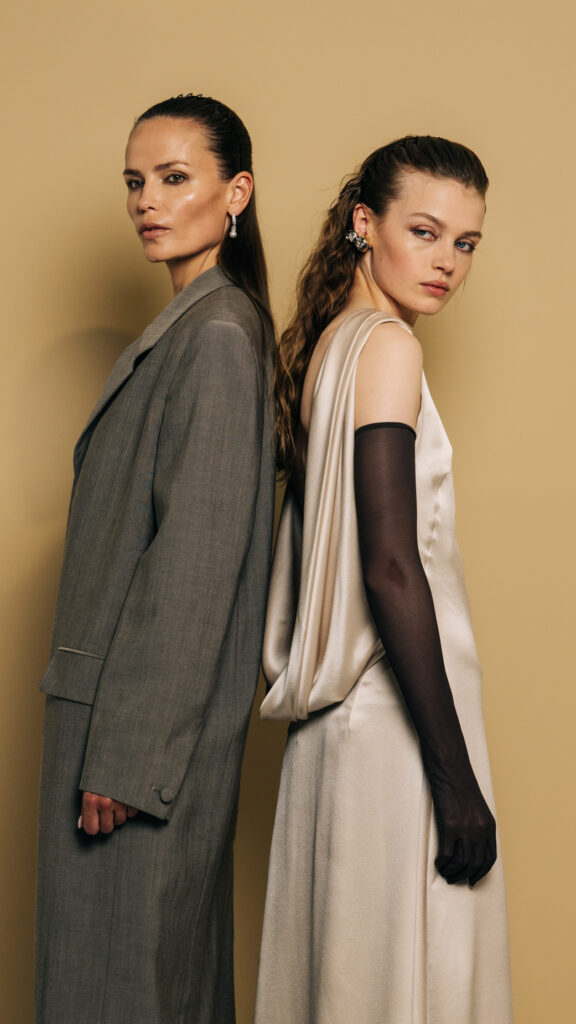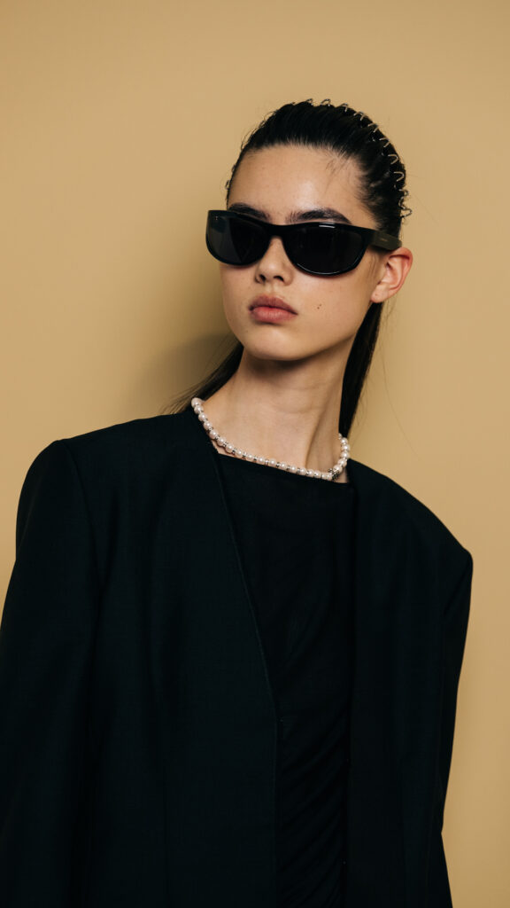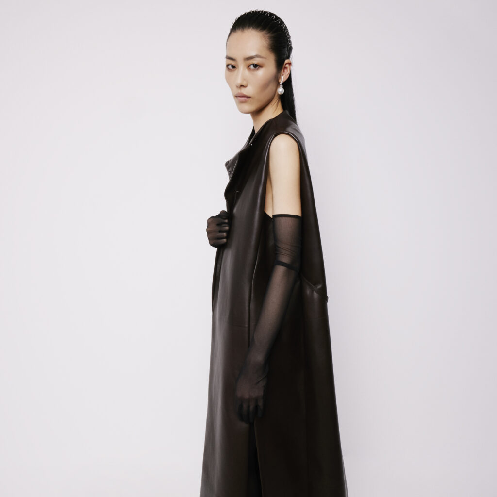 La collection révèle un dialogue entre le rigide et le détendu, où la taille architectonique et les tissus de laine raffinée sont façonnés avec des courbes en demi-lune. Les dos ouverts plongeants ou ailés des vestes et des robes rappellent la langue de la haute couture, tandis que des blazers double boutonnage doucement structurés créent une silhouette enveloppante.