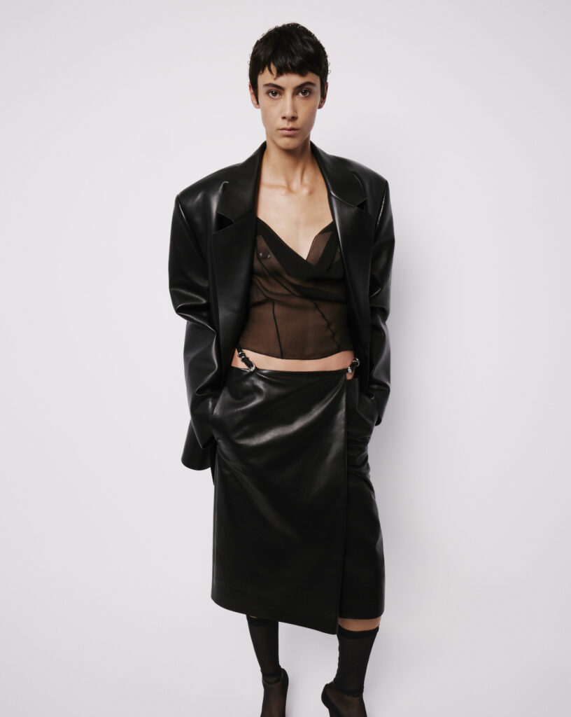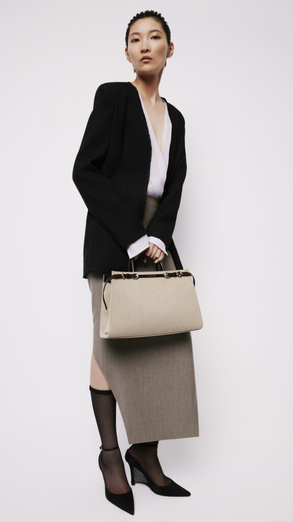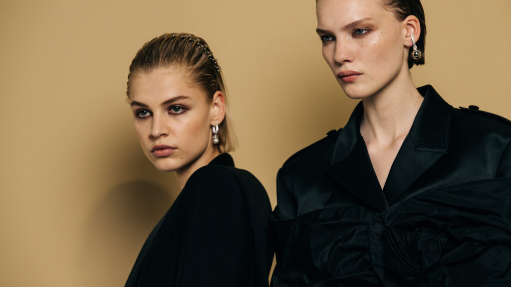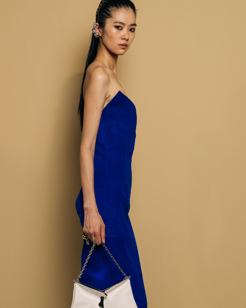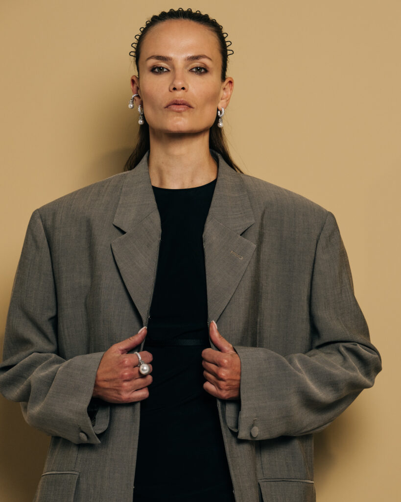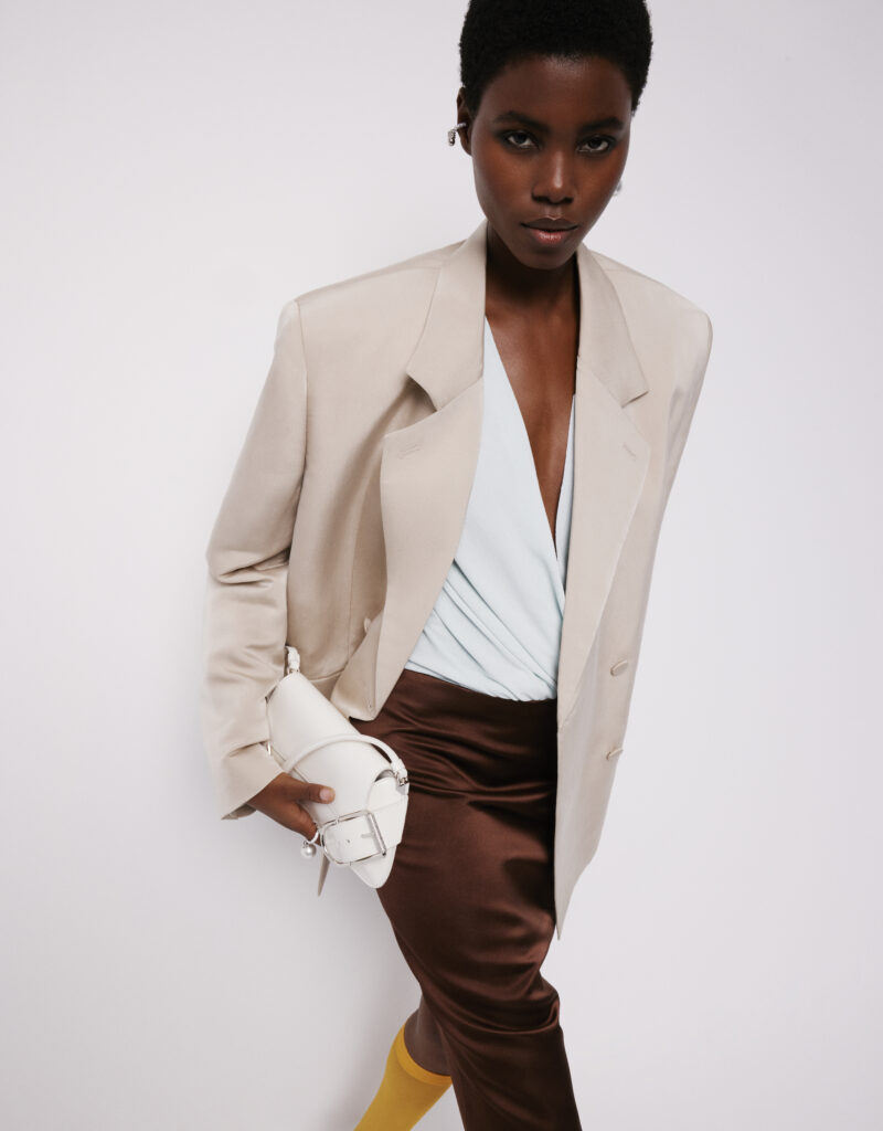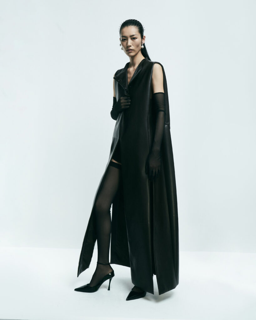La collection révèle un dialogue entre le rigide et le détendu, où la taille architectonique et les tissus de laine raffinée sont façonnés avec des courbes en demi-lune. Les dos ouverts plongeants ou ailés des vestes et des robes rappellent la langue de la haute couture, tandis que des blazers double boutonnage doucement structurés créent une silhouette enveloppante.