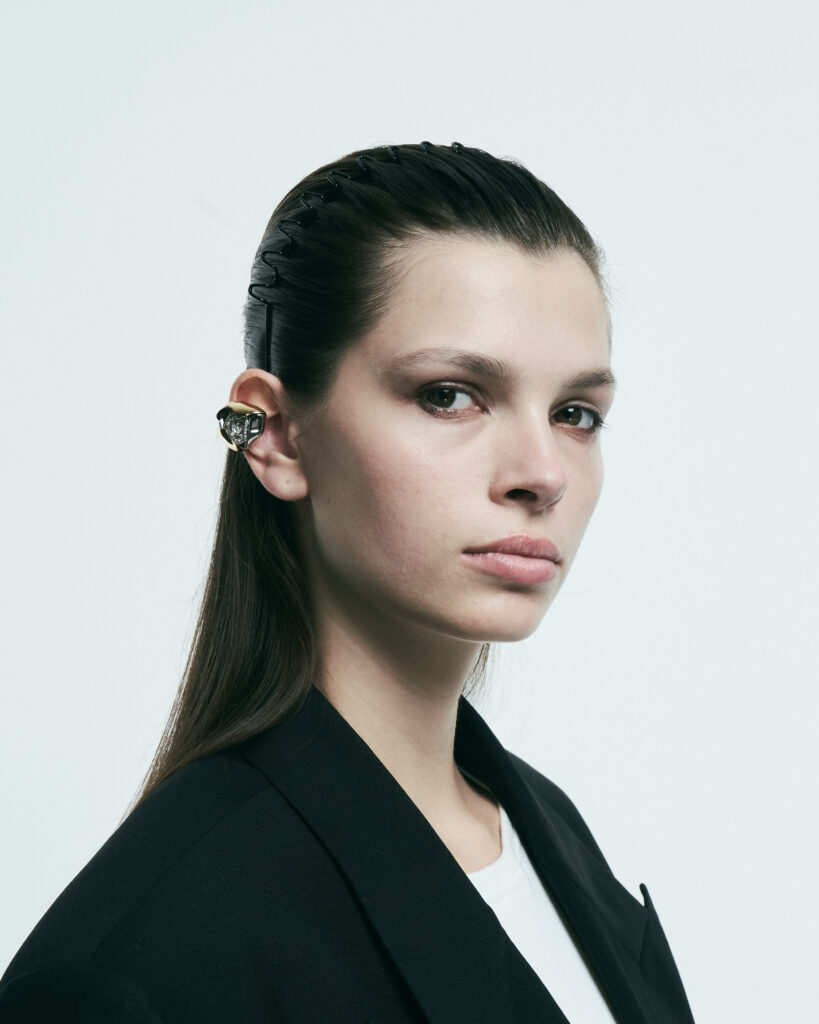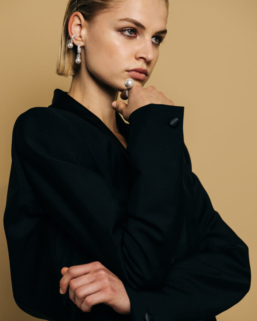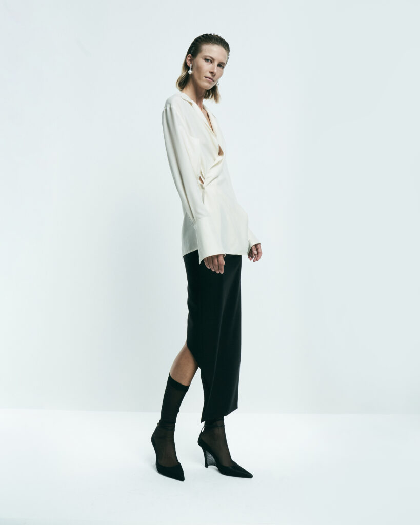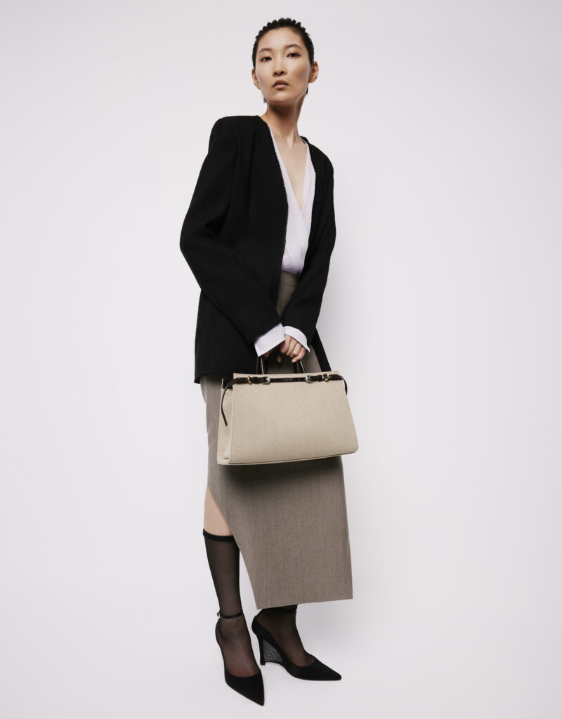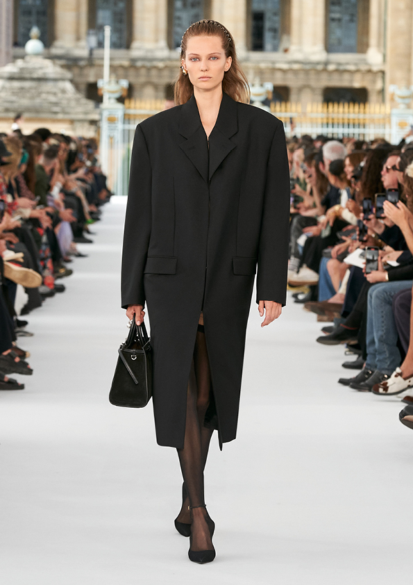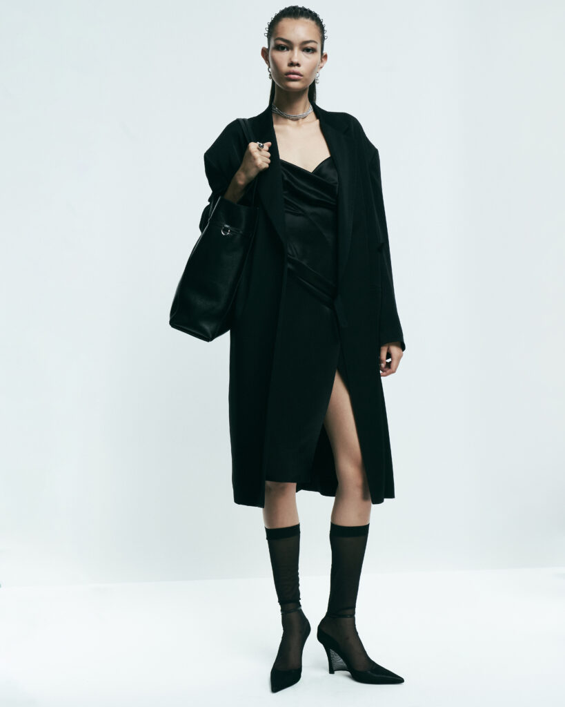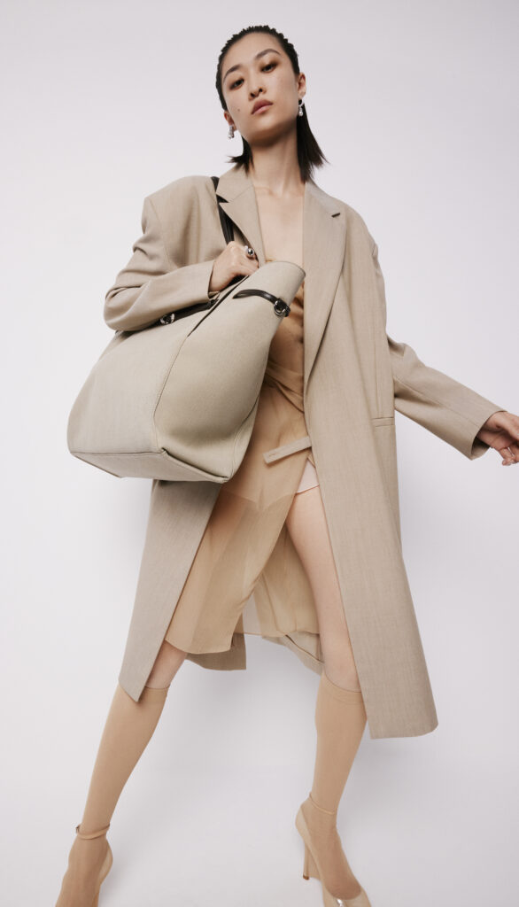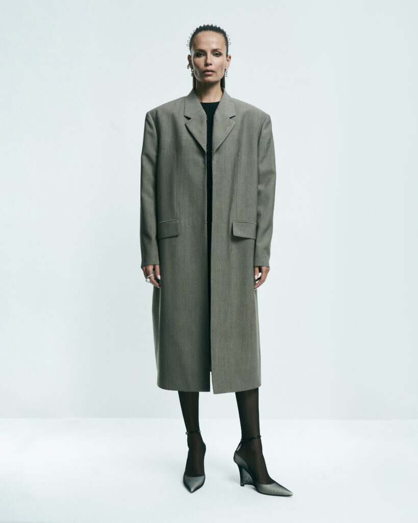 La collection révèle un dialogue entre le rigide et le détendu, où la taille architectonique et les tissus de laine raffinée sont façonnés avec des courbes en demi-lune. Les dos ouverts plongeants ou ailés des vestes et des robes rappellent la langue de la haute couture, tandis que des blazers double boutonnage doucement structurés créent une silhouette enveloppante.