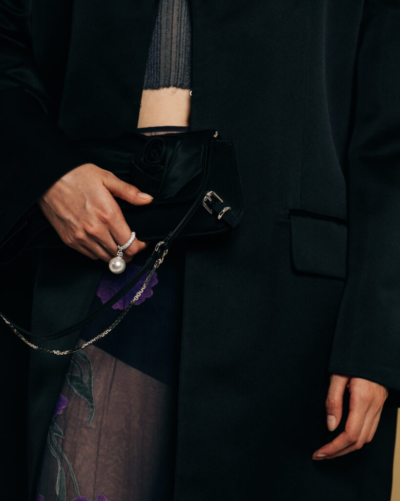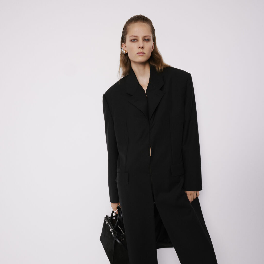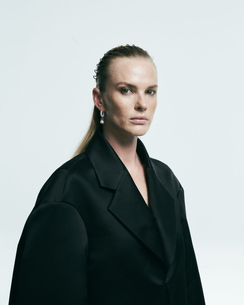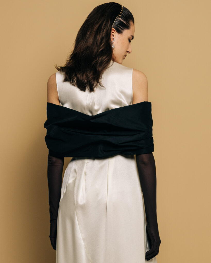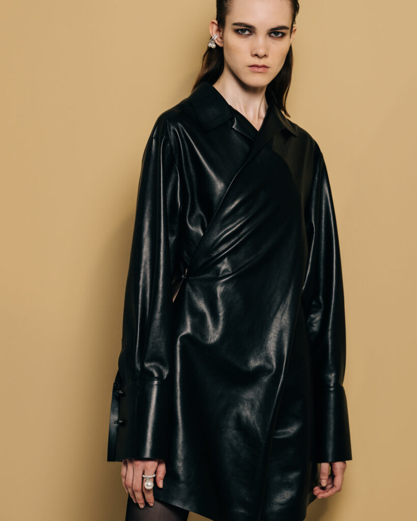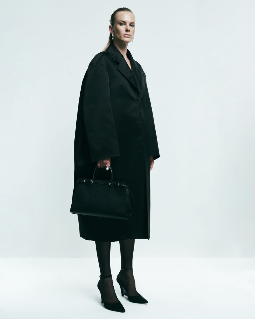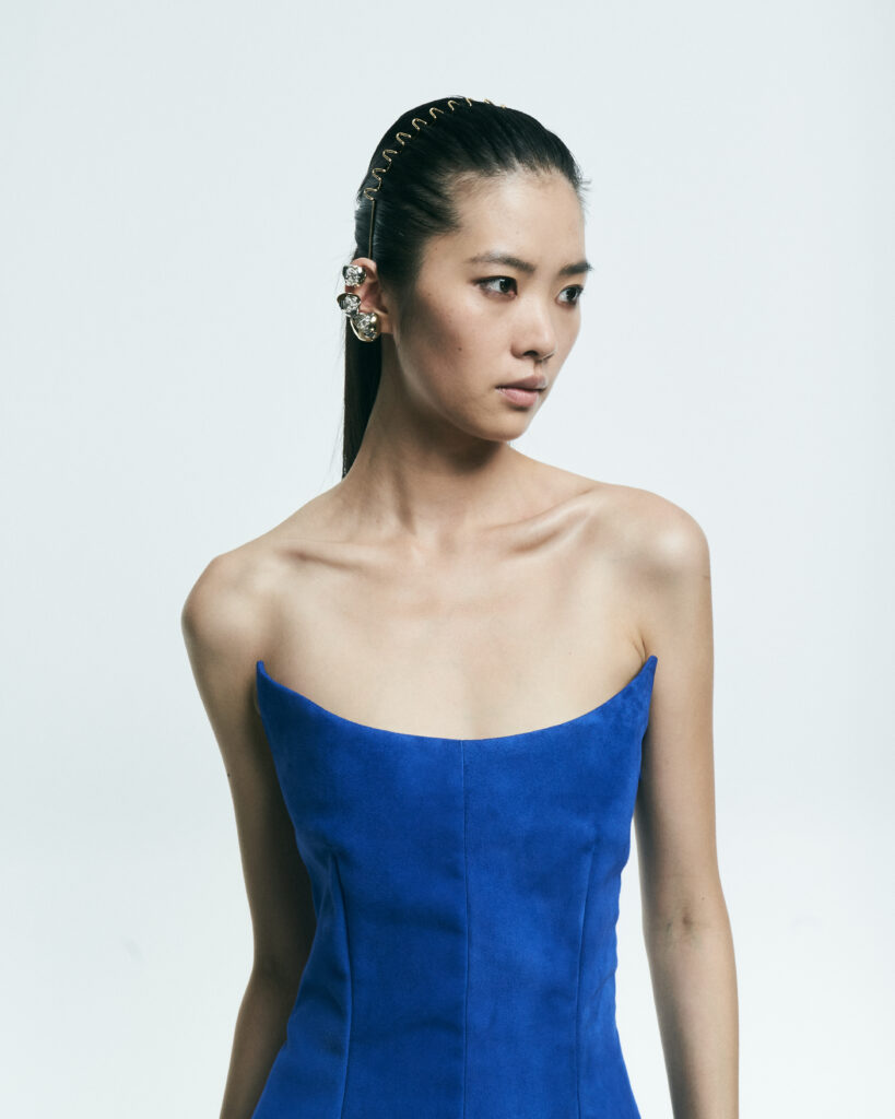 La collection révèle un dialogue entre le rigide et le détendu, où la taille architectonique et les tissus de laine raffinée sont façonnés avec des courbes en demi-lune. Les dos ouverts plongeants ou ailés des vestes et des robes rappellent la langue de la haute couture, tandis que des blazers double boutonnage doucement structurés créent une silhouette enveloppante.