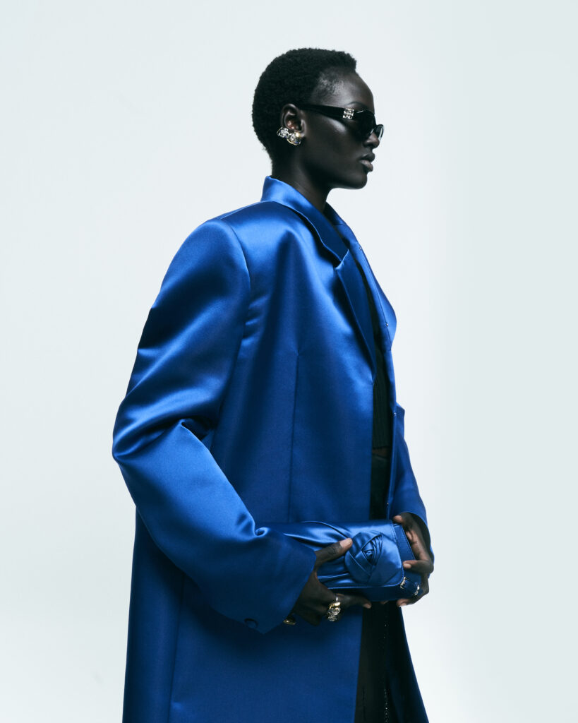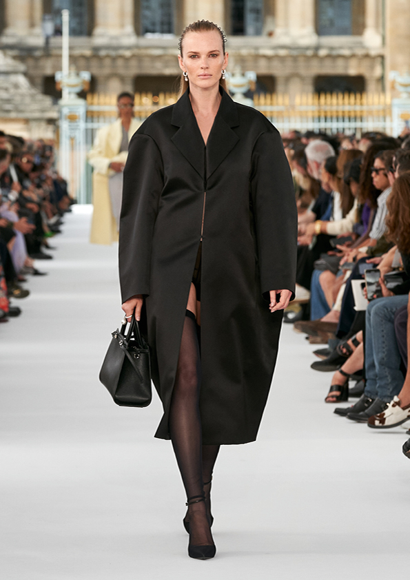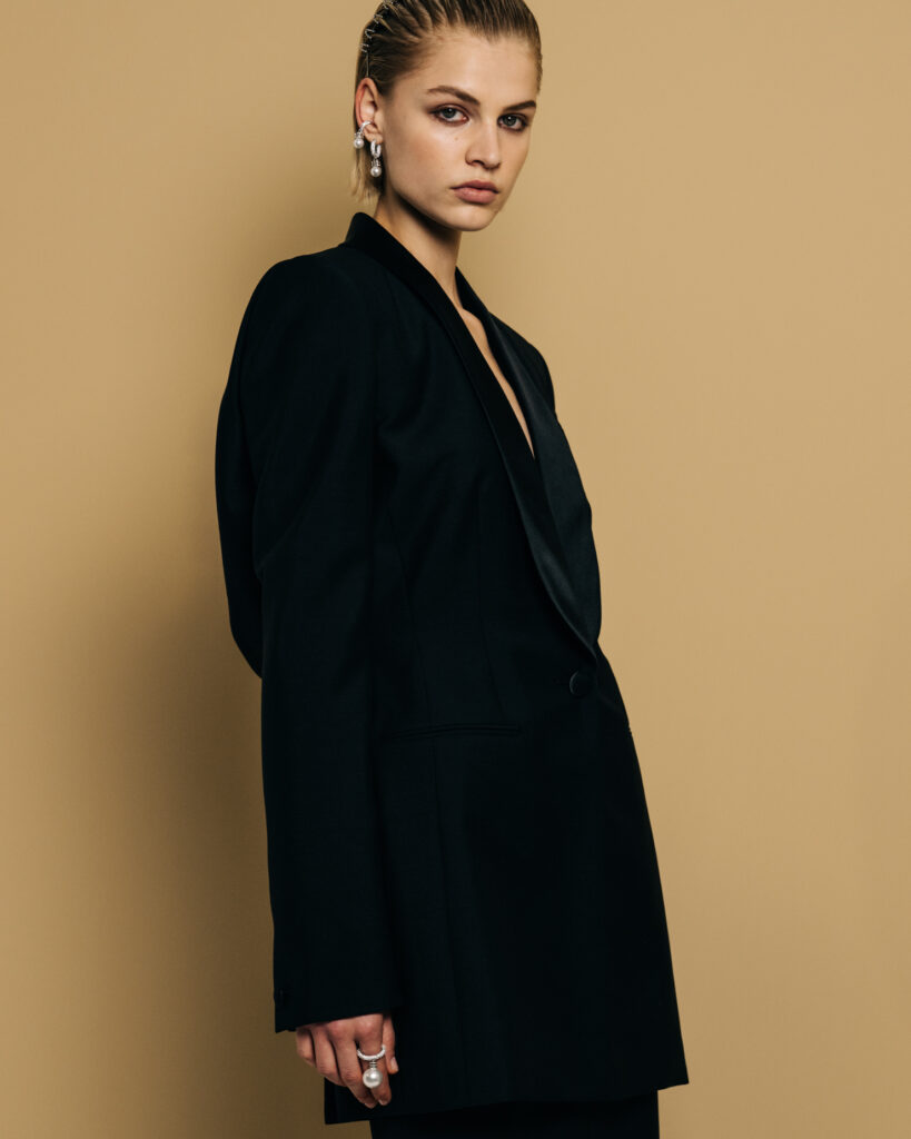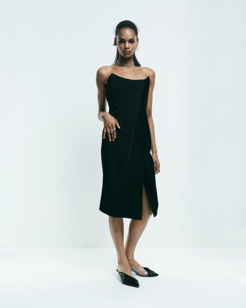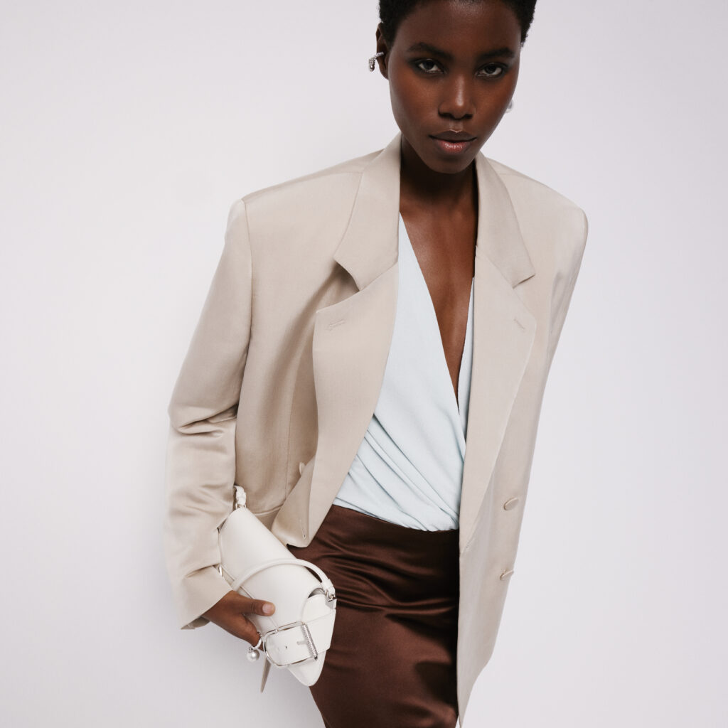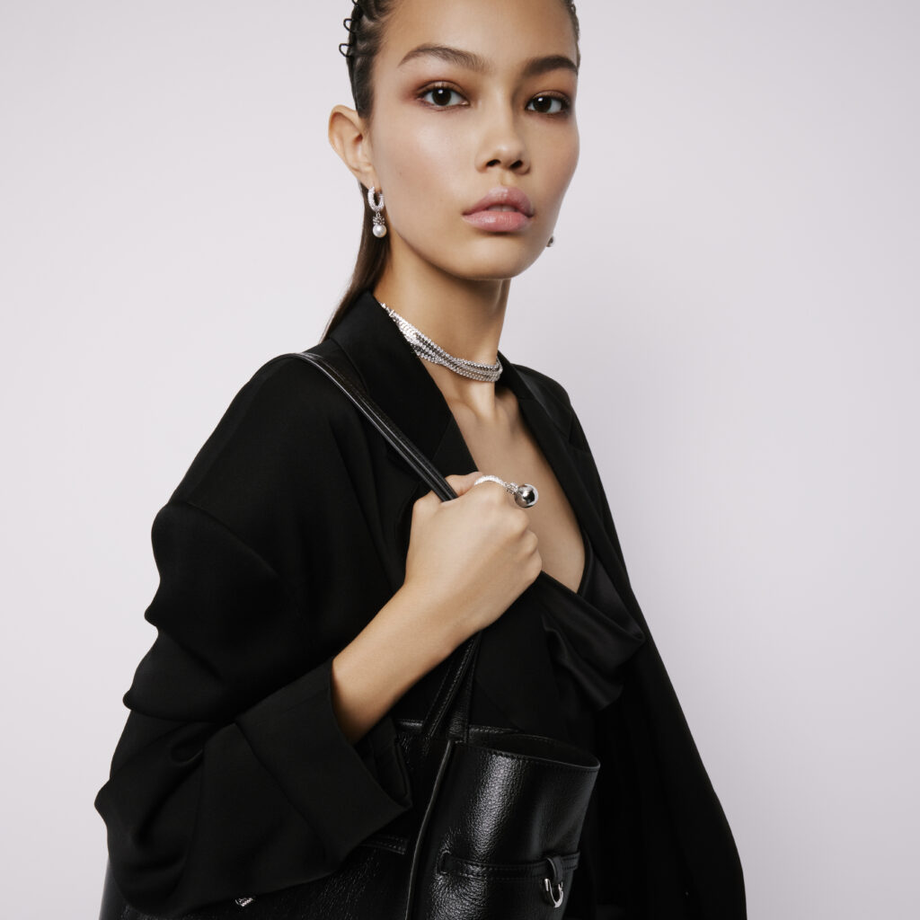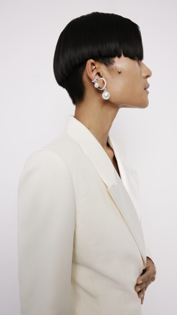 La collection révèle un dialogue entre le rigide et le détendu, où la taille architectonique et les tissus de laine raffinée sont façonnés avec des courbes en demi-lune. Les dos ouverts plongeants ou ailés des vestes et des robes rappellent la langue de la haute couture, tandis que des blazers double boutonnage doucement structurés créent une silhouette enveloppante.