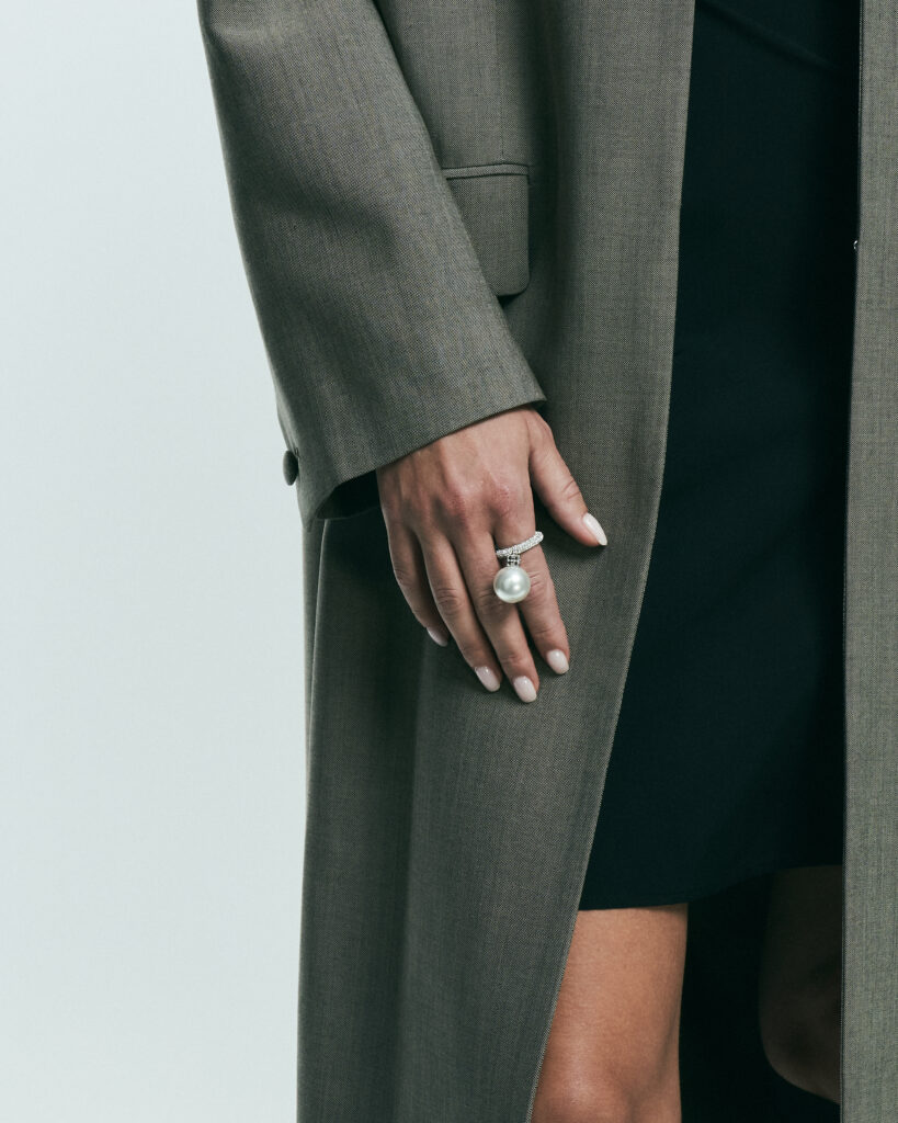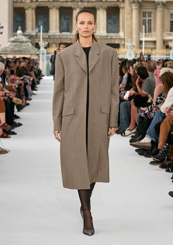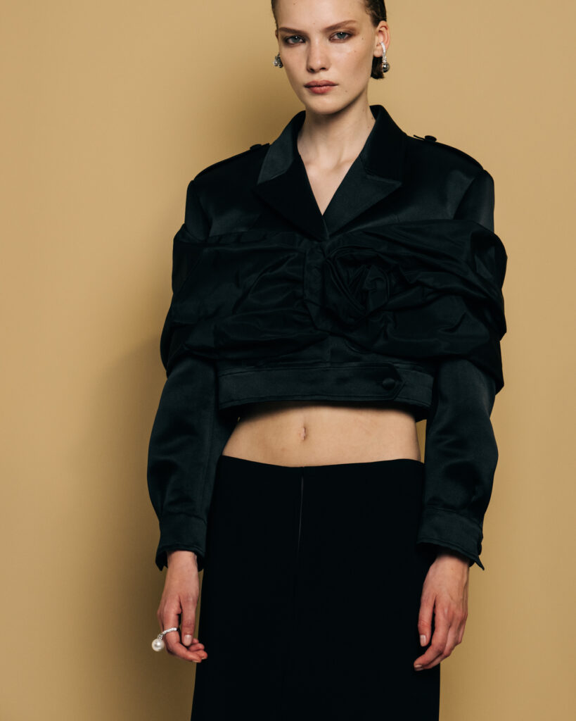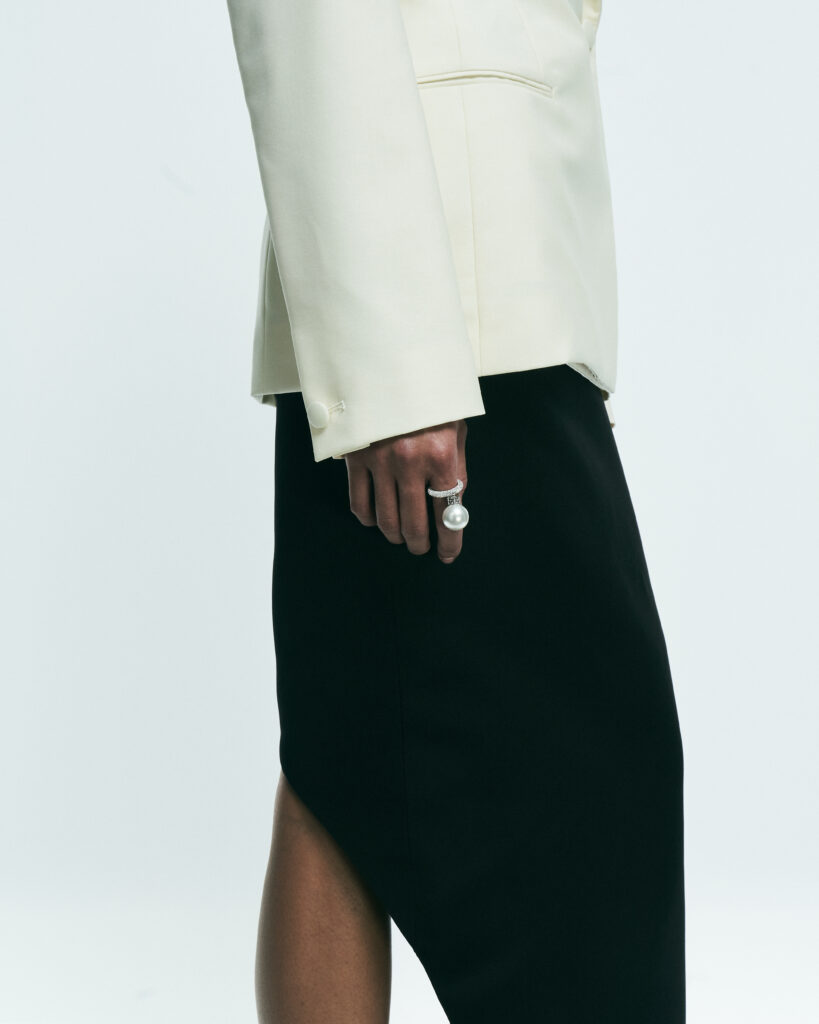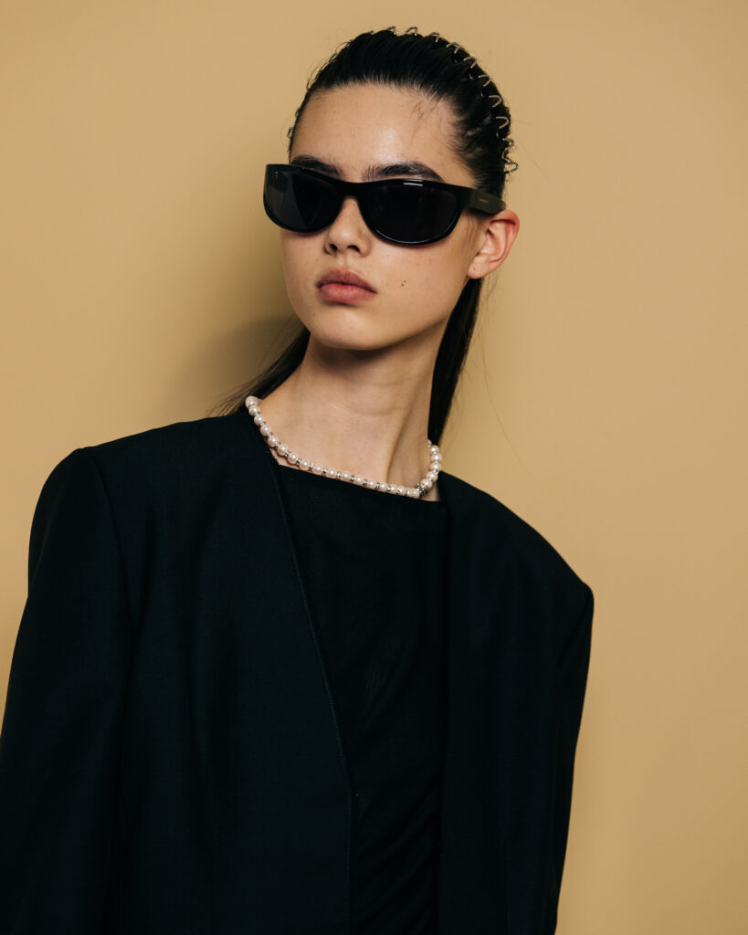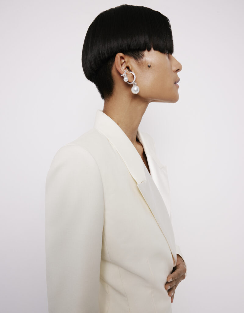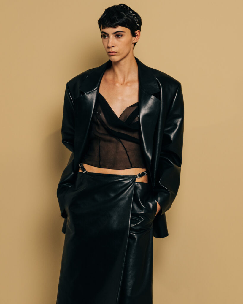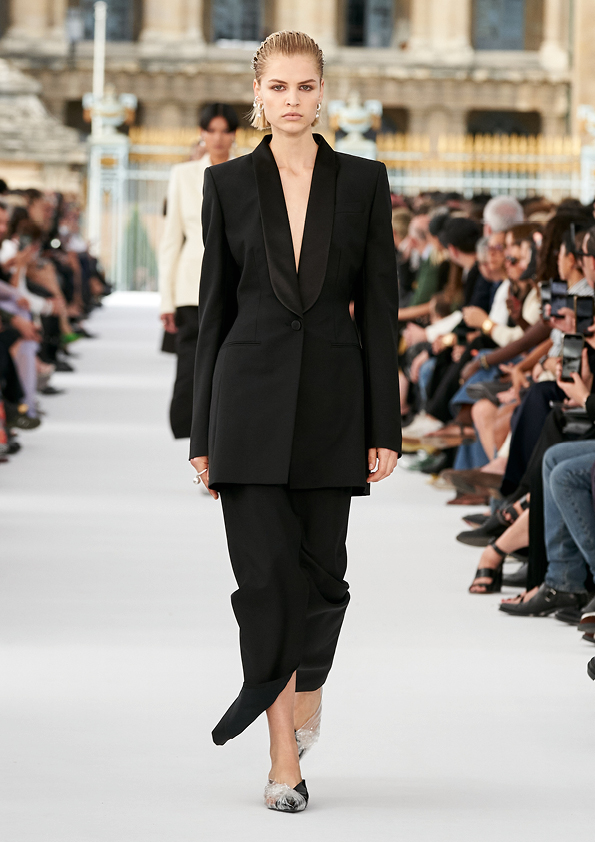 La collection révèle un dialogue entre le rigide et le détendu, où la taille architectonique et les tissus de laine raffinée sont façonnés avec des courbes en demi-lune. Les dos ouverts plongeants ou ailés des vestes et des robes rappellent la langue de la haute couture, tandis que des blazers double boutonnage doucement structurés créent une silhouette enveloppante.