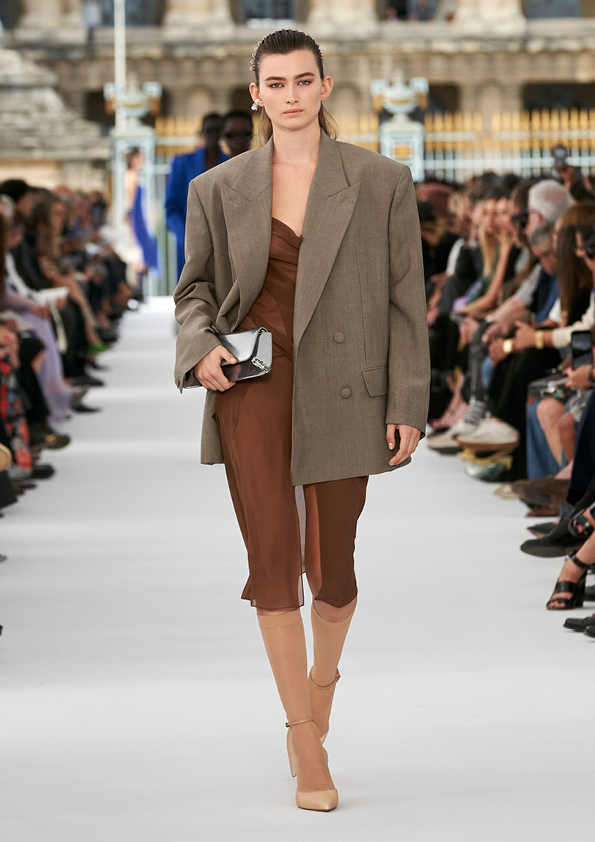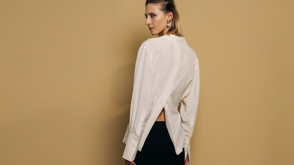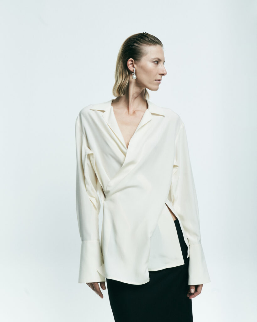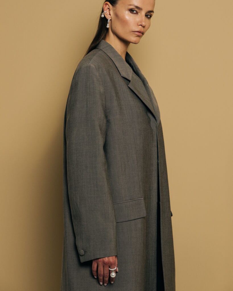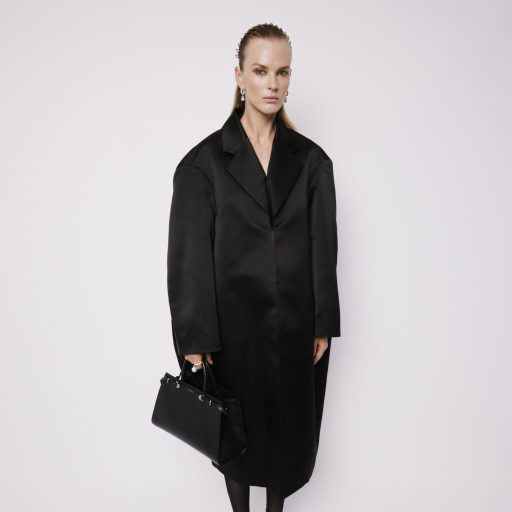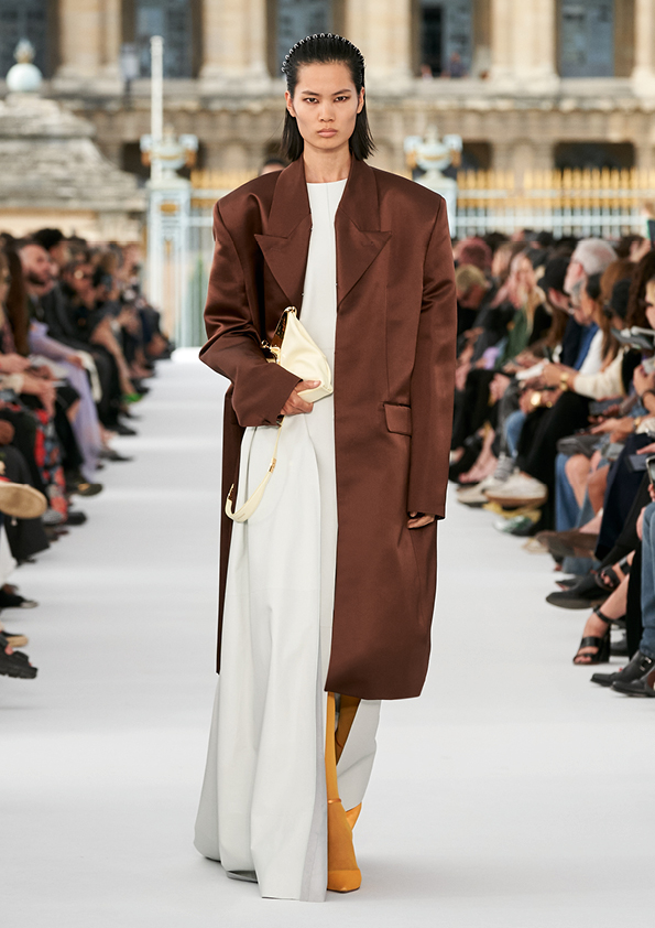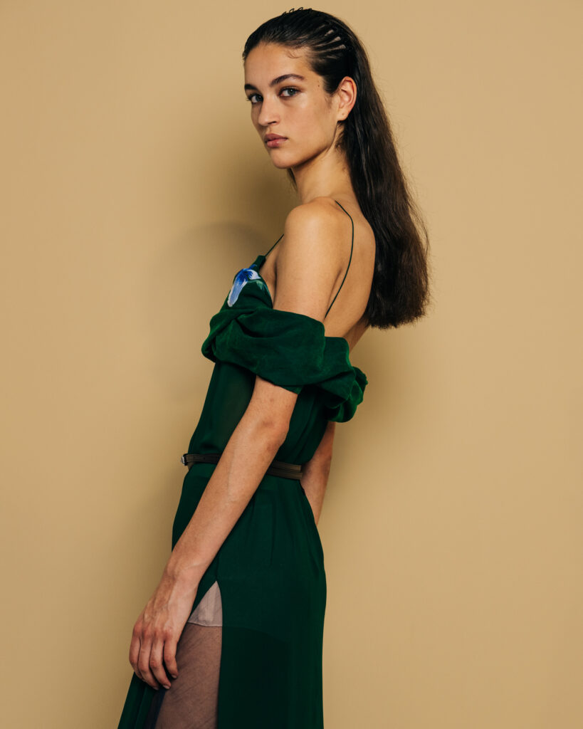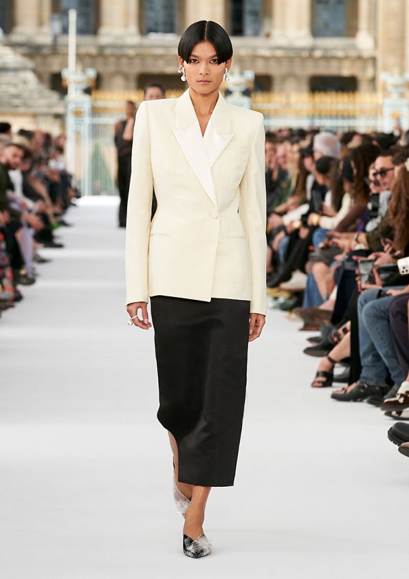 La collection révèle un dialogue entre le rigide et le détendu, où la taille architectonique et les tissus de laine raffinée sont façonnés avec des courbes en demi-lune. Les dos ouverts plongeants ou ailés des vestes et des robes rappellent la langue de la haute couture, tandis que des blazers double boutonnage doucement structurés créent une silhouette enveloppante.