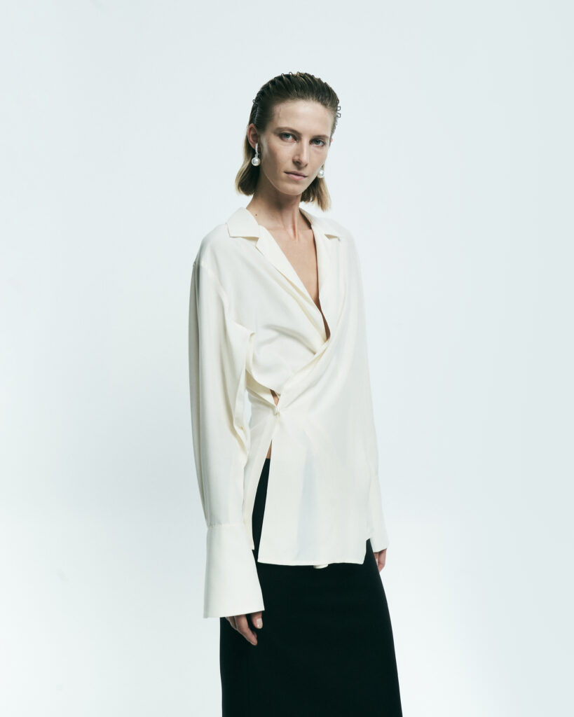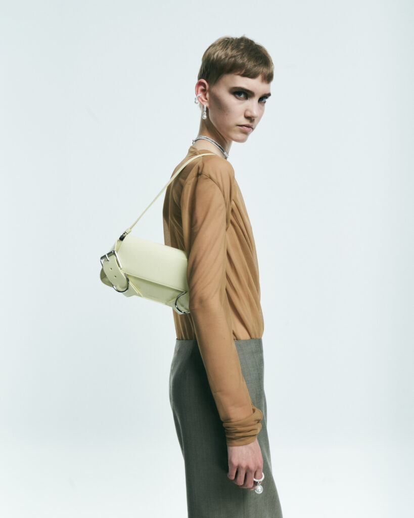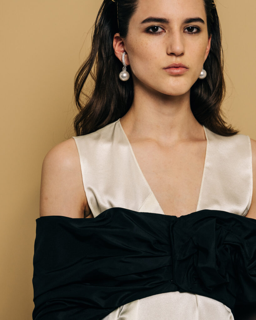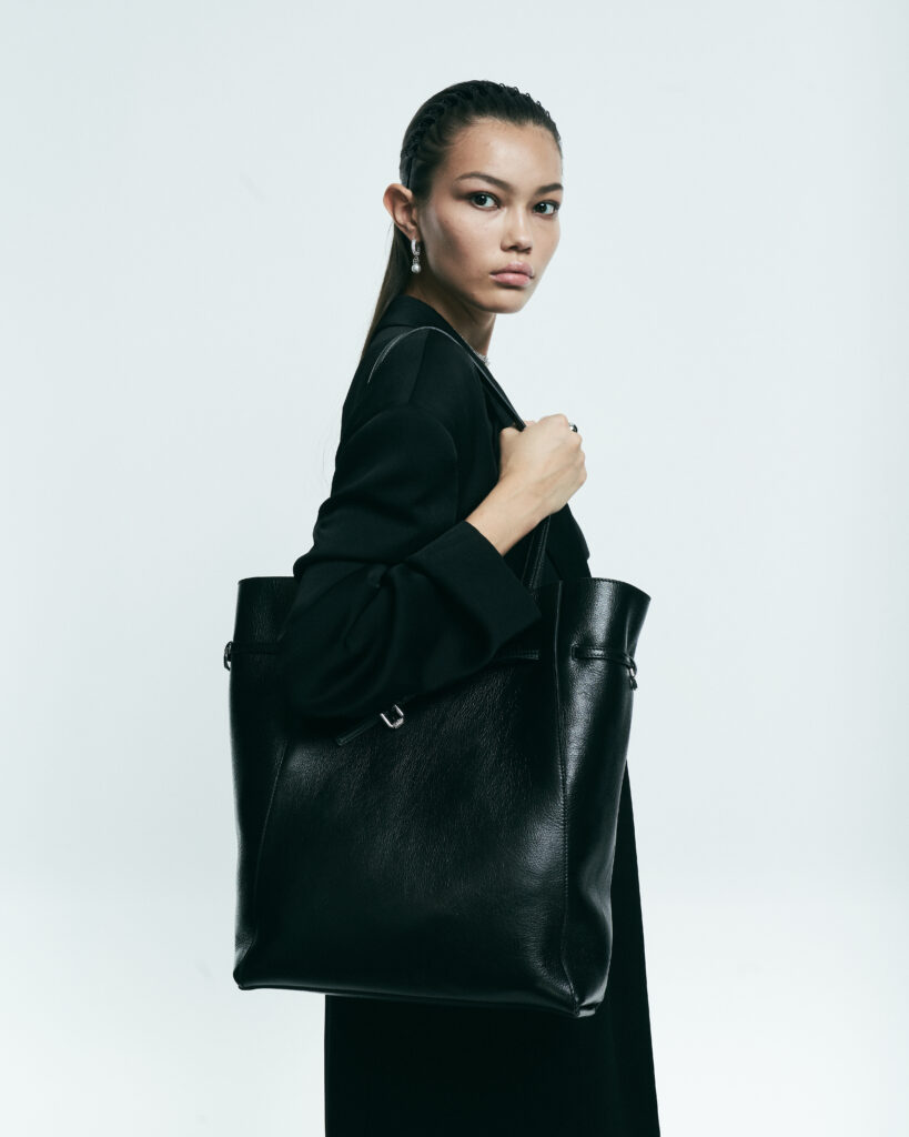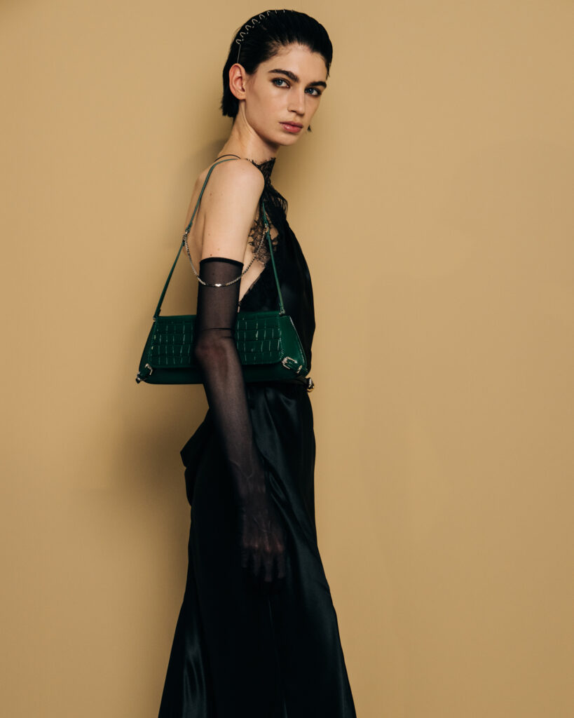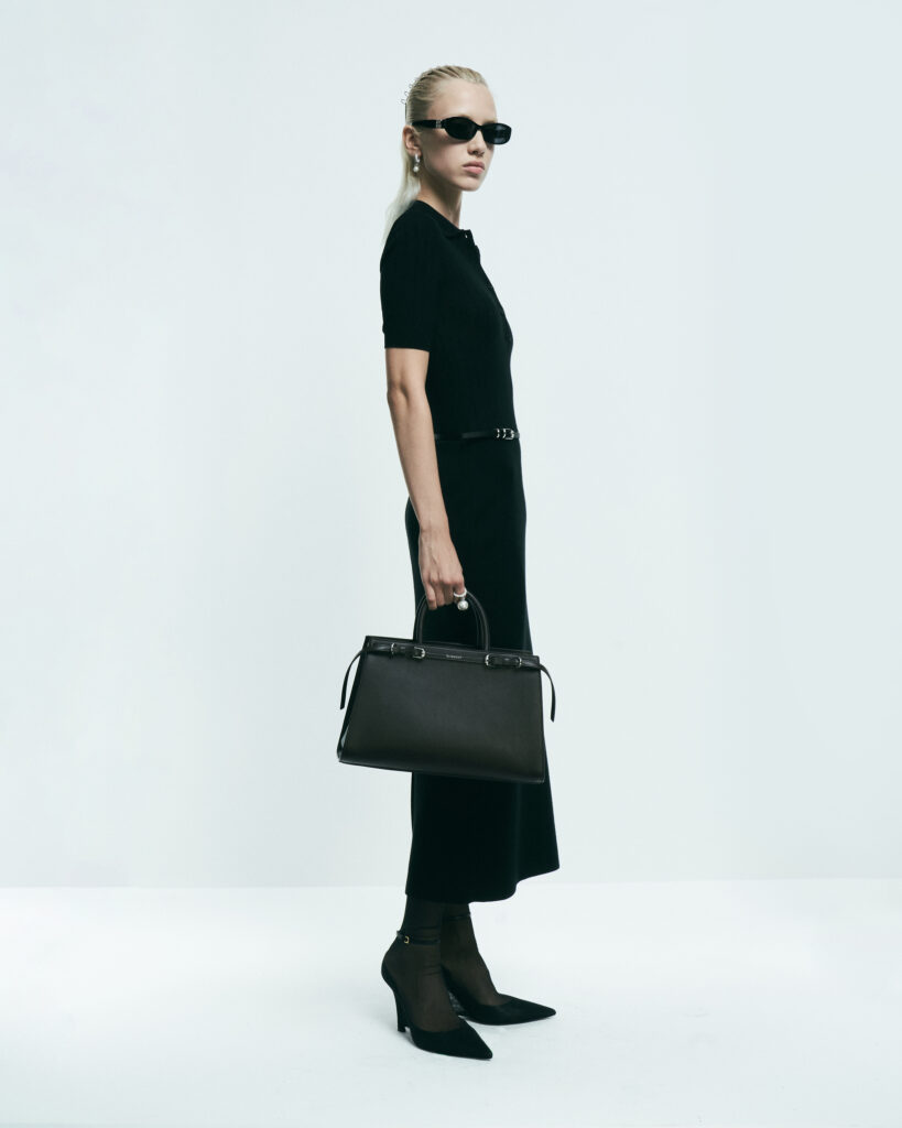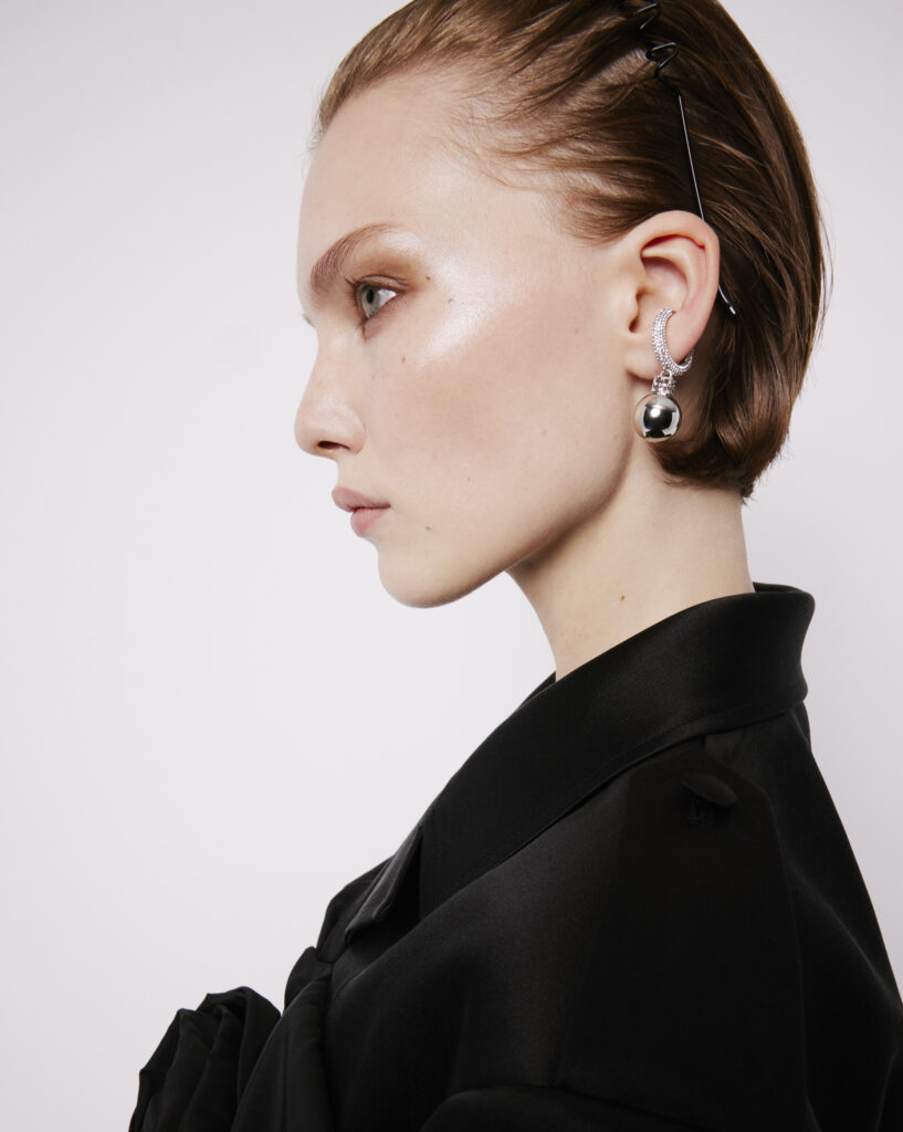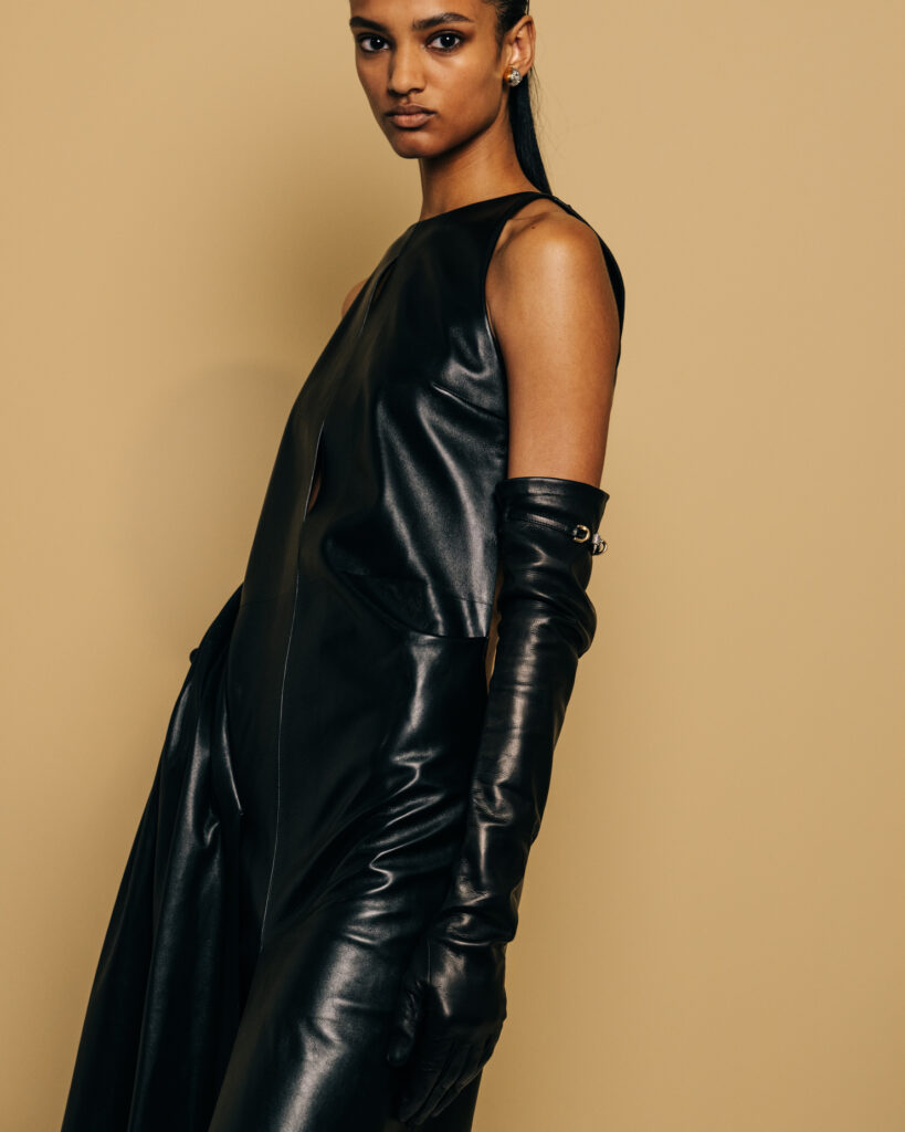 La collection révèle un dialogue entre le rigide et le détendu, où la taille architectonique et les tissus de laine raffinée sont façonnés avec des courbes en demi-lune. Les dos ouverts plongeants ou ailés des vestes et des robes rappellent la langue de la haute couture, tandis que des blazers double boutonnage doucement structurés créent une silhouette enveloppante.