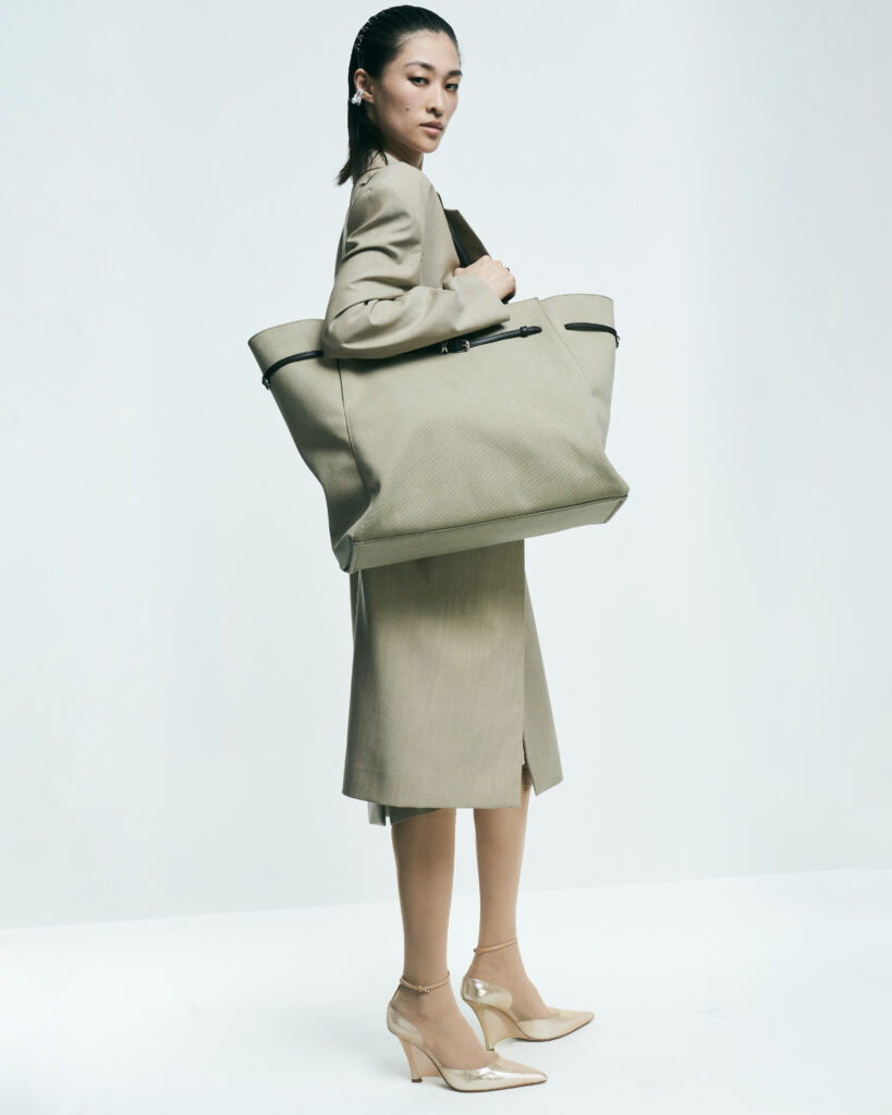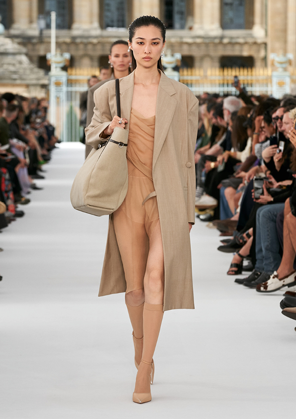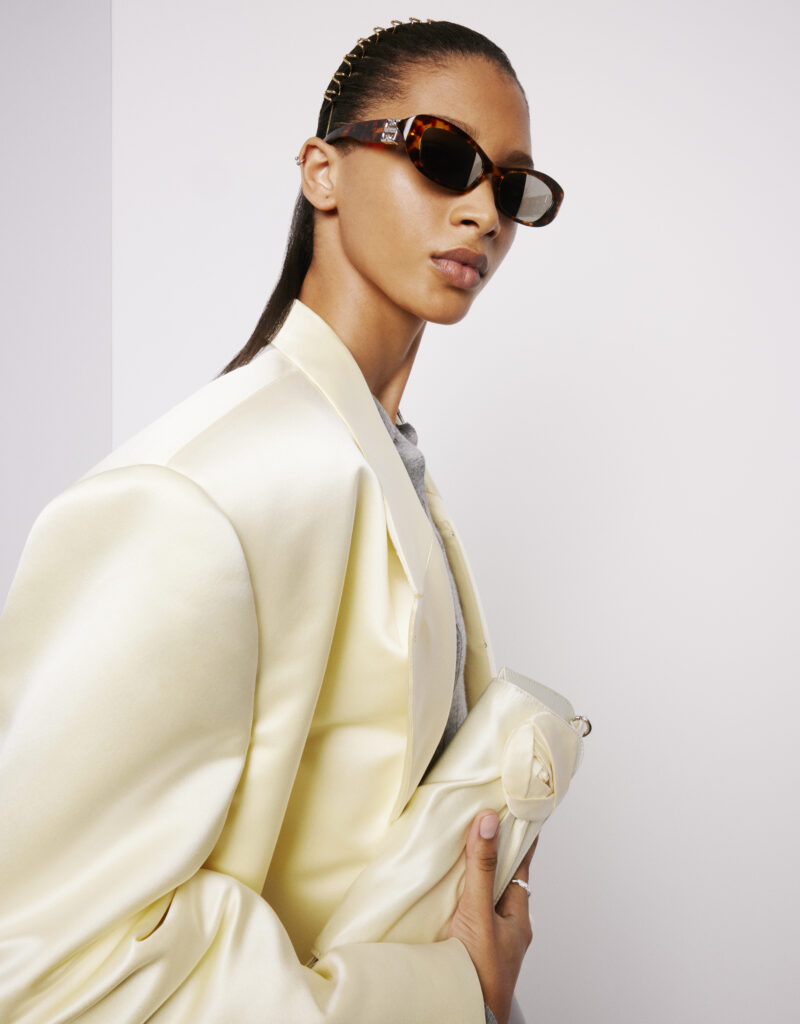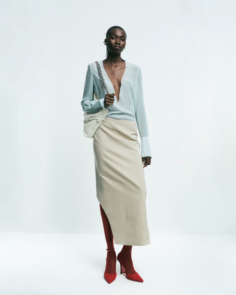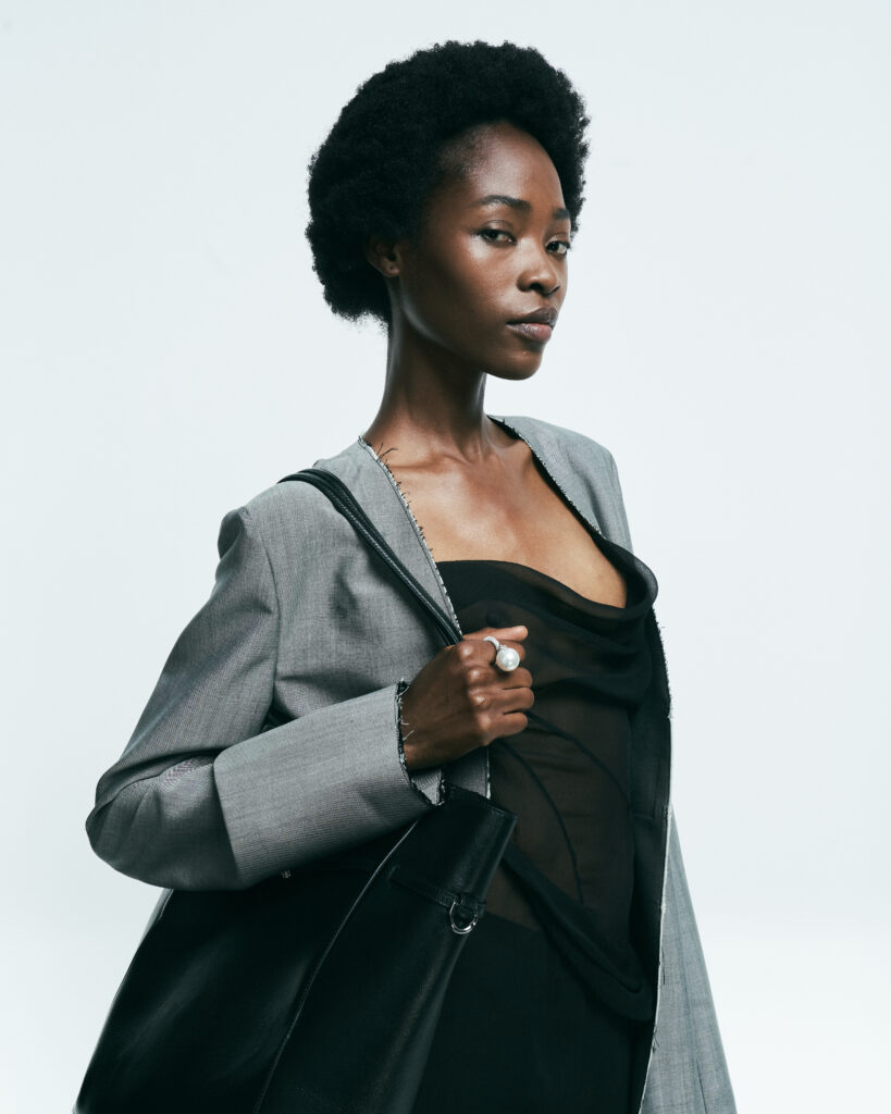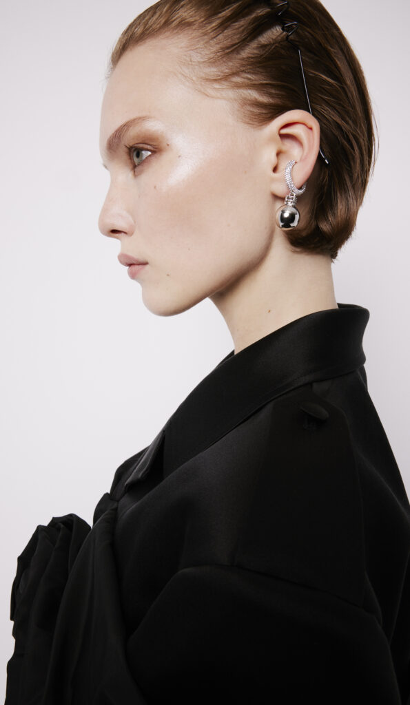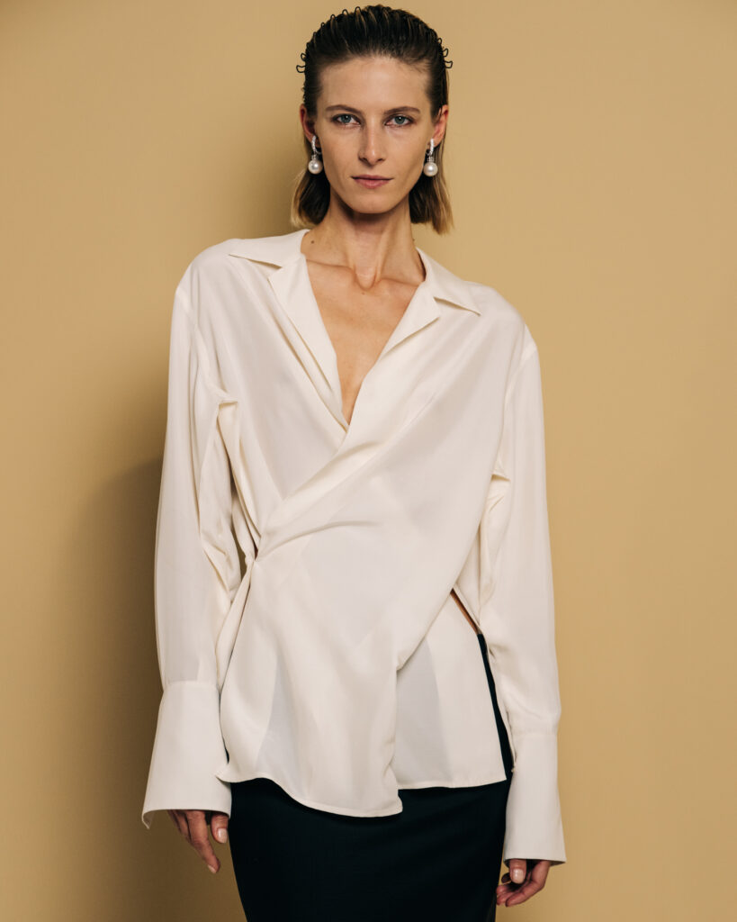 La collection révèle un dialogue entre le rigide et le détendu, où la taille architectonique et les tissus de laine raffinée sont façonnés avec des courbes en demi-lune. Les dos ouverts plongeants ou ailés des vestes et des robes rappellent la langue de la haute couture, tandis que des blazers double boutonnage doucement structurés créent une silhouette enveloppante.