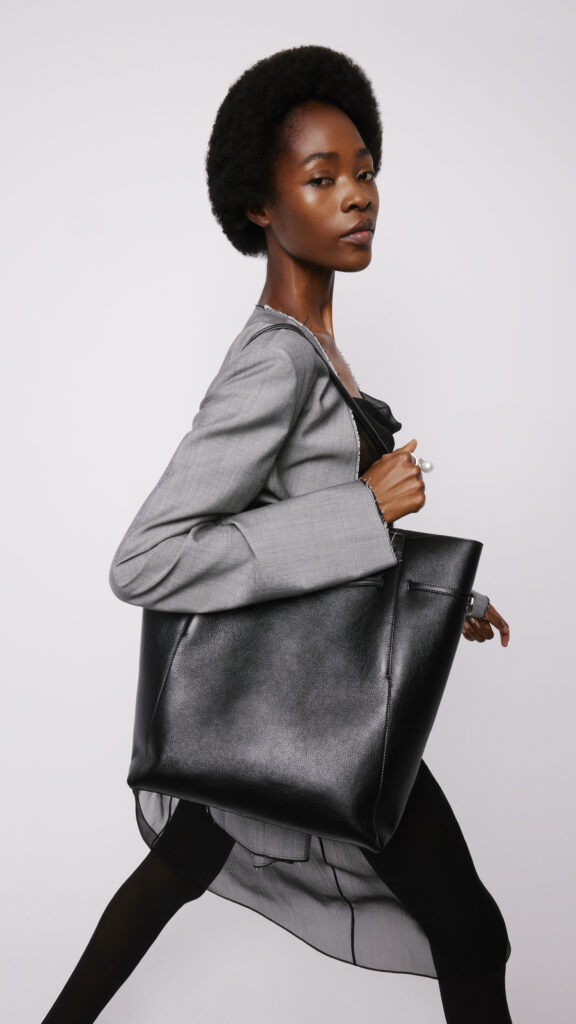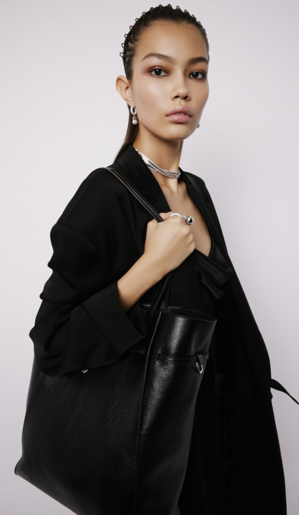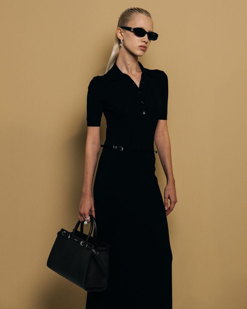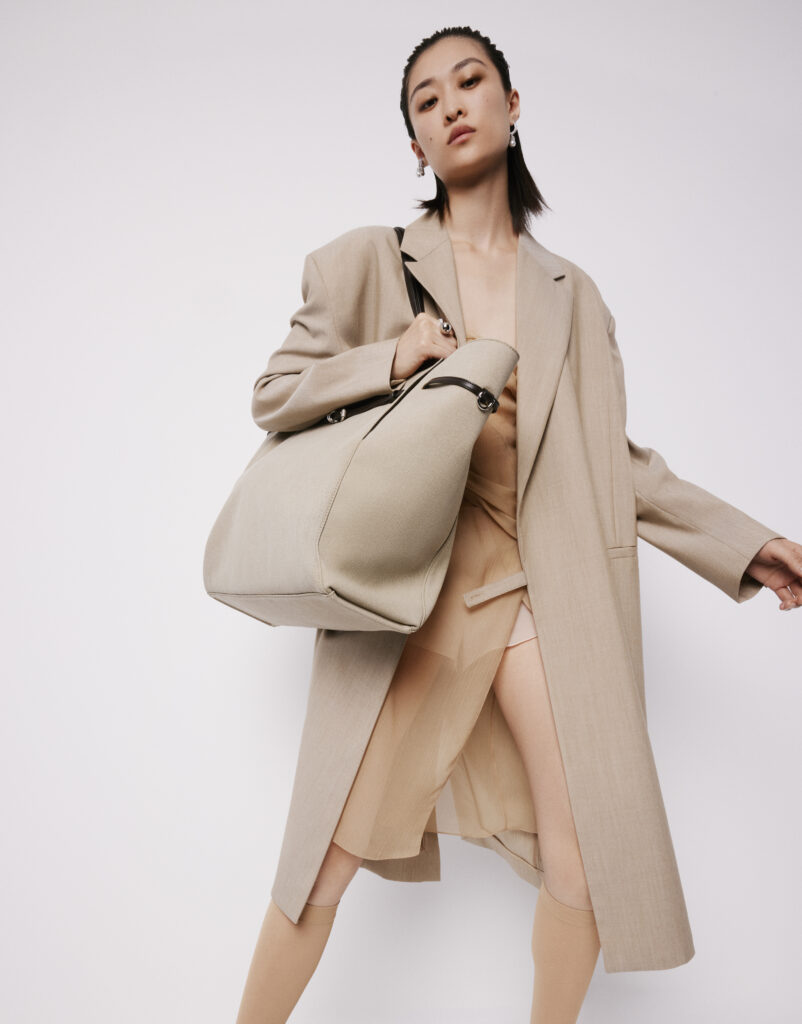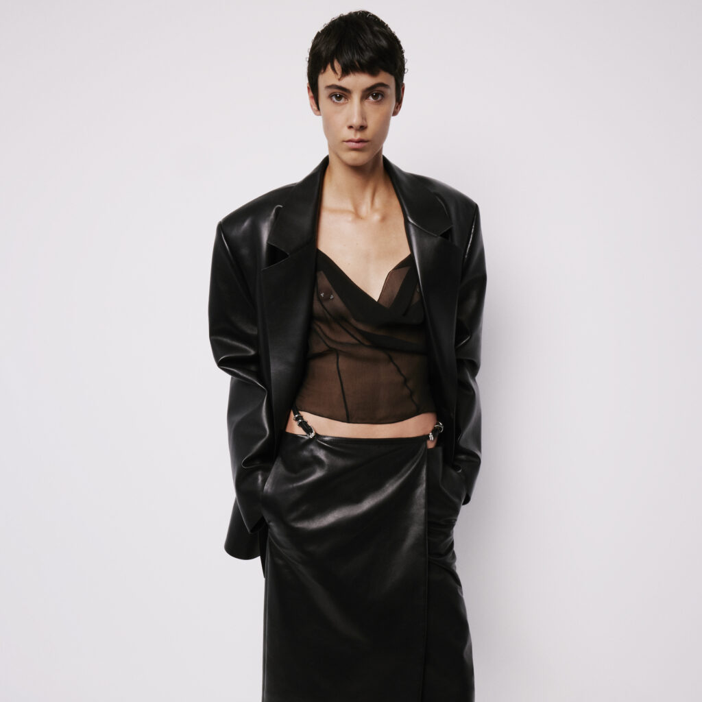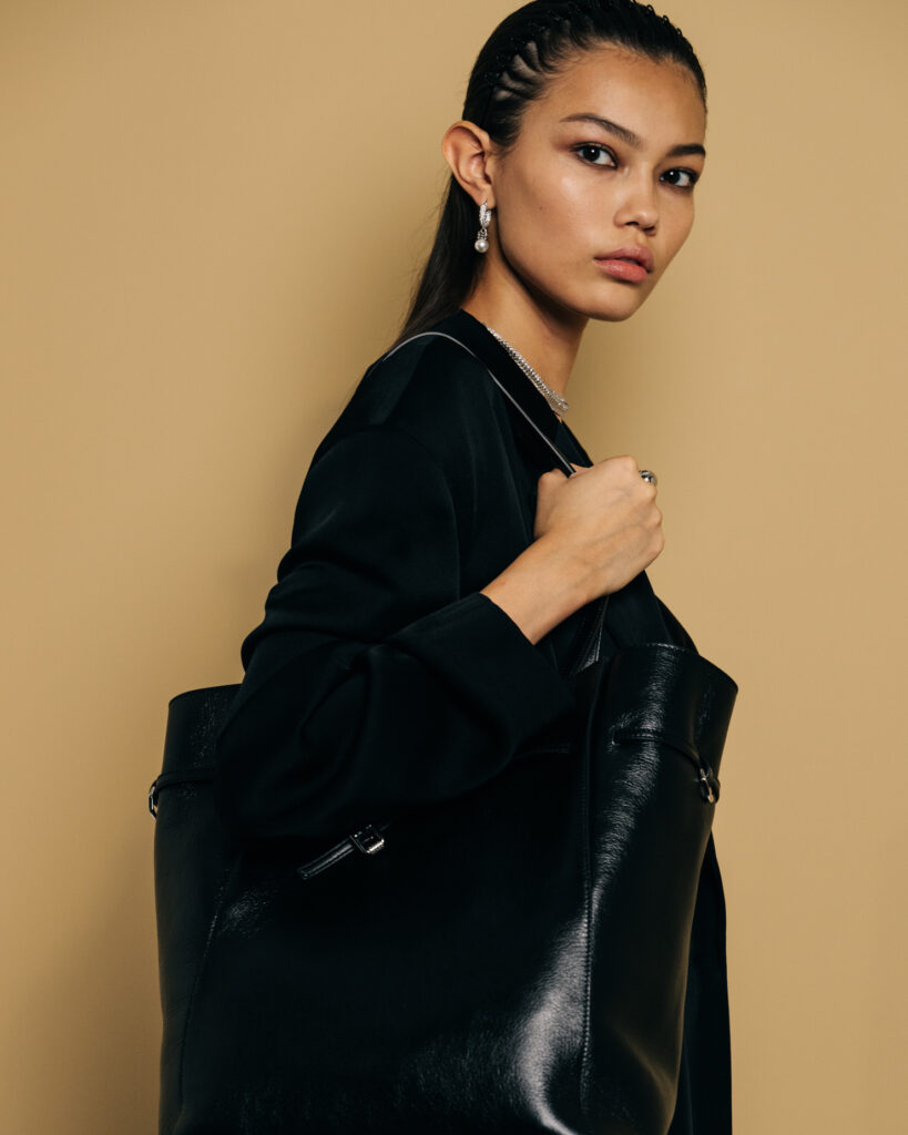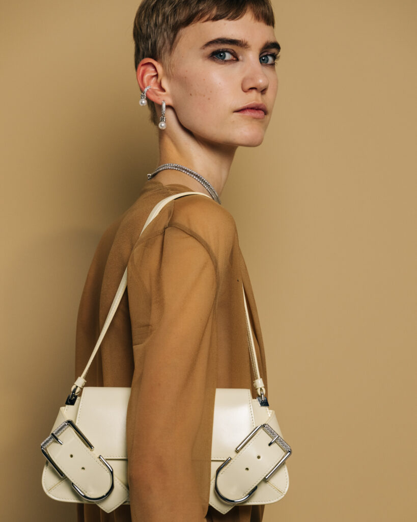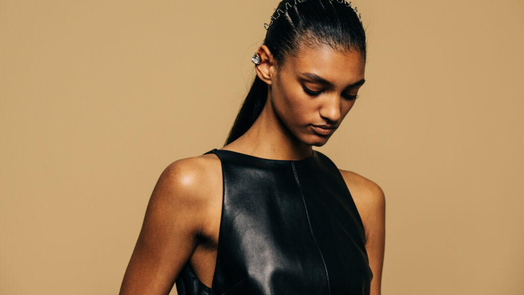 La collection révèle un dialogue entre le rigide et le détendu, où la taille architectonique et les tissus de laine raffinée sont façonnés avec des courbes en demi-lune. Les dos ouverts plongeants ou ailés des vestes et des robes rappellent la langue de la haute couture, tandis que des blazers double boutonnage doucement structurés créent une silhouette enveloppante.
