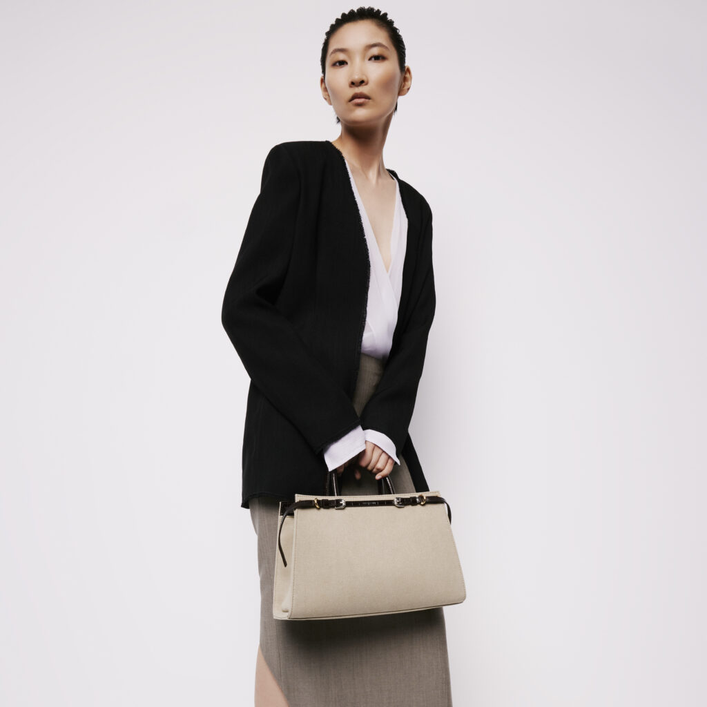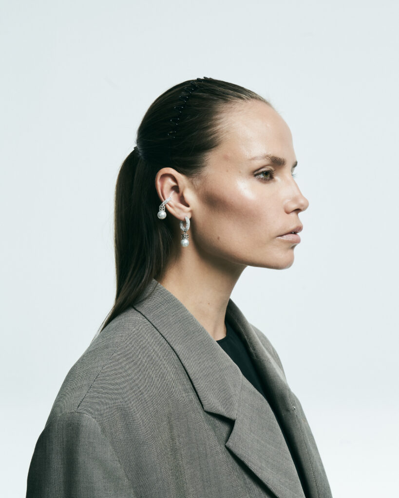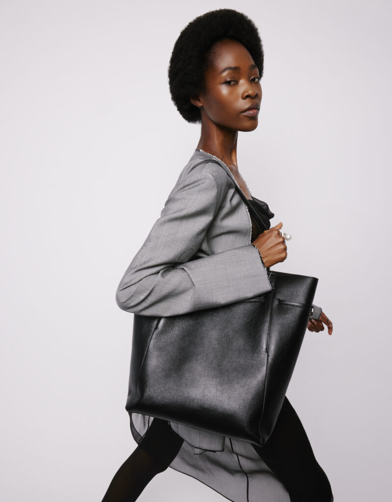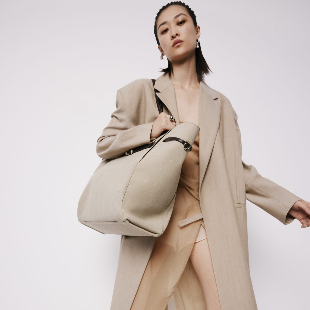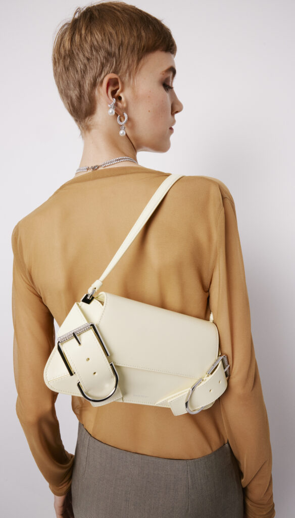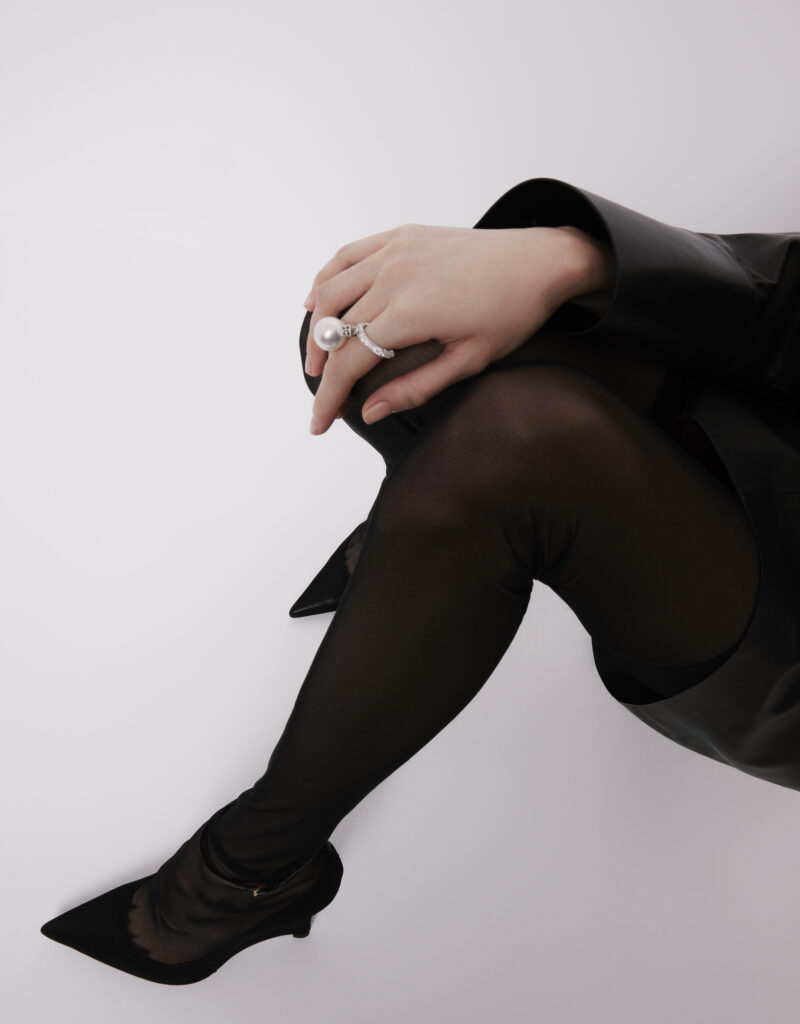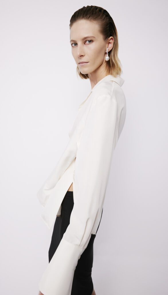 La collection révèle un dialogue entre le rigide et le détendu, où la taille architectonique et les tissus de laine raffinée sont façonnés avec des courbes en demi-lune. Les dos ouverts plongeants ou ailés des vestes et des robes rappellent la langue de la haute couture, tandis que des blazers double boutonnage doucement structurés créent une silhouette enveloppante.