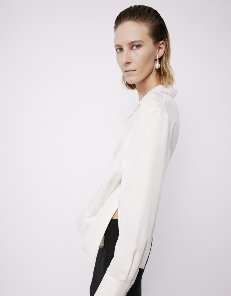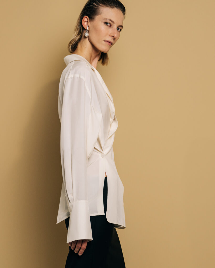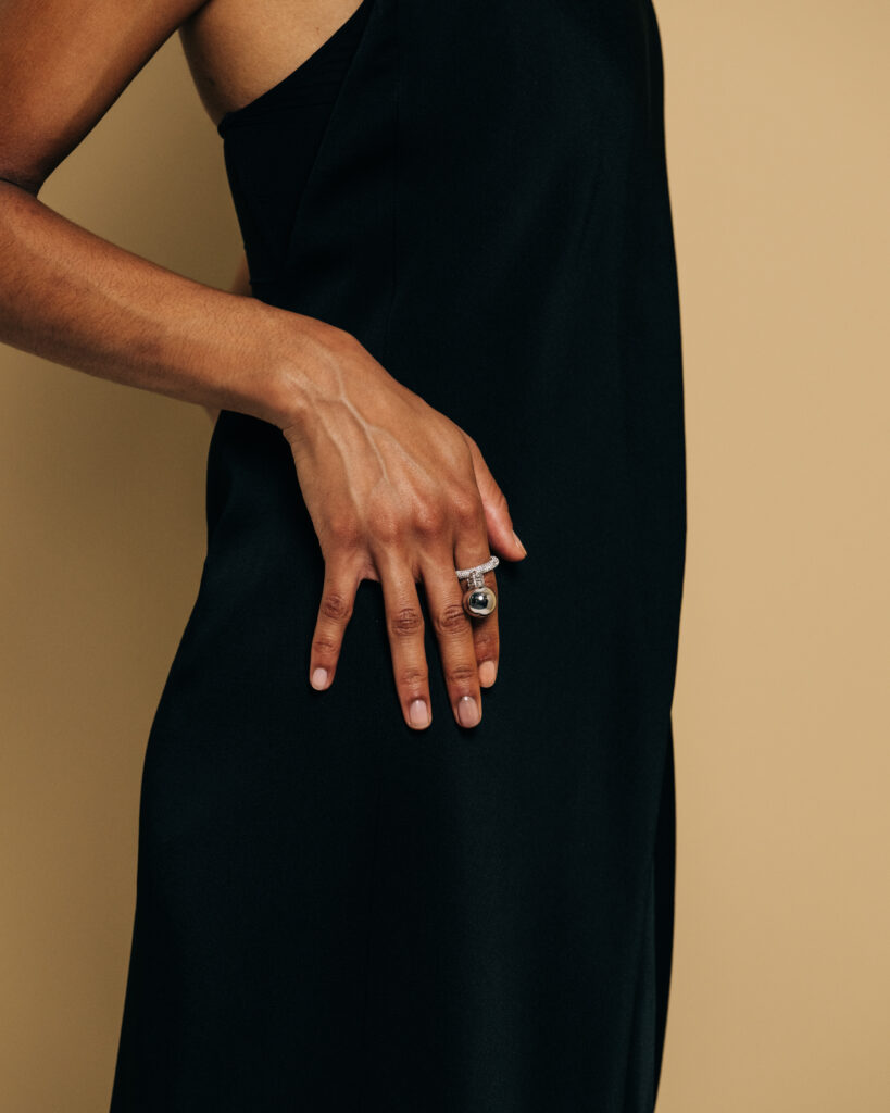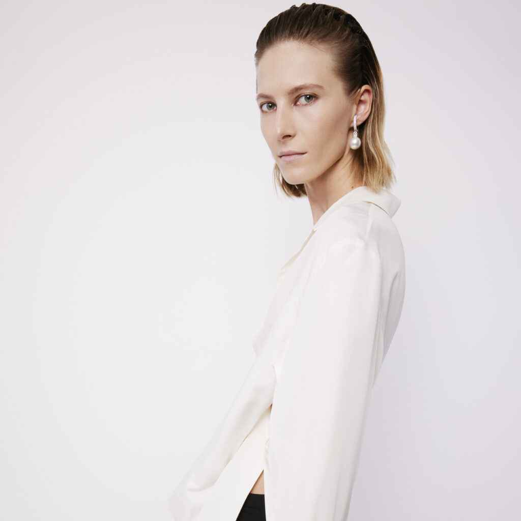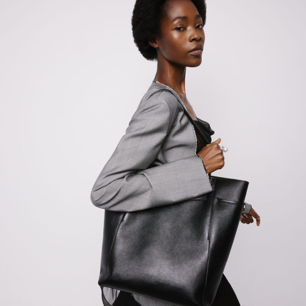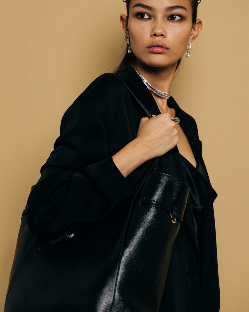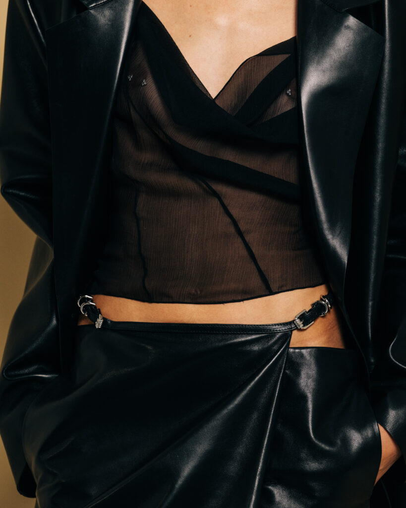La collection révèle un dialogue entre le rigide et le détendu, où la taille architectonique et les tissus de laine raffinée sont façonnés avec des courbes en demi-lune. Les dos ouverts plongeants ou ailés des vestes et des robes rappellent la langue de la haute couture, tandis que des blazers double boutonnage doucement structurés créent une silhouette enveloppante.
