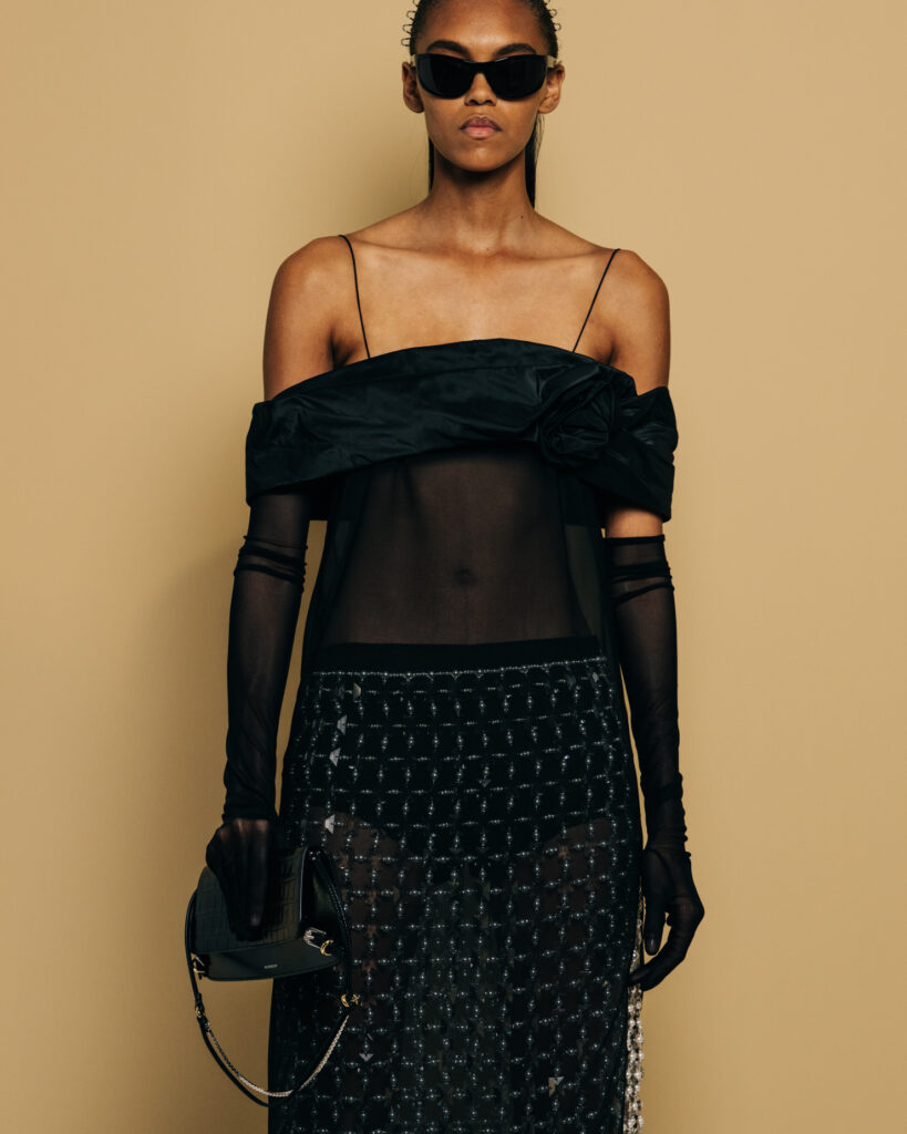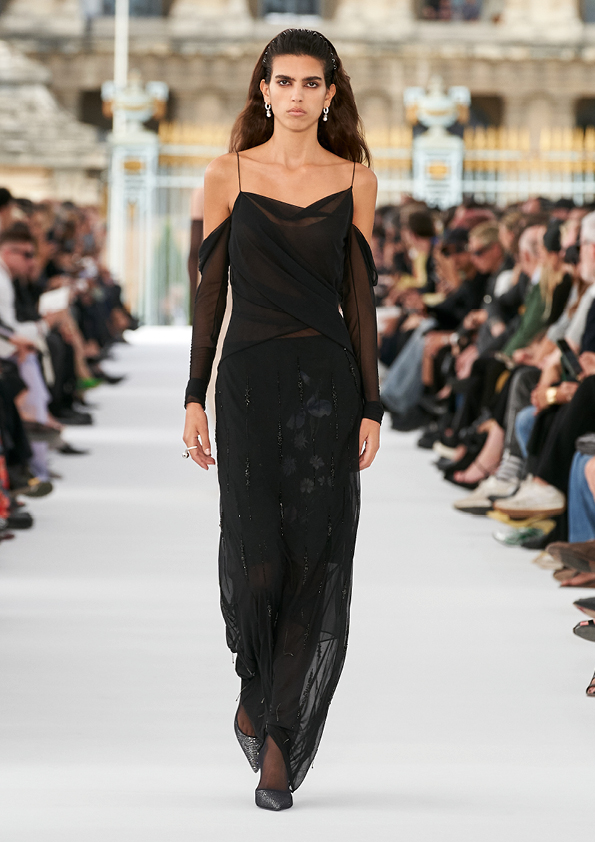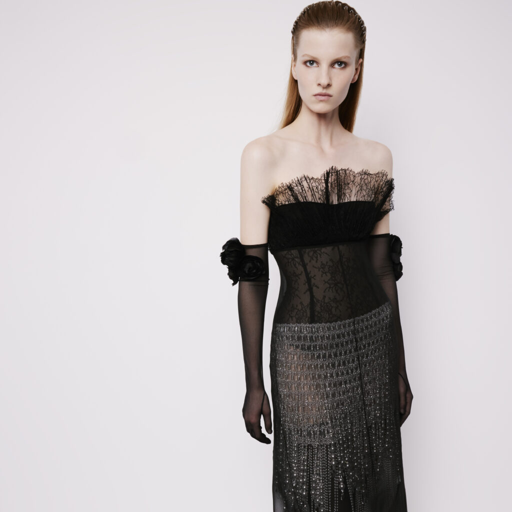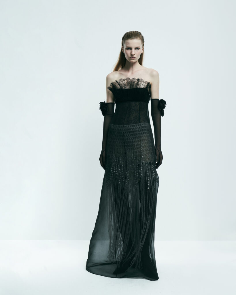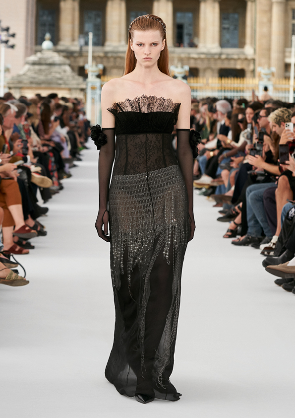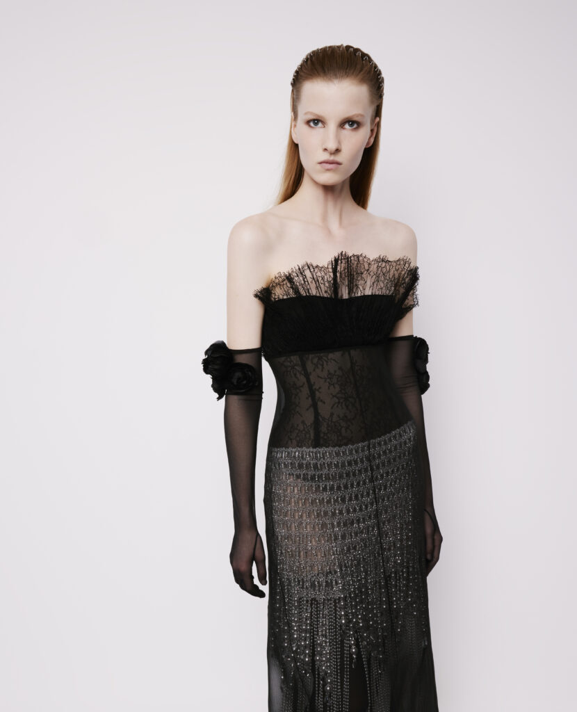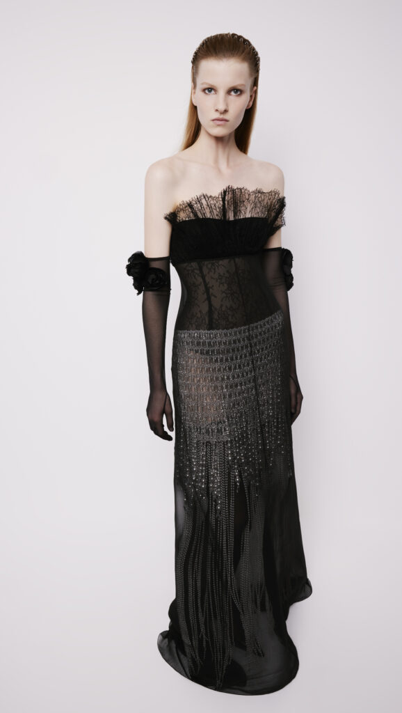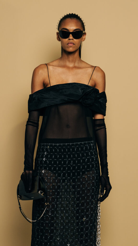 - Dentelle et Bijoux : La dentelle, élément central de l’élégance chez Givenchy, est réactivée dans les volants des robes. Les bijoux se transforment en vêtements, avec des robes et jupes en perles, verre et cristaux.