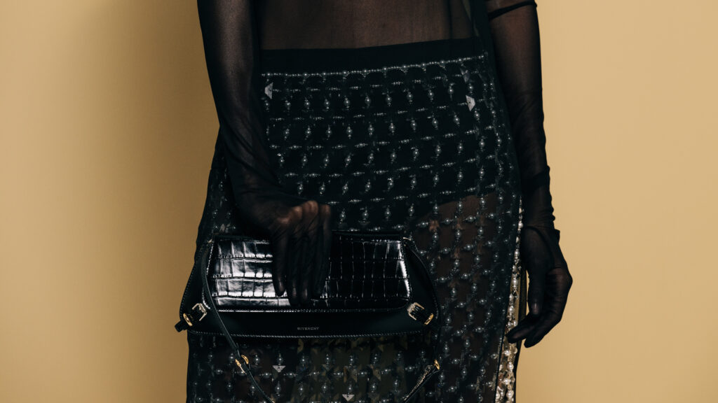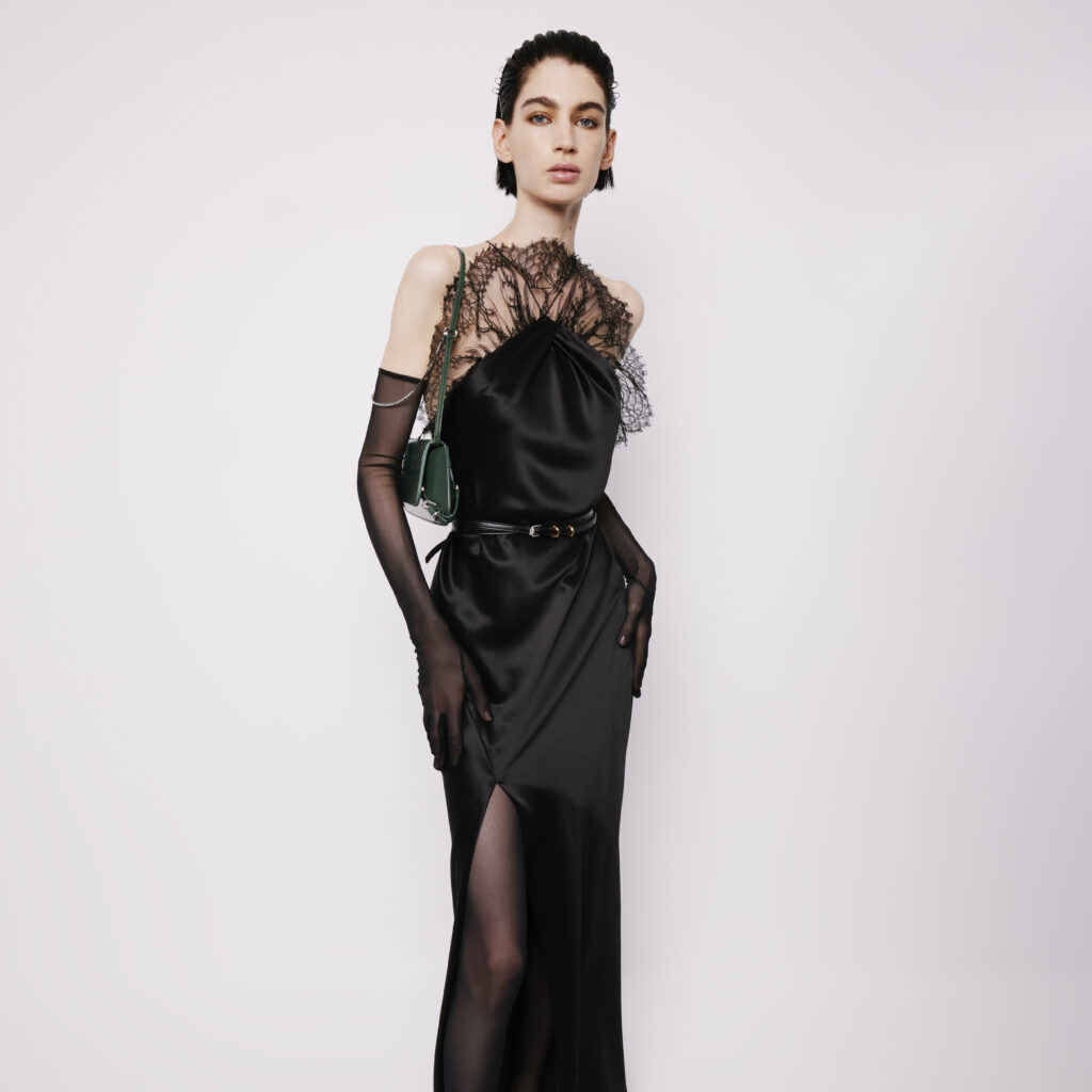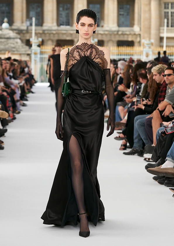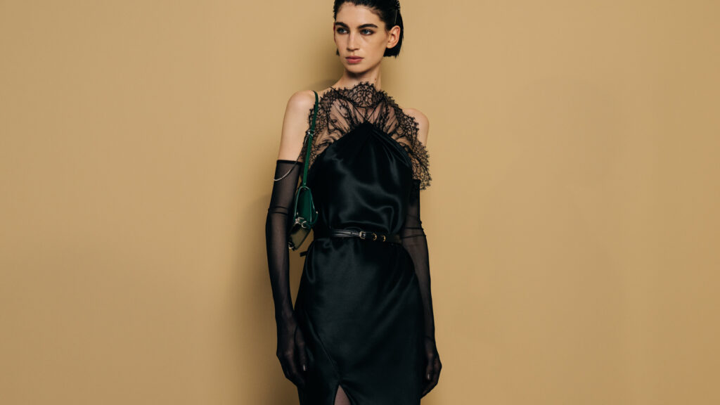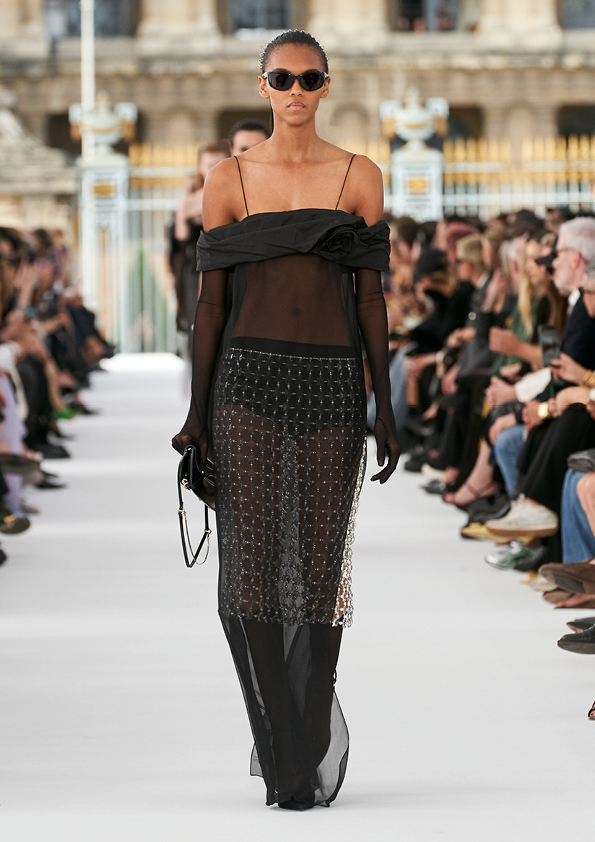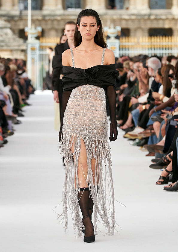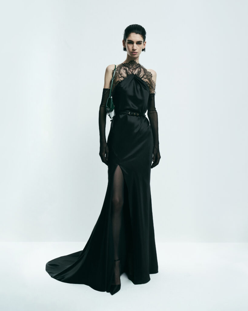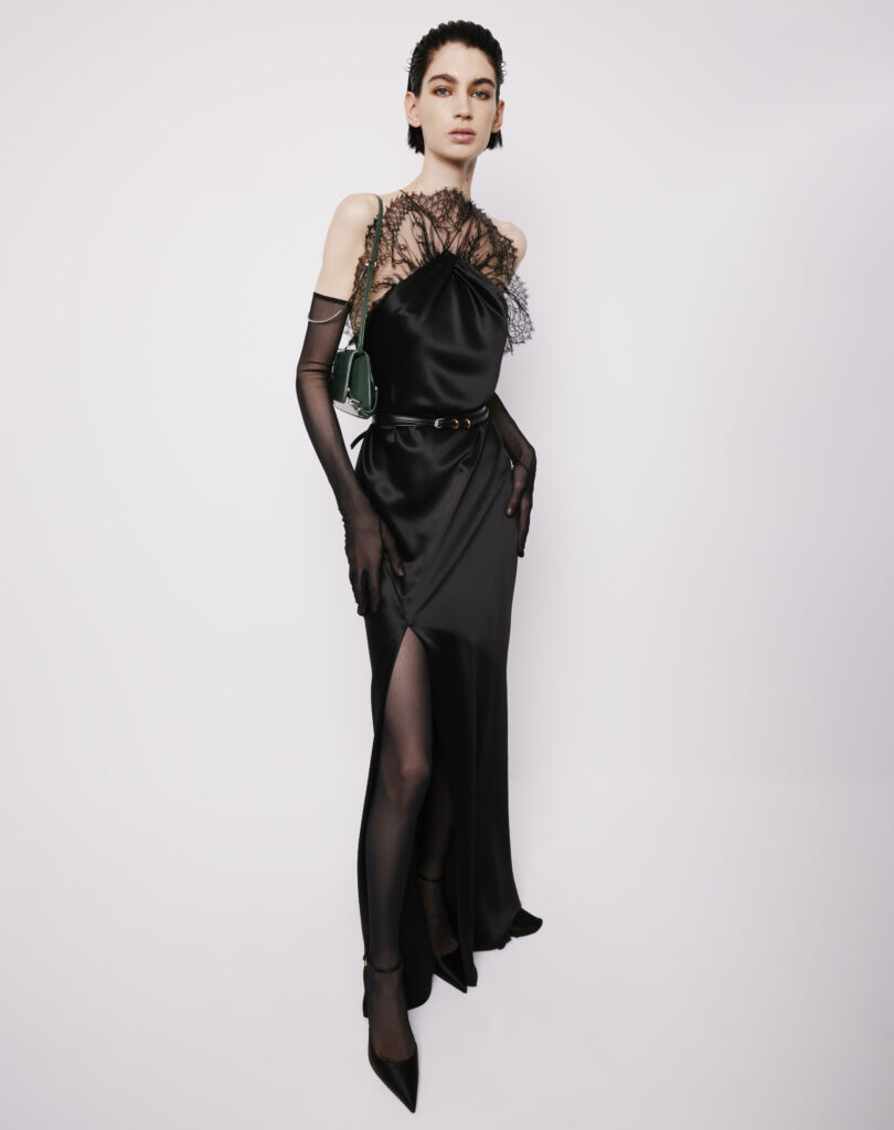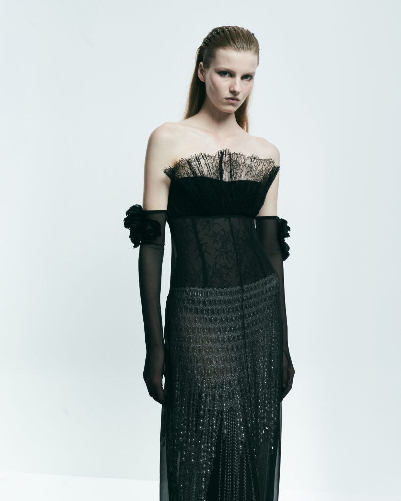 - Dentelle et Bijoux : La dentelle, élément central de l’élégance chez Givenchy, est réactivée dans les volants des robes. Les bijoux se transforment en vêtements, avec des robes et jupes en perles, verre et cristaux.
