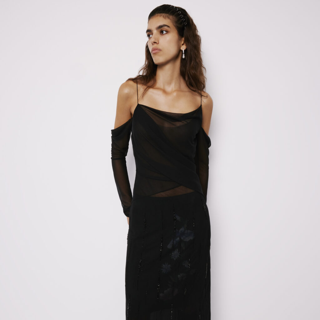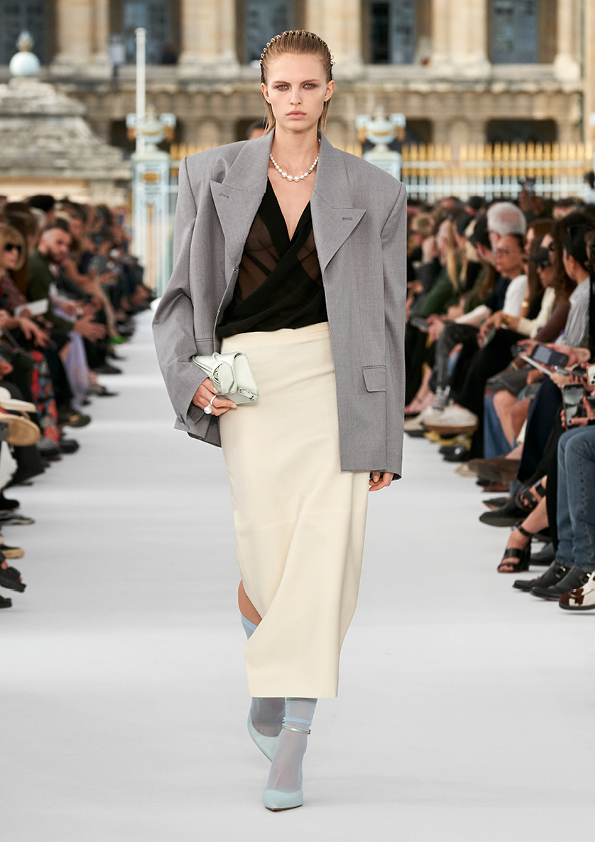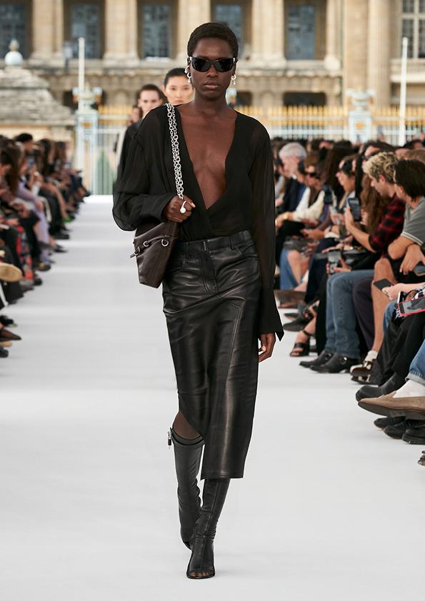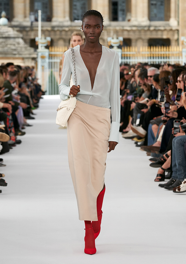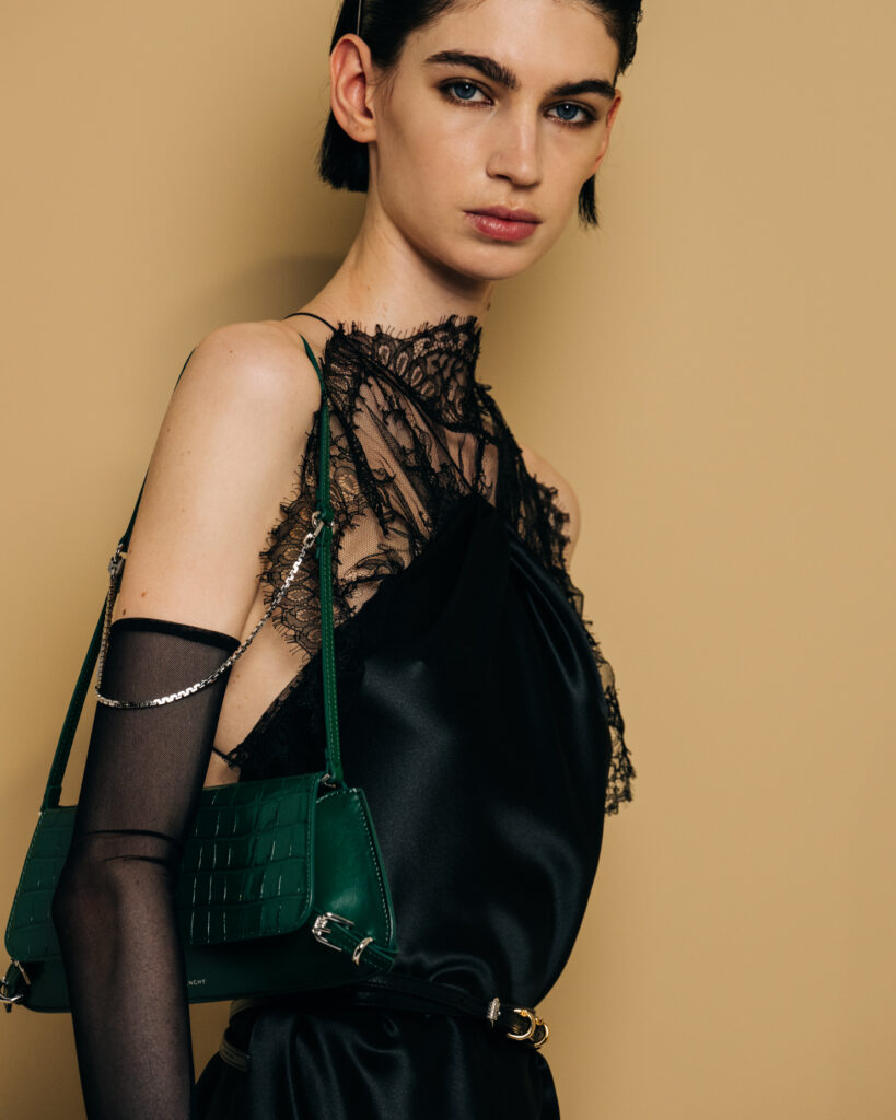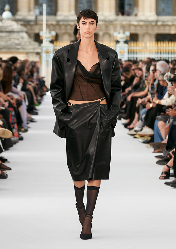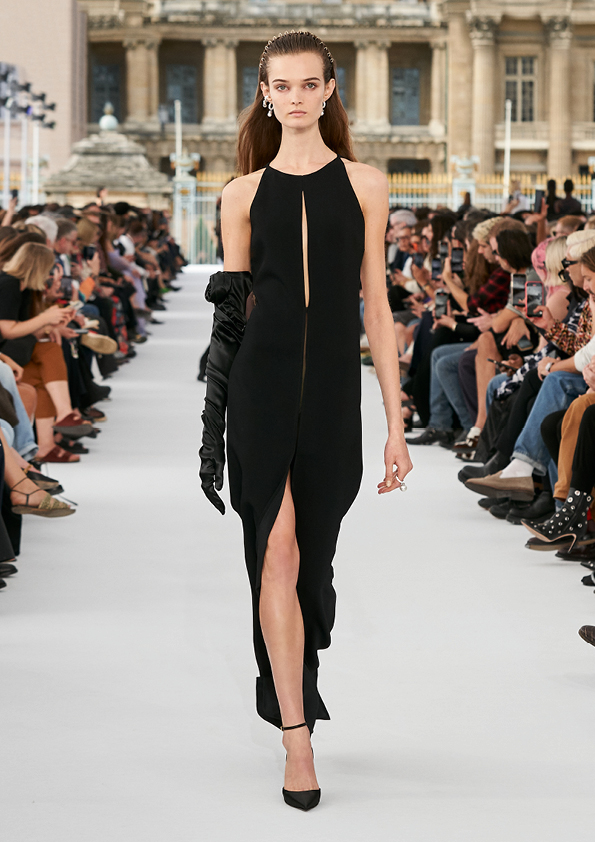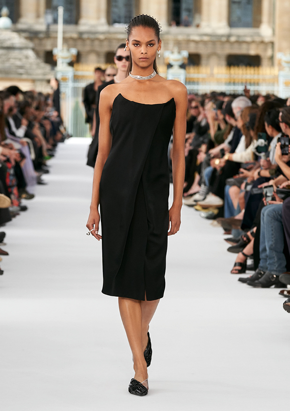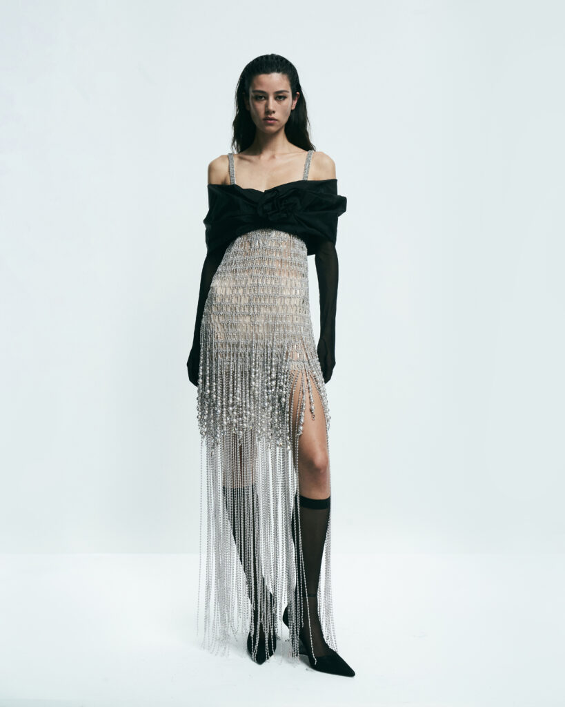 - Dentelle et Bijoux : La dentelle, élément central de l’élégance chez Givenchy, est réactivée dans les volants des robes. Les bijoux se transforment en vêtements, avec des robes et jupes en perles, verre et cristaux.