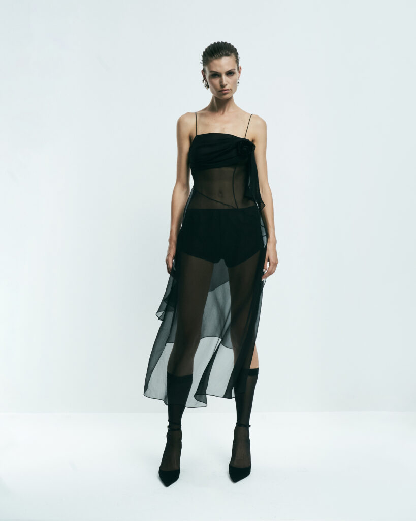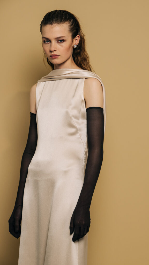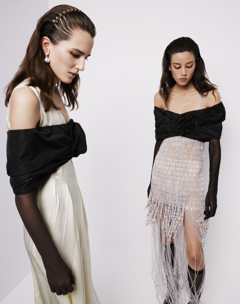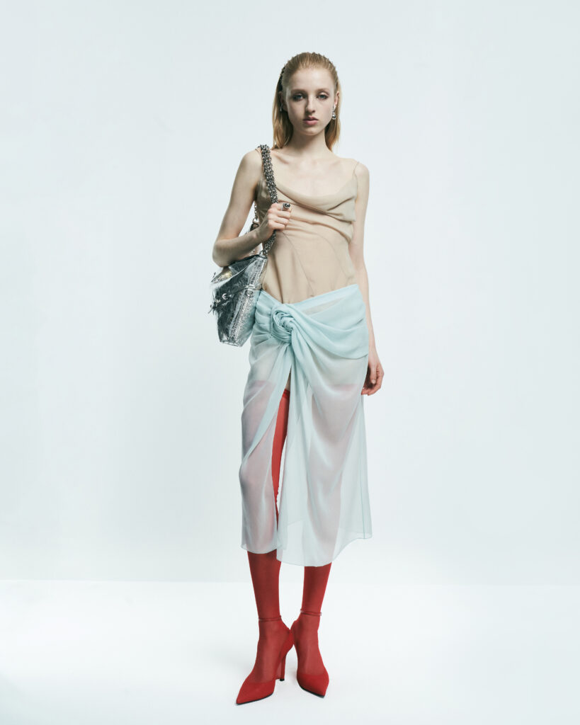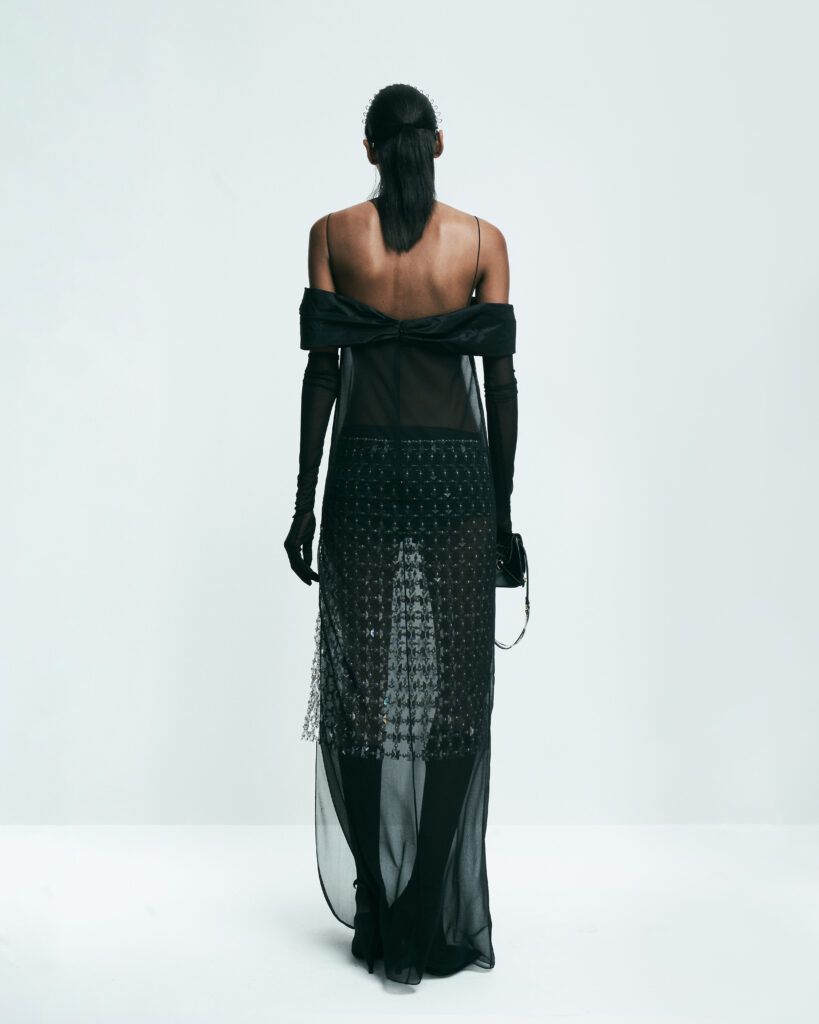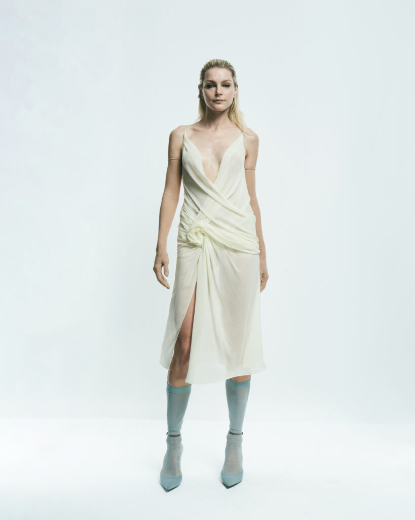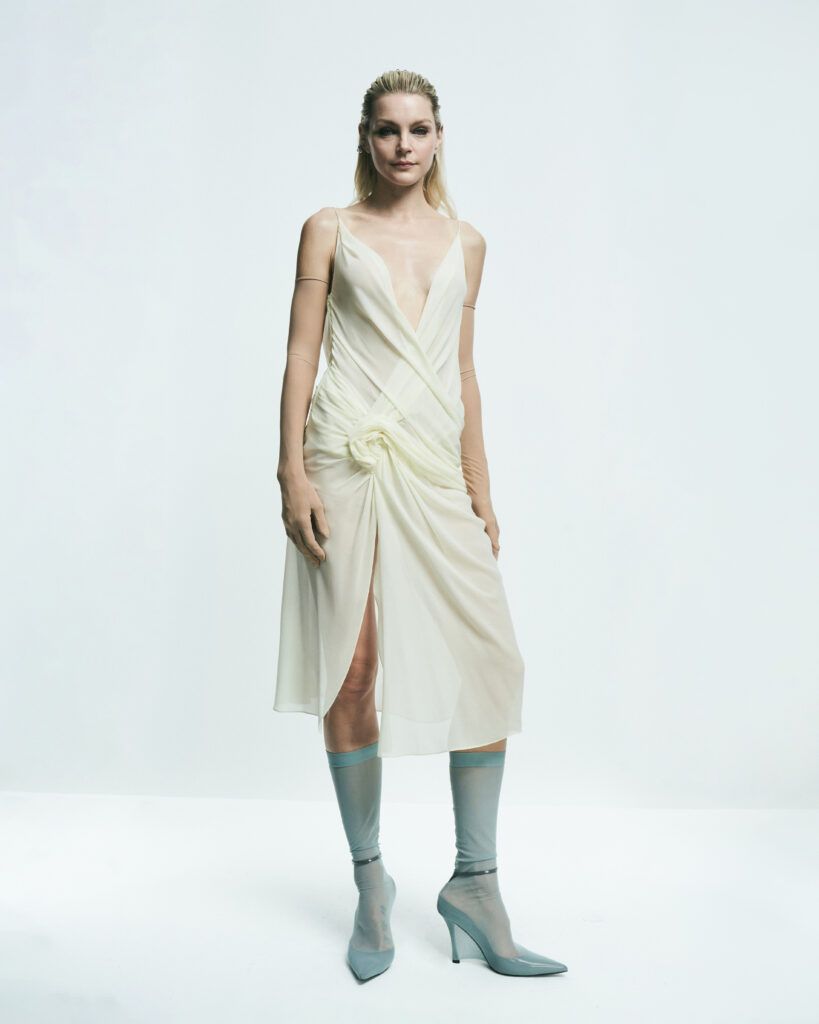 La collection réinterprète les codes du soir pour le jour, avec des robes en filtrage seconde peau, enveloppées, froncées et nouées dans des superpositions translucides.
