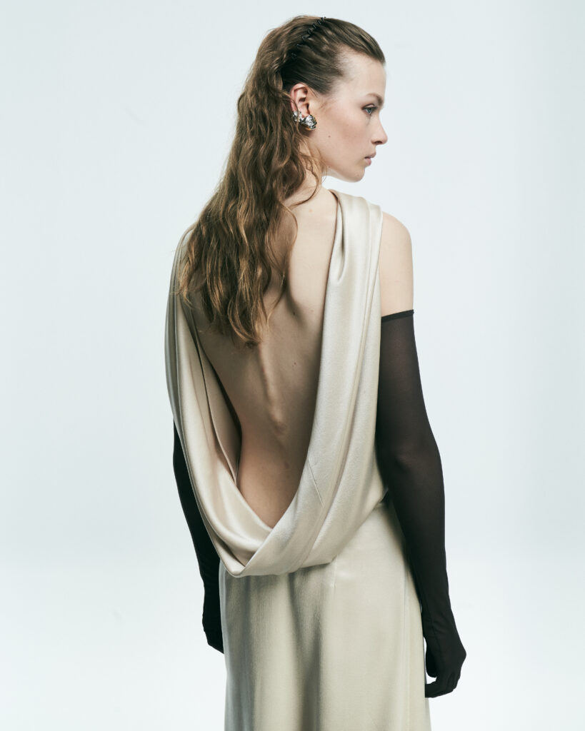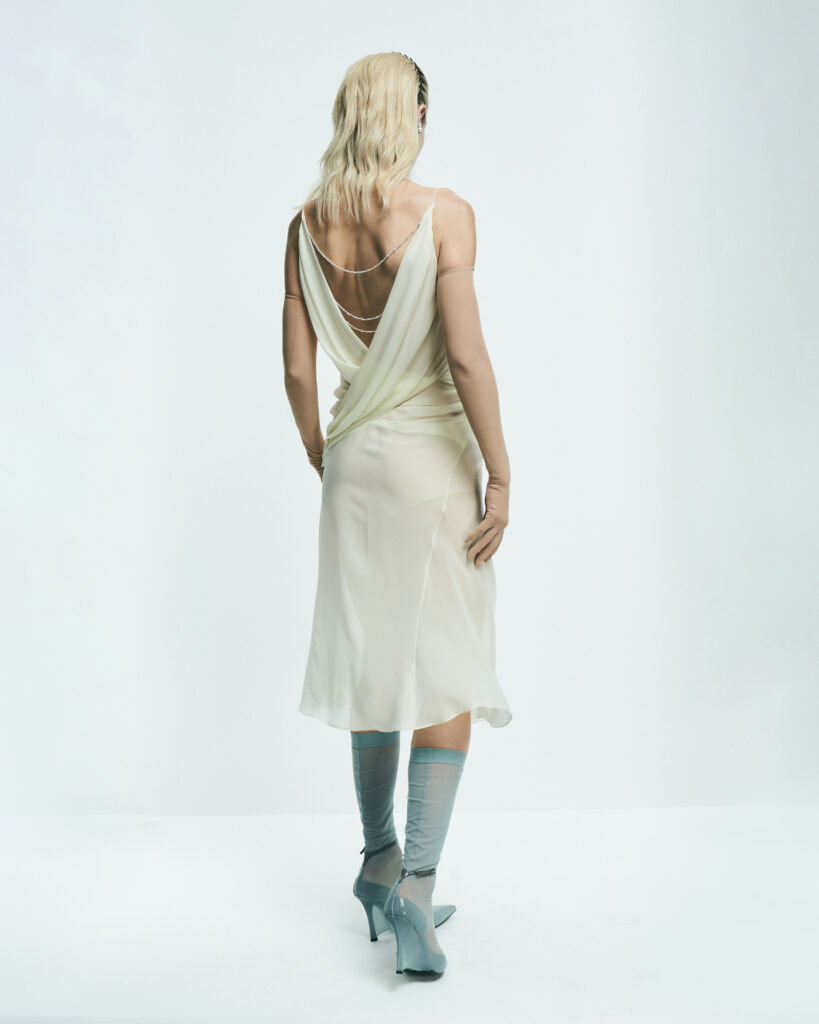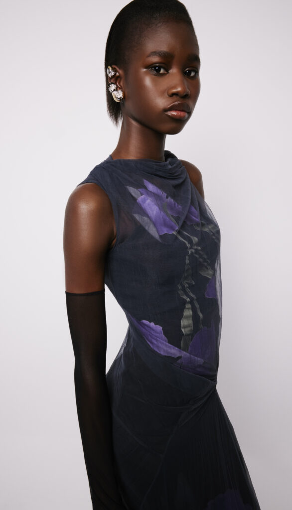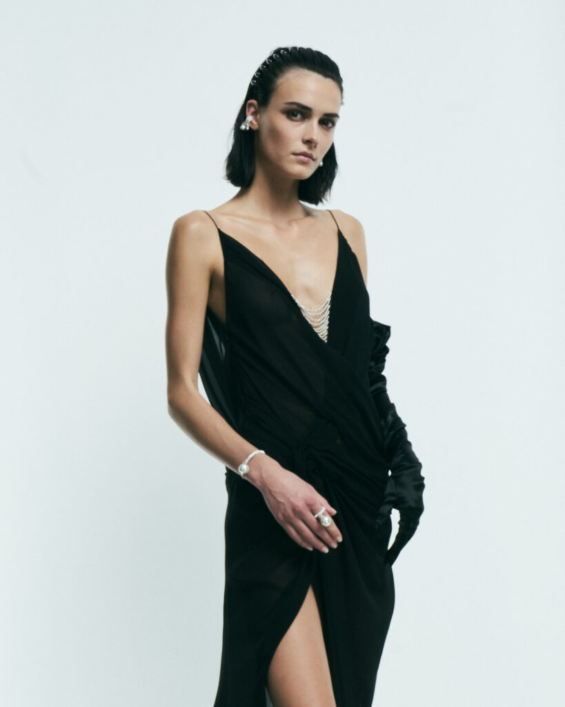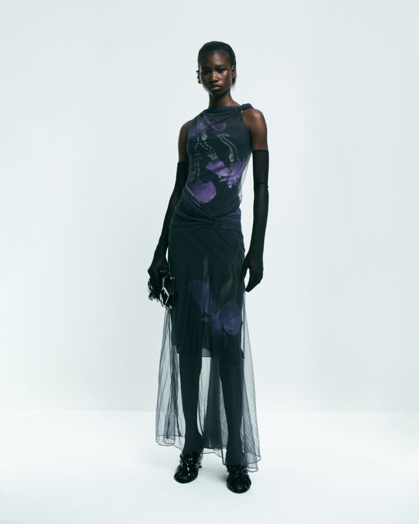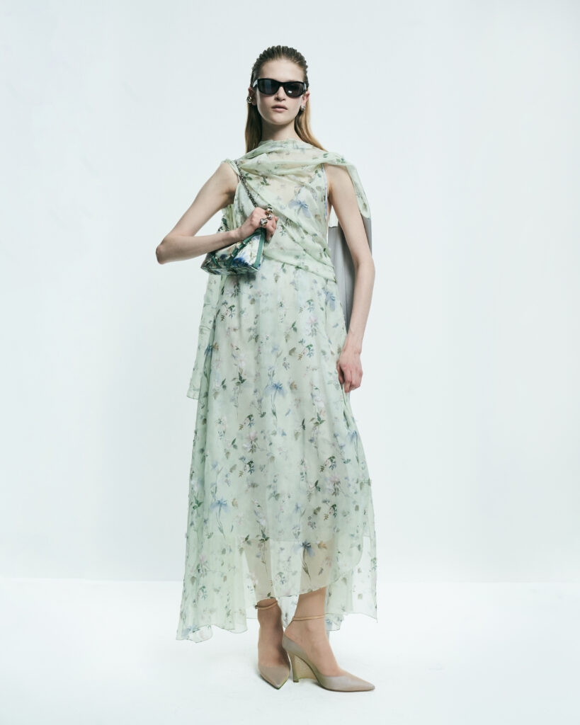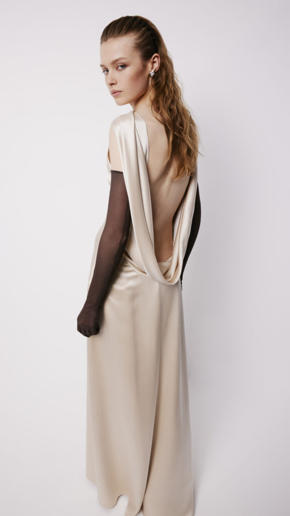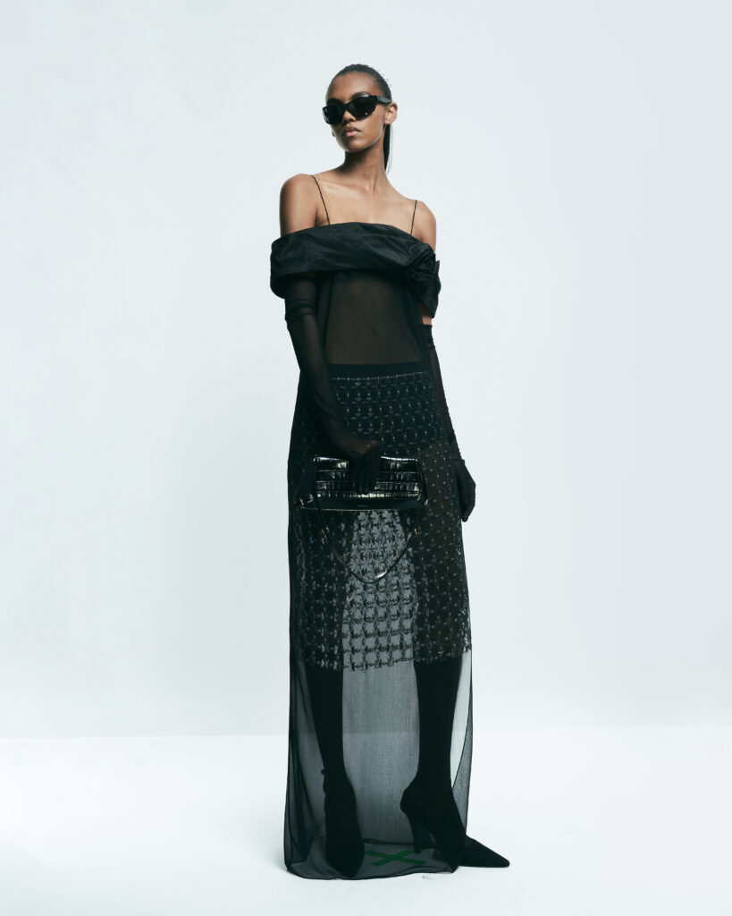 La collection réinterprète les codes du soir pour le jour, avec des robes en filtrage seconde peau, enveloppées, froncées et nouées dans des superpositions translucides.