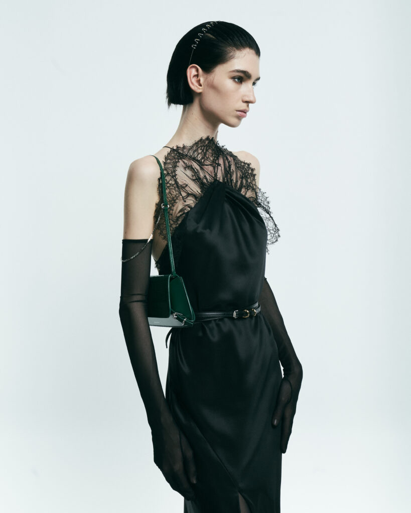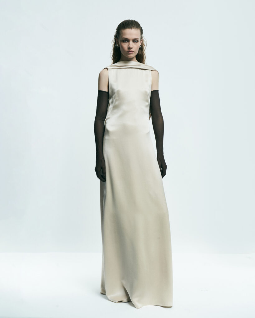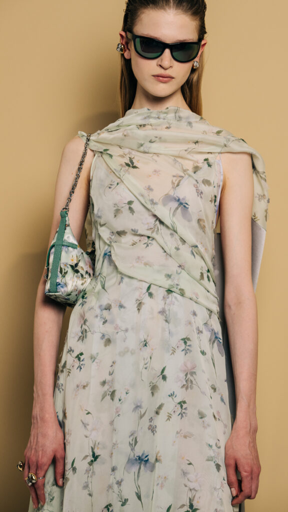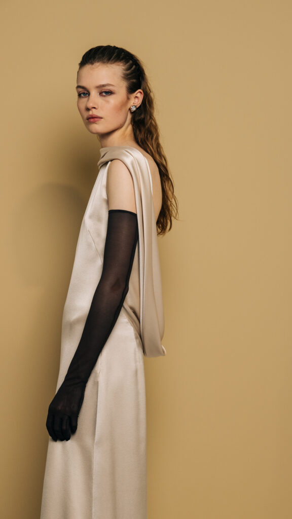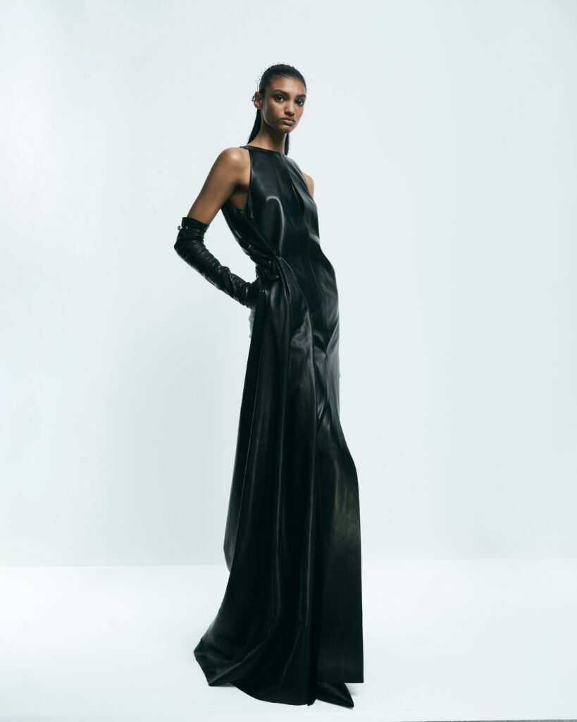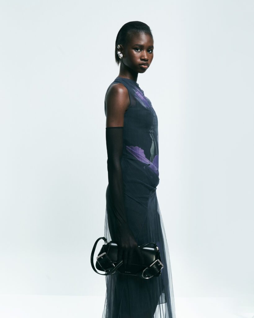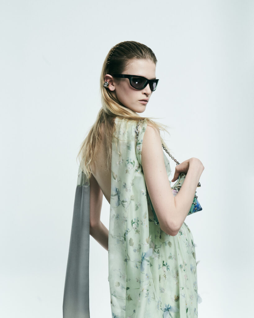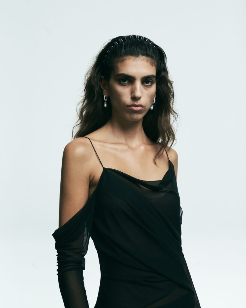 La collection réinterprète les codes du soir pour le jour, avec des robes en filtrage seconde peau, enveloppées, froncées et nouées dans des superpositions translucides.