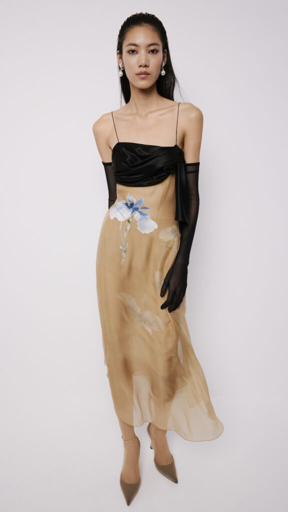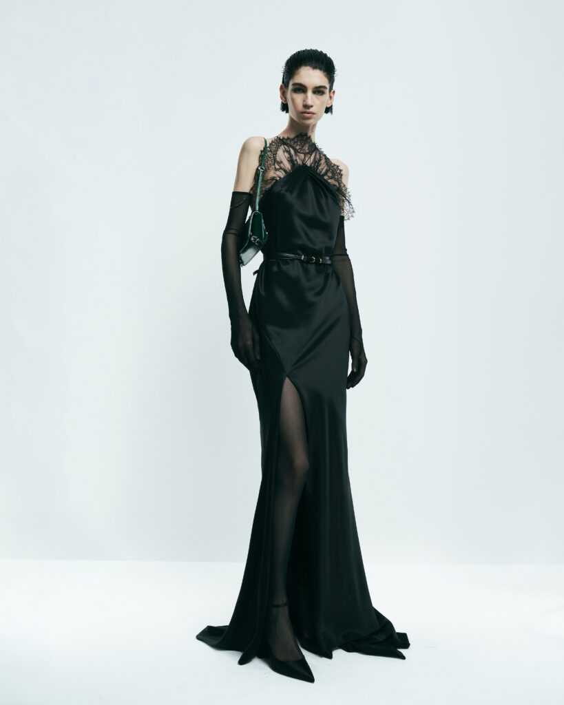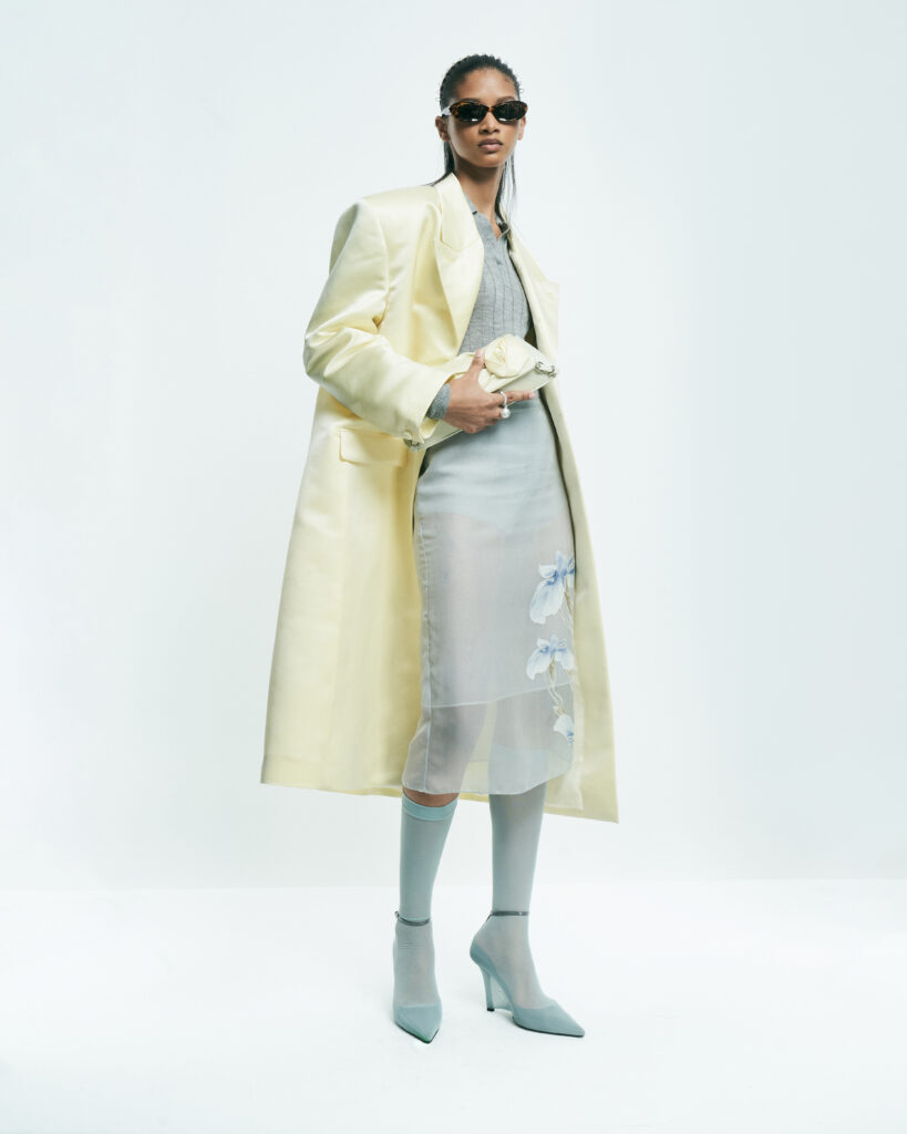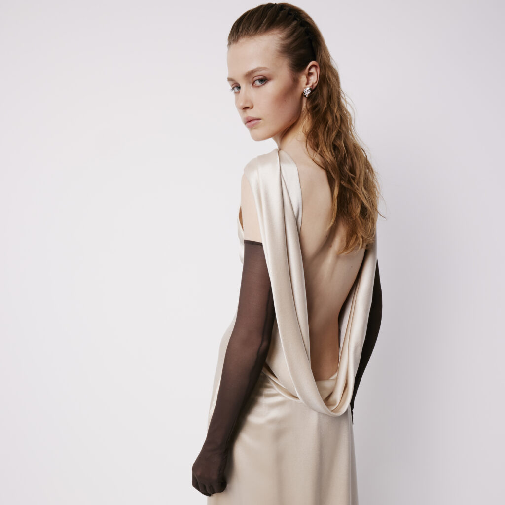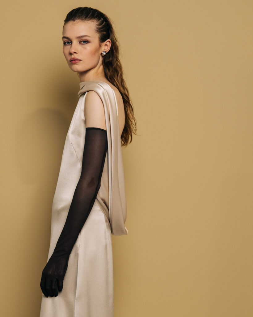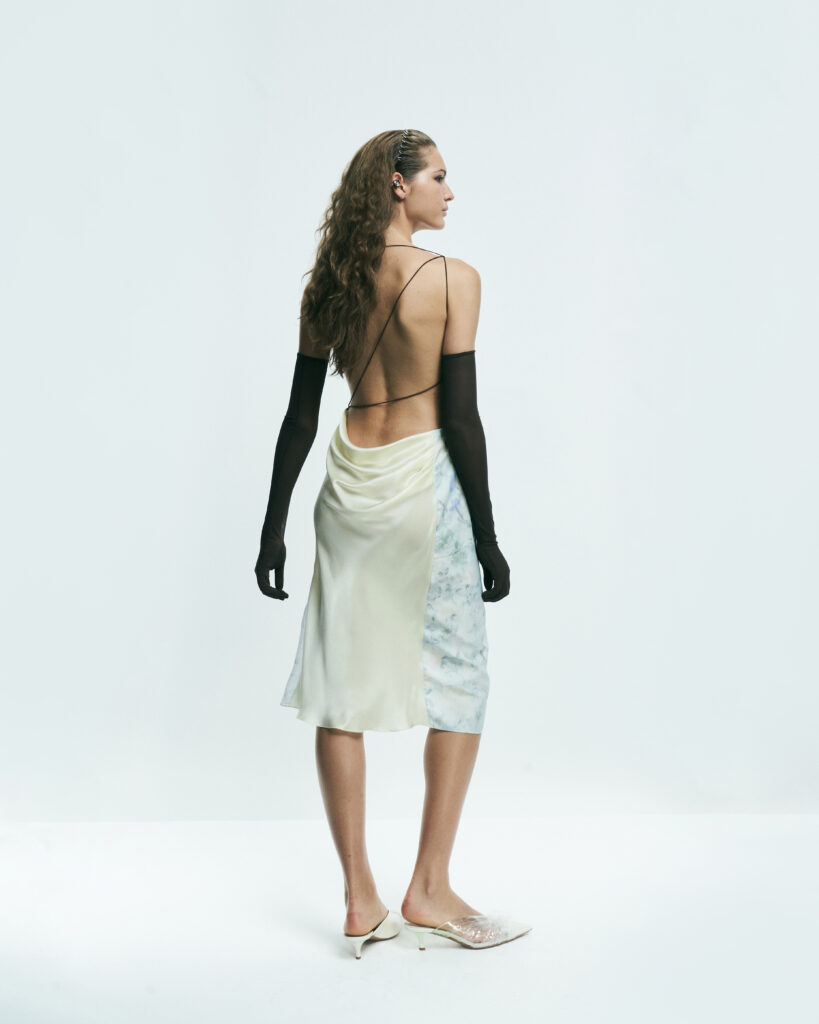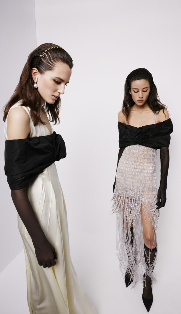 La collection réinterprète les codes du soir pour le jour, avec des robes en filtrage seconde peau, enveloppées, froncées et nouées dans des superpositions translucides.