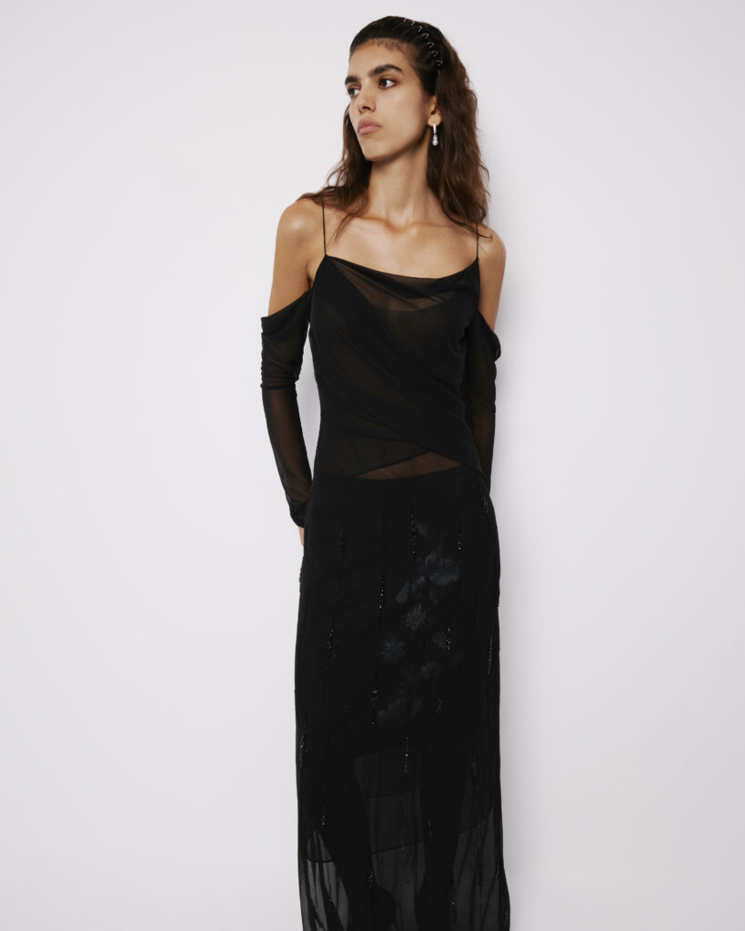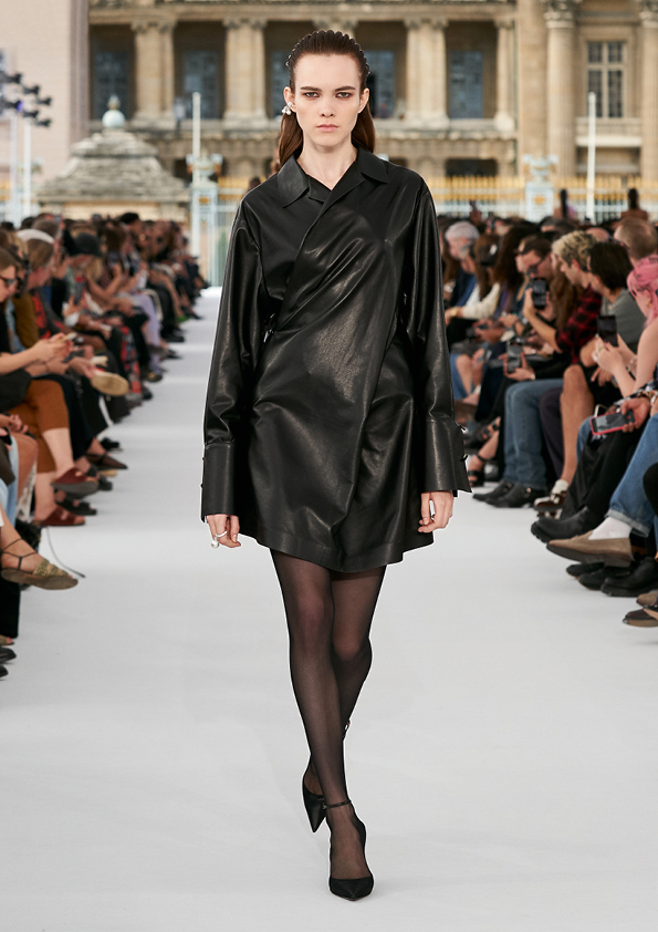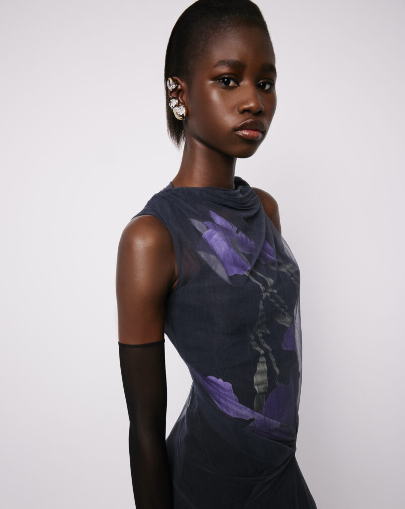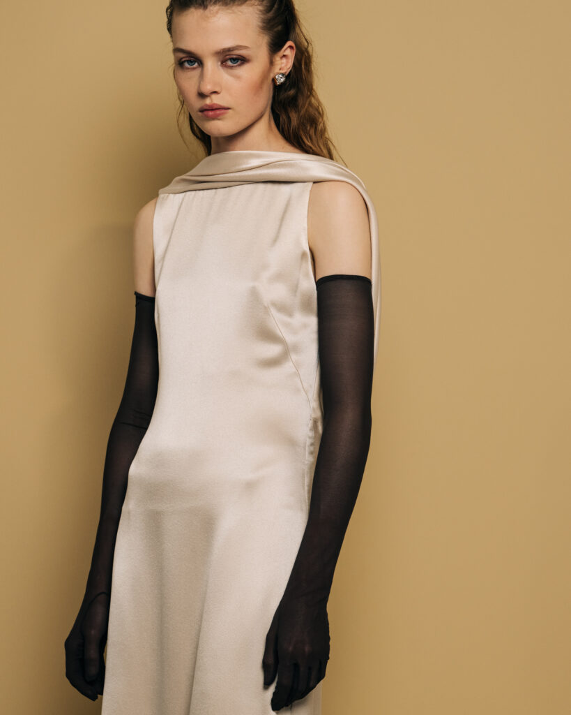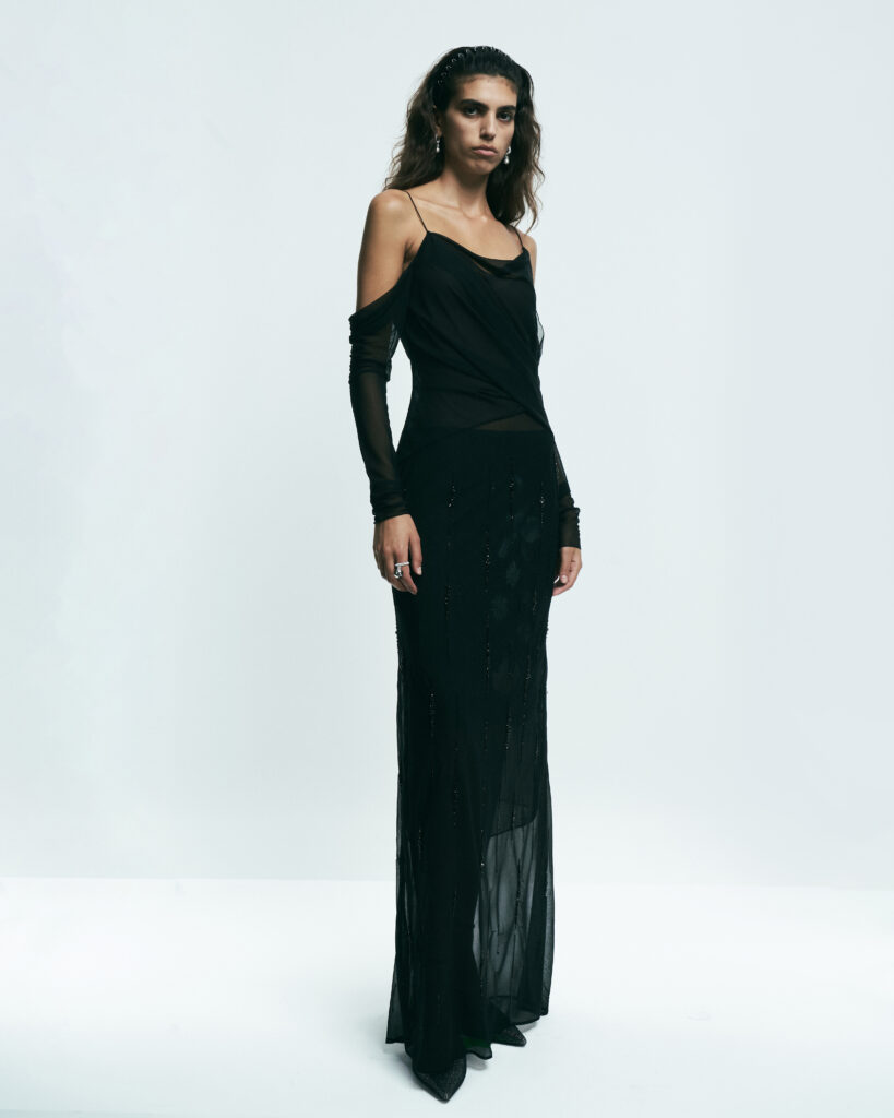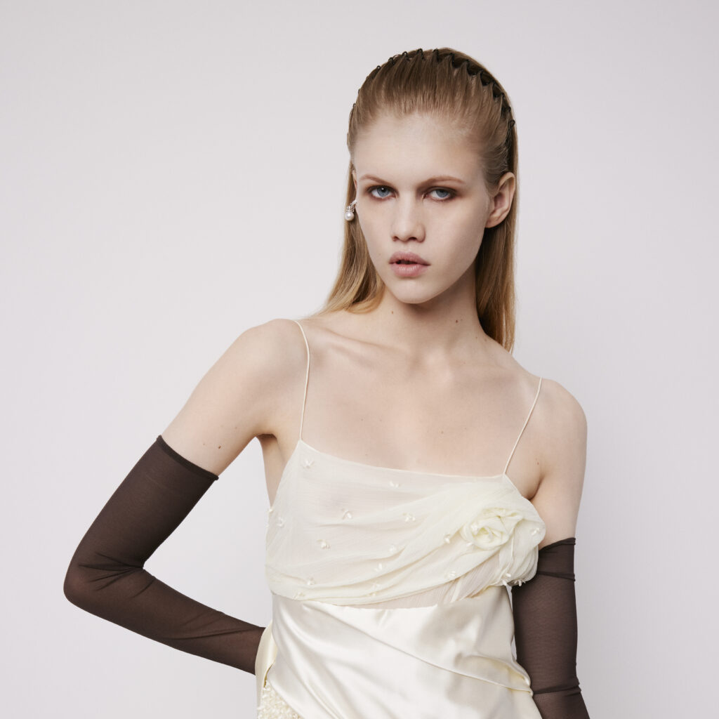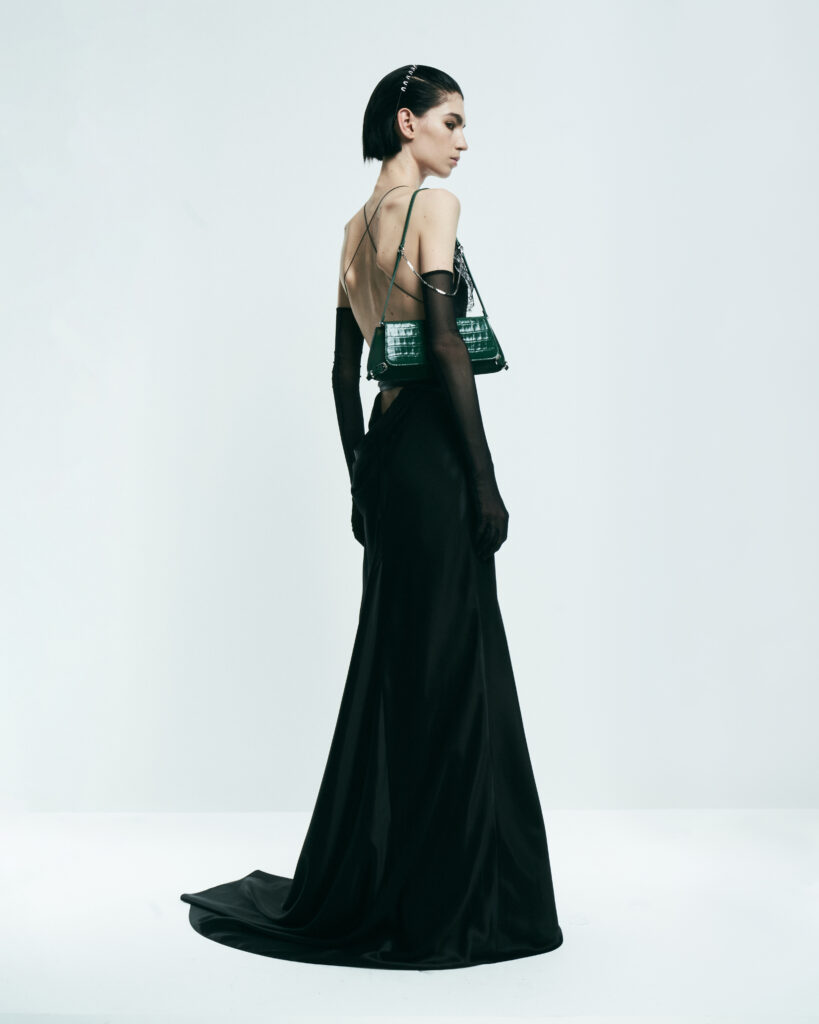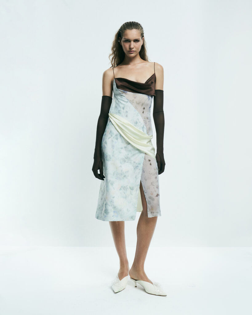 La collection réinterprète les codes du soir pour le jour, avec des robes en filtrage seconde peau, enveloppées, froncées et nouées dans des superpositions translucides.