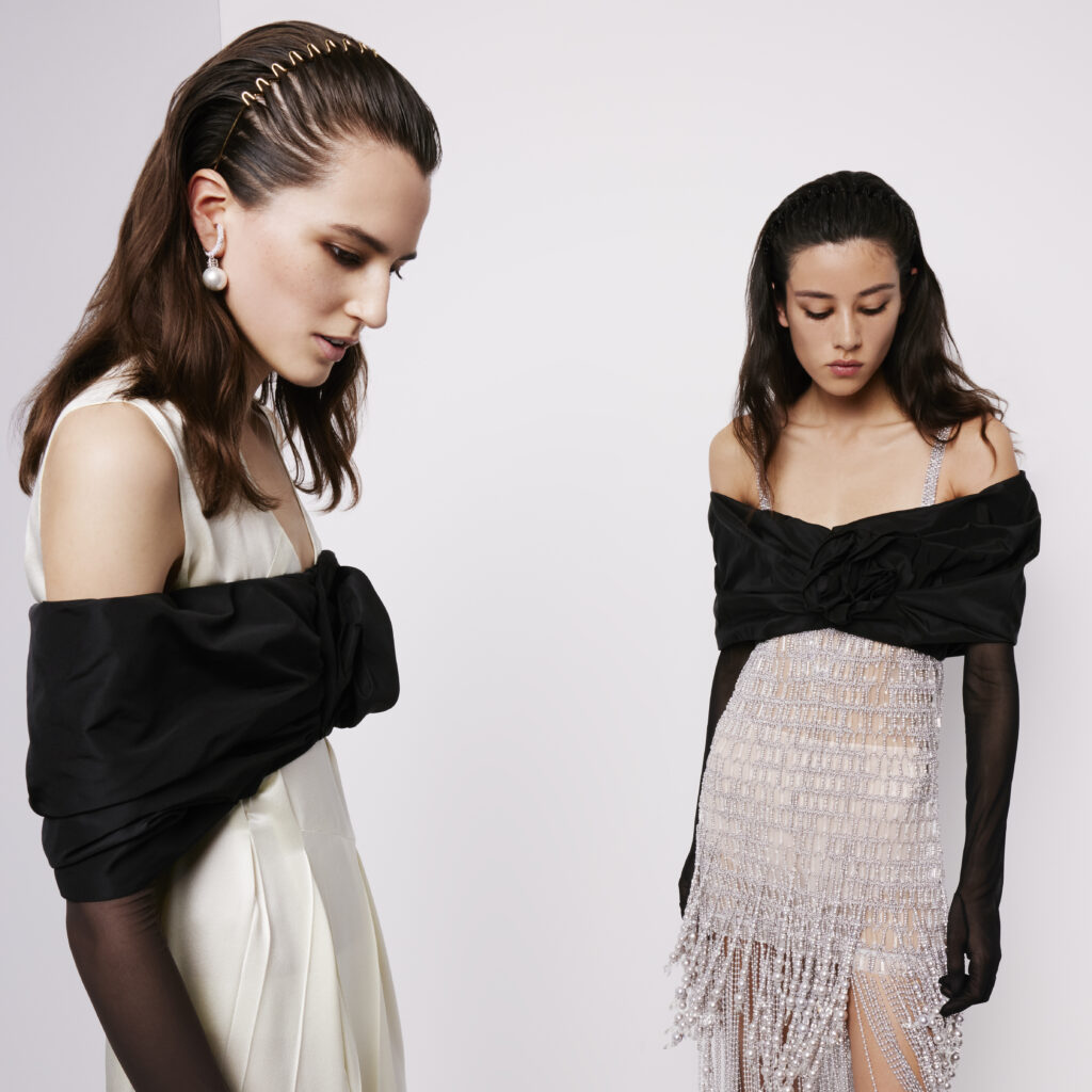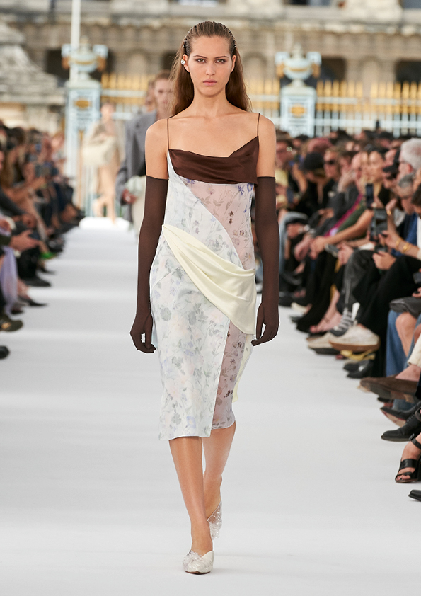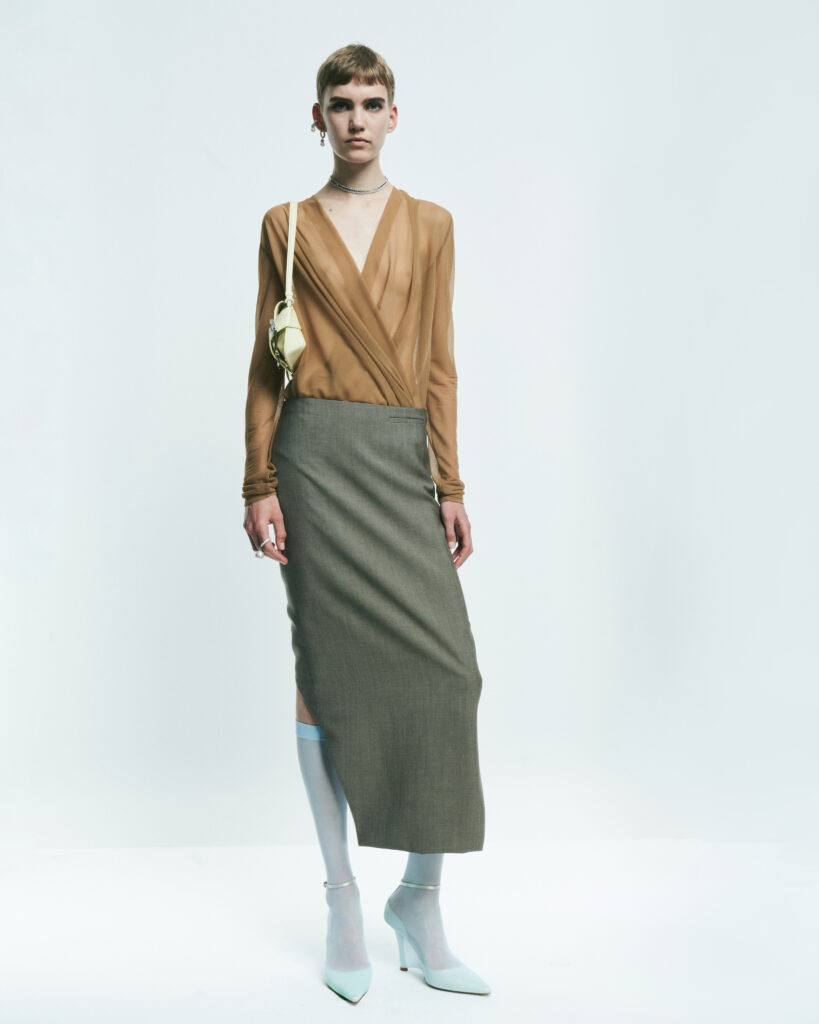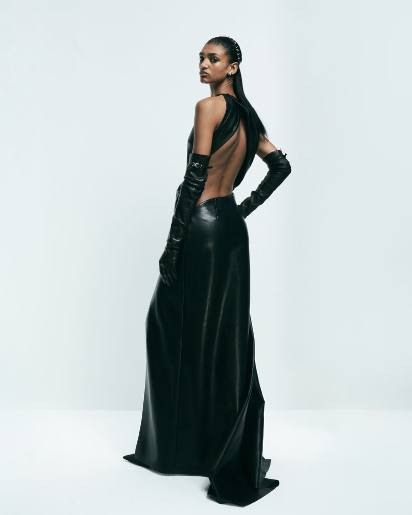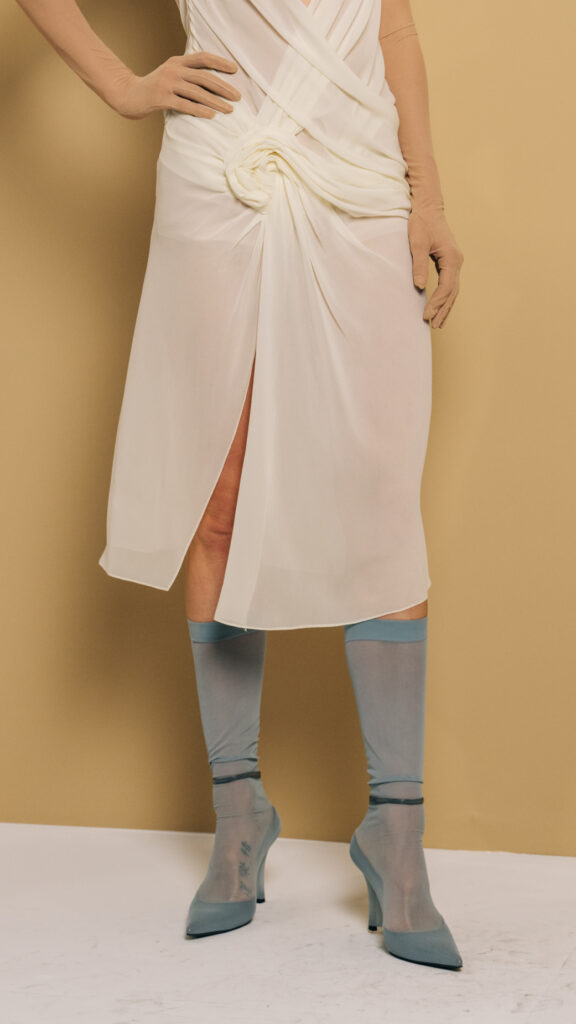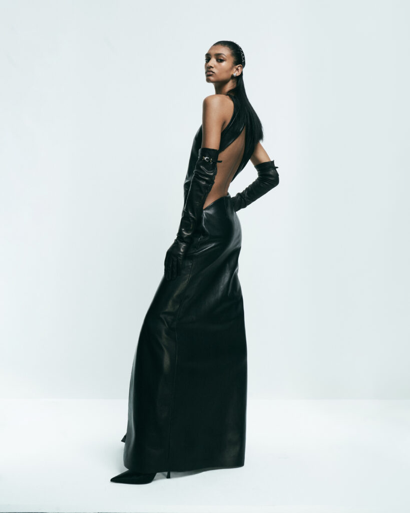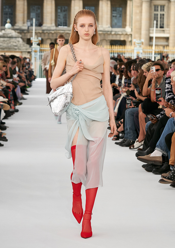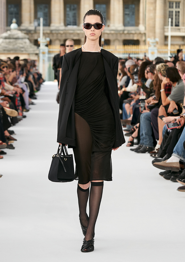 La collection réinterprète les codes du soir pour le jour, avec des robes en filtrage seconde peau, enveloppées, froncées et nouées dans des superpositions translucides.