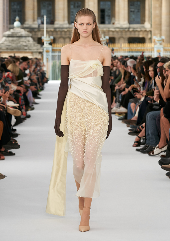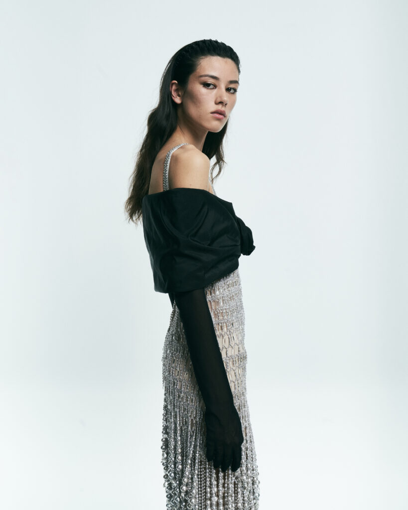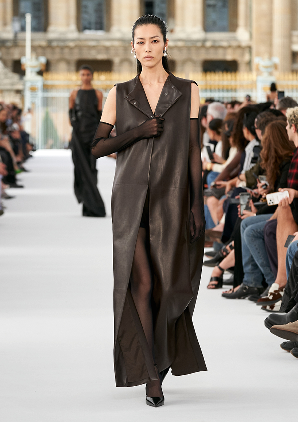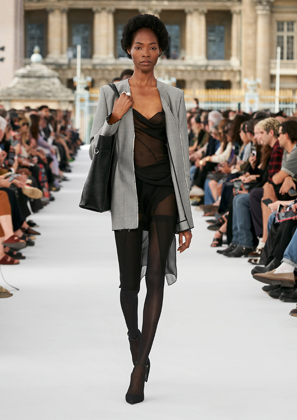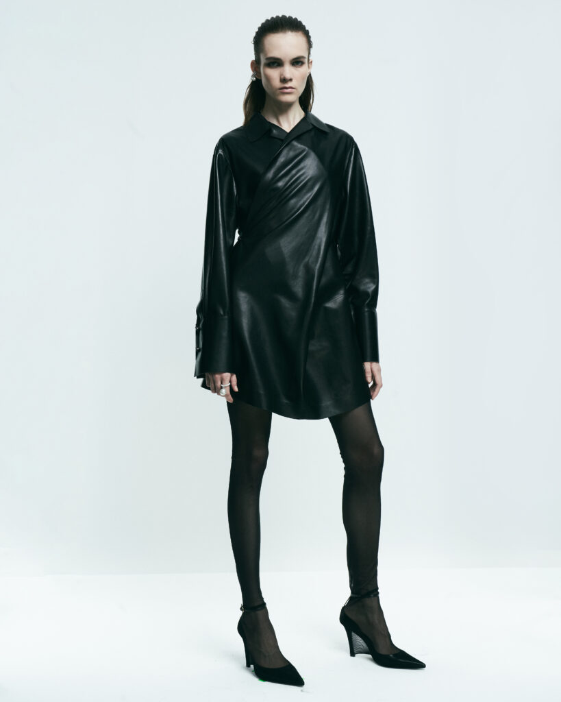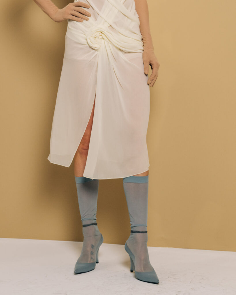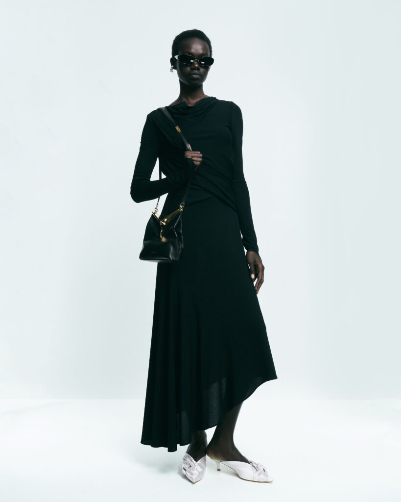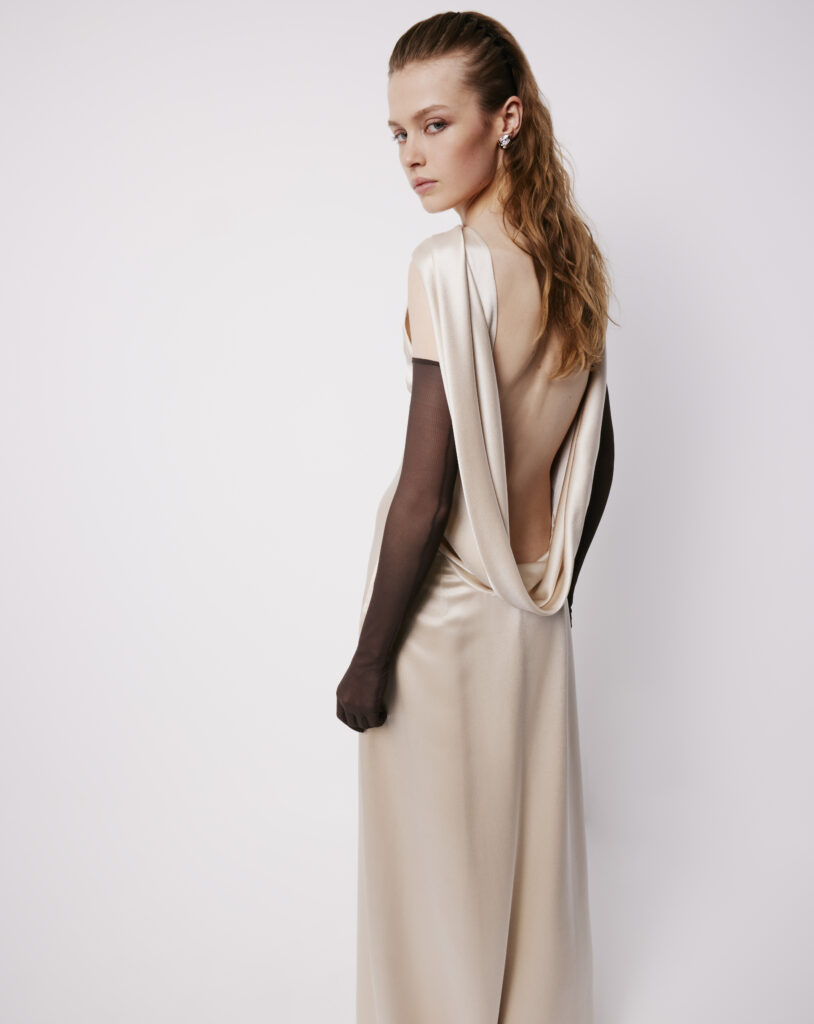 La collection réinterprète les codes du soir pour le jour, avec des robes en filtrage seconde peau, enveloppées, froncées et nouées dans des superpositions translucides.