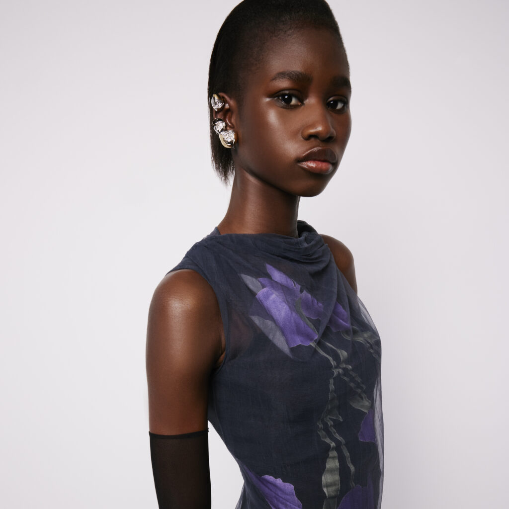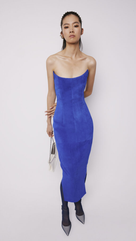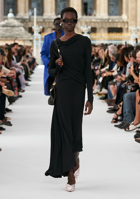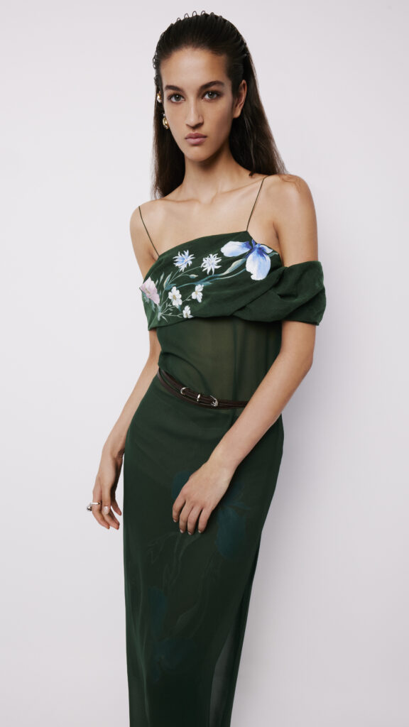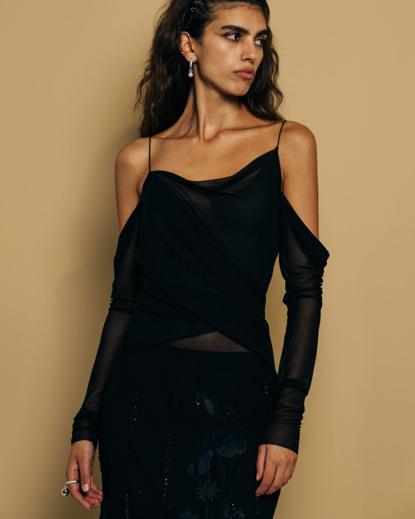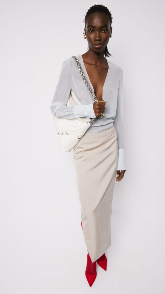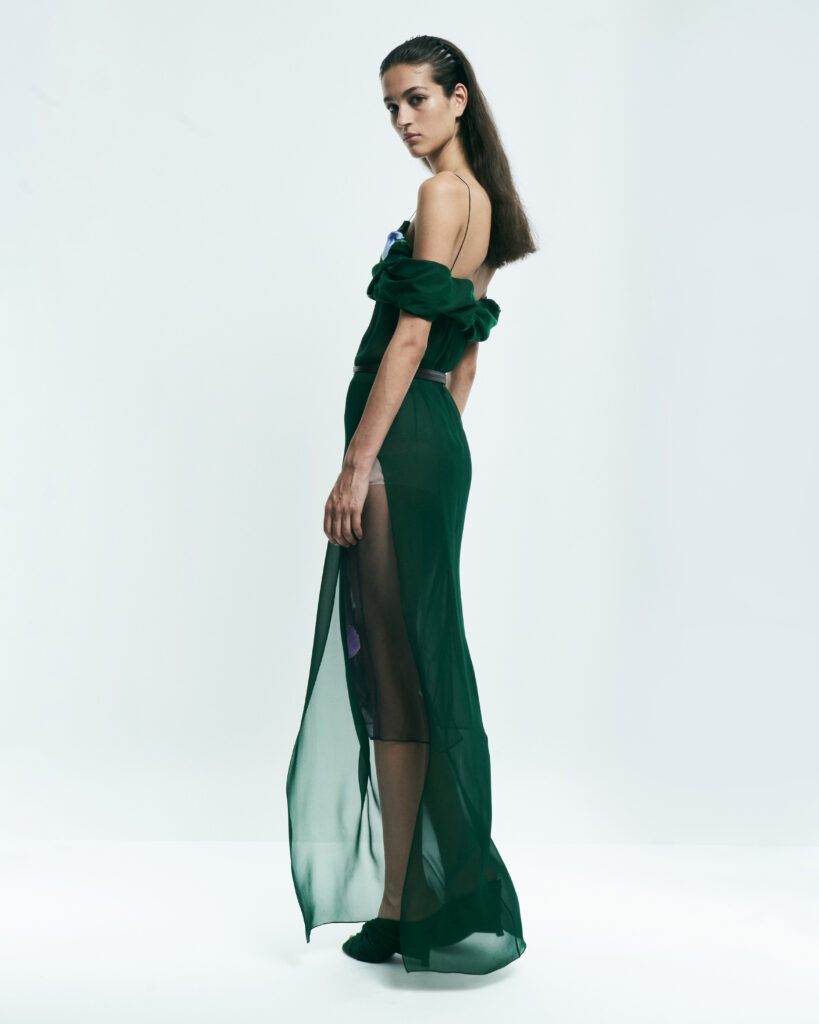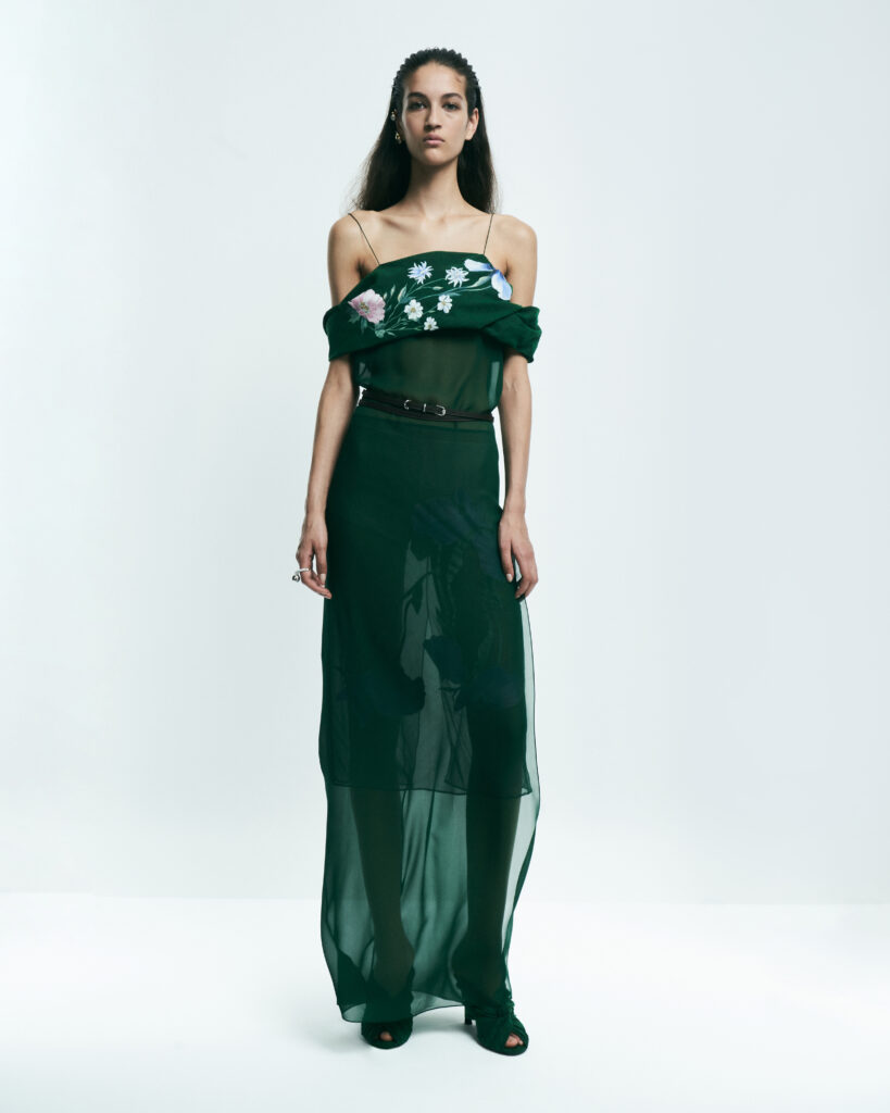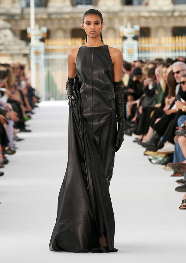 La collection réinterprète les codes du soir pour le jour, avec des robes en filtrage seconde peau, enveloppées, froncées et nouées dans des superpositions translucides.
