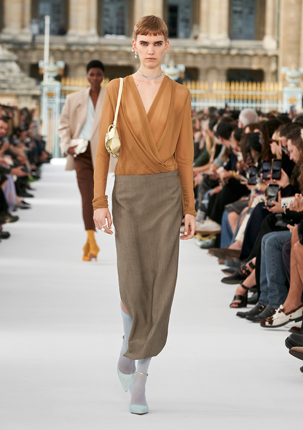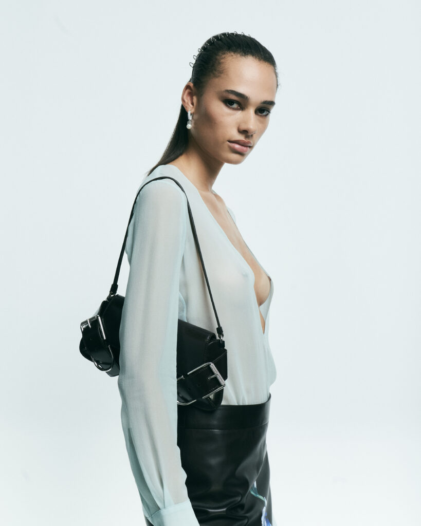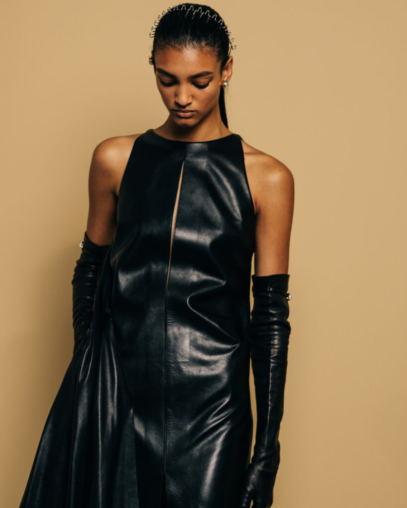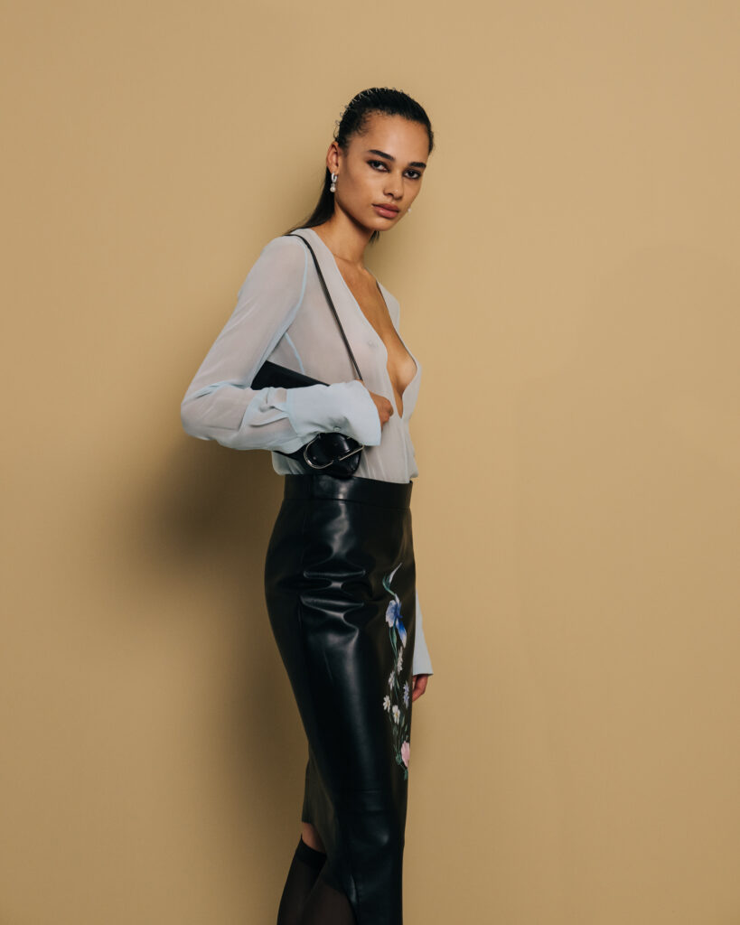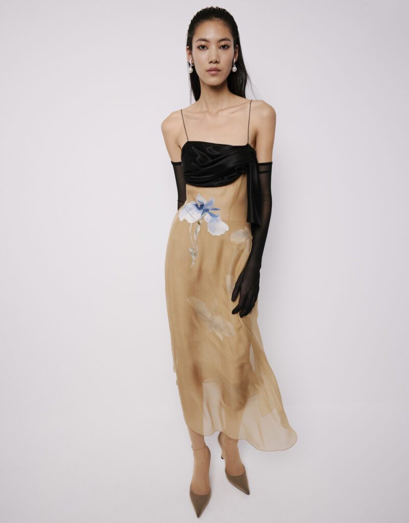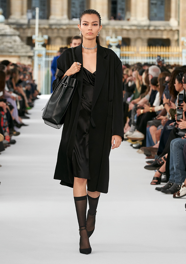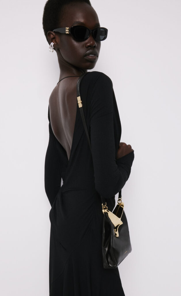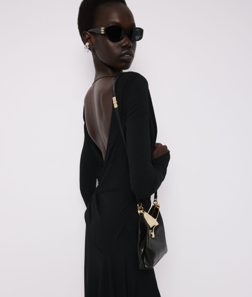 La collection réinterprète les codes du soir pour le jour, avec des robes en filtrage seconde peau, enveloppées, froncées et nouées dans des superpositions translucides.