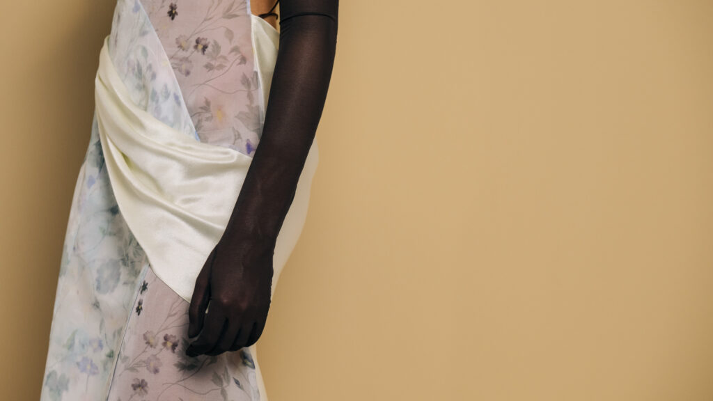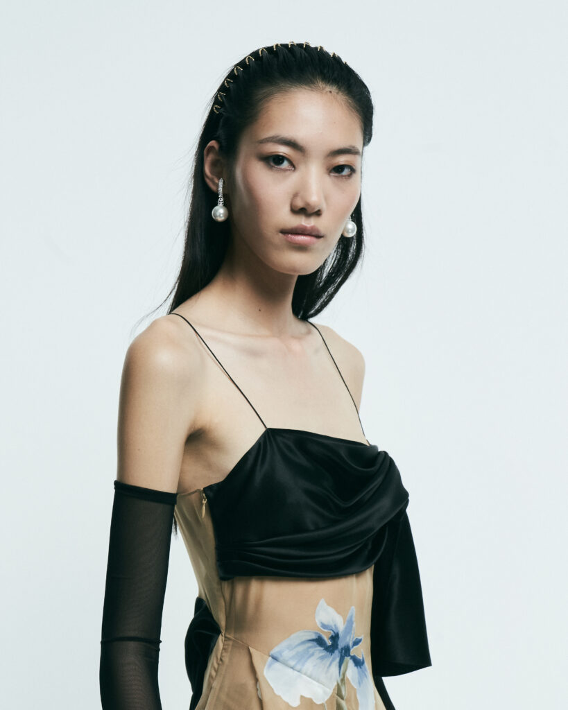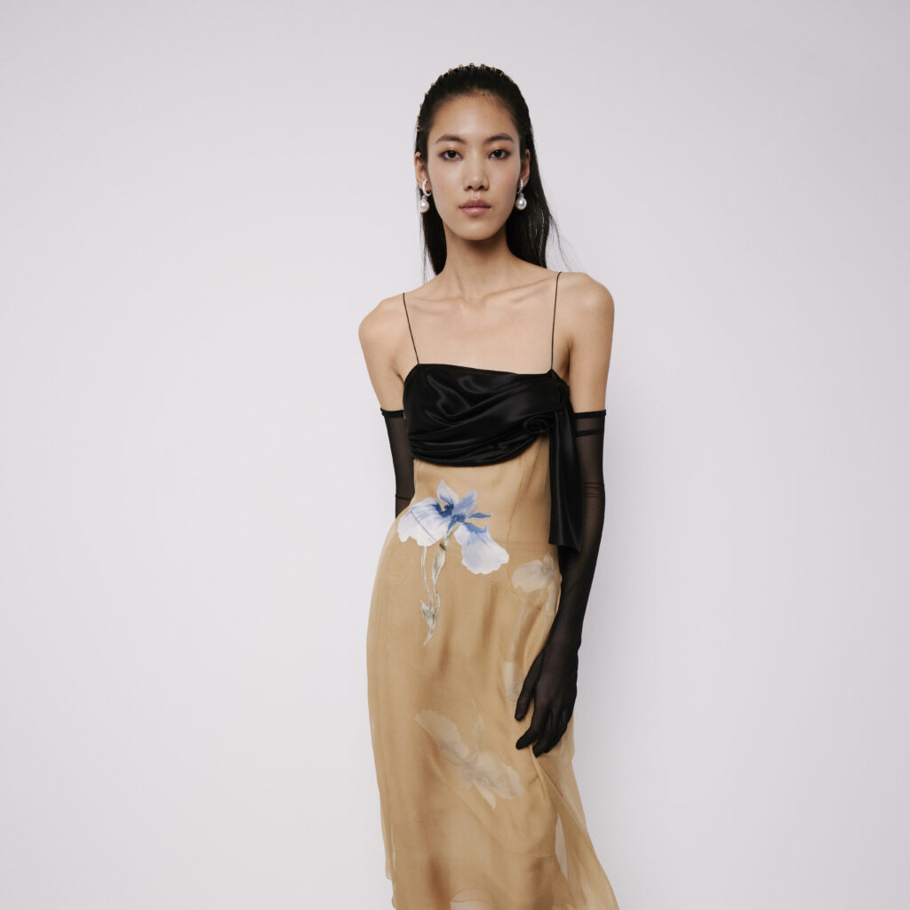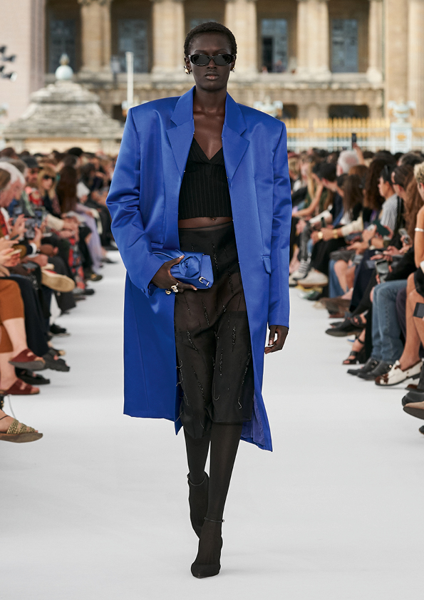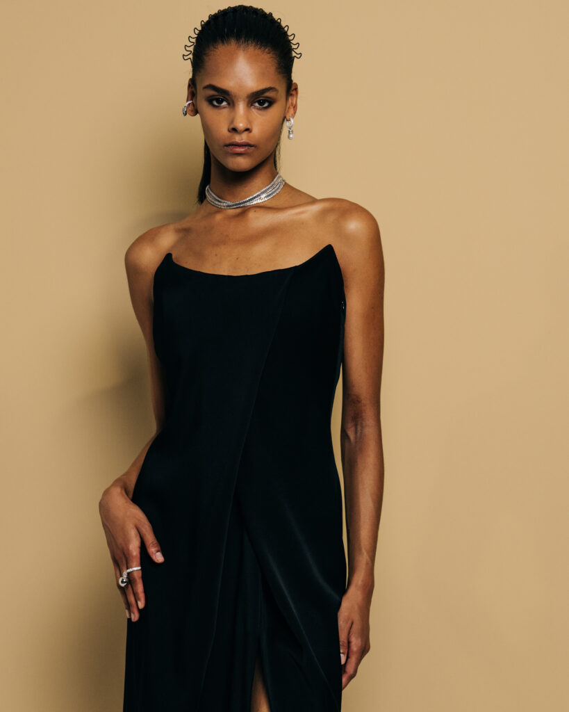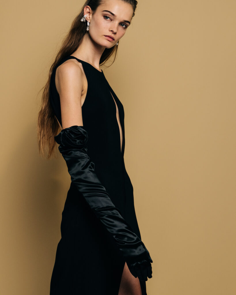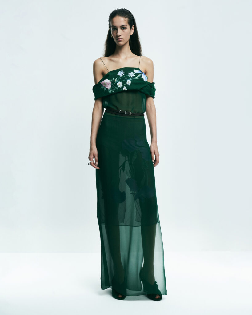 La collection réinterprète les codes du soir pour le jour, avec des robes en filtrage seconde peau, enveloppées, froncées et nouées dans des superpositions translucides.