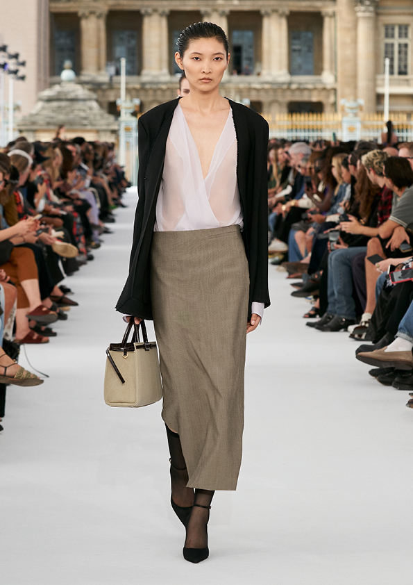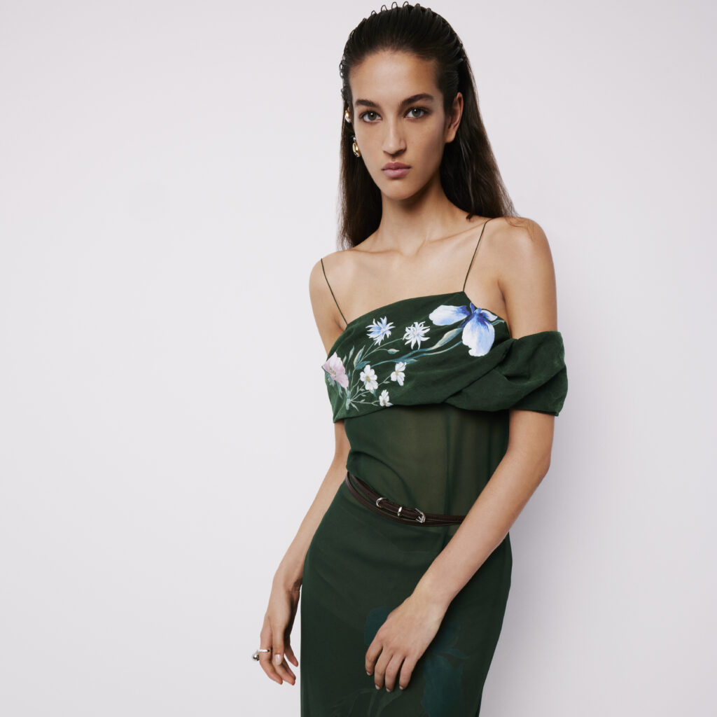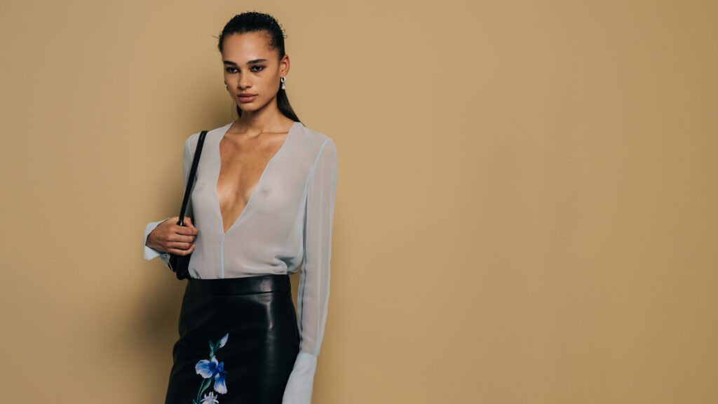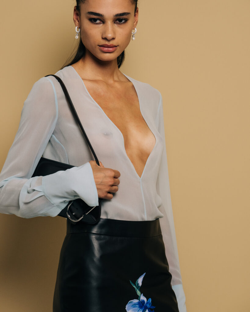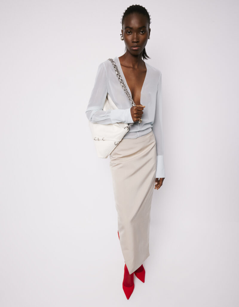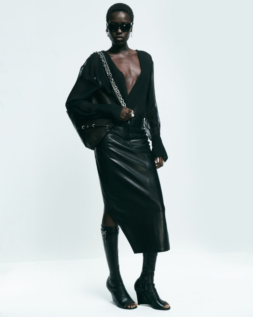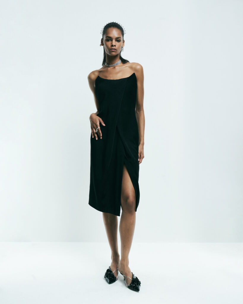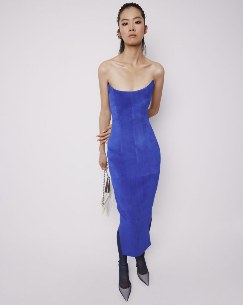 La collection réinterprète les codes du soir pour le jour, avec des robes en filtrage seconde peau, enveloppées, froncées et nouées dans des superpositions translucides.