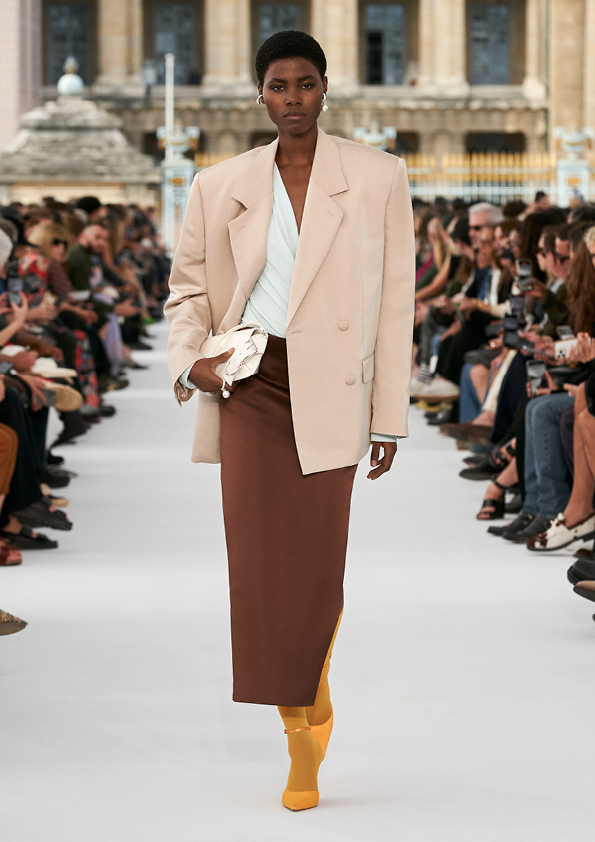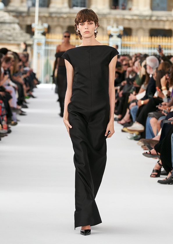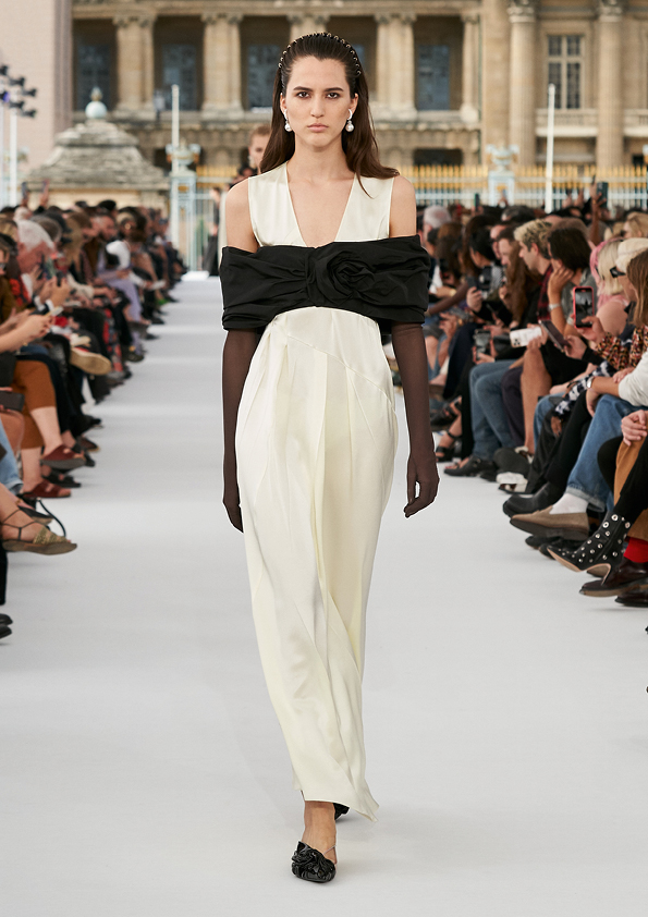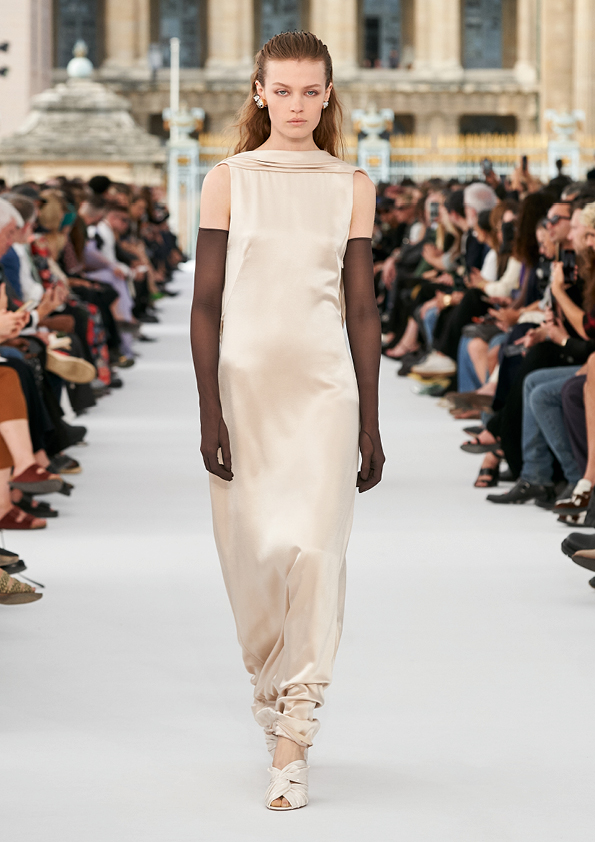 Le défilé s’est tenu dans les jardins de l’École Militaire, dans une structure urbaine conçue par Gabriel Calatrava pour le Collaborative Architecture Laboratory. Le décor, fait de matériaux loués et réutilisables, reflétait les thèmes de facilité et d’élégance de la collection.
