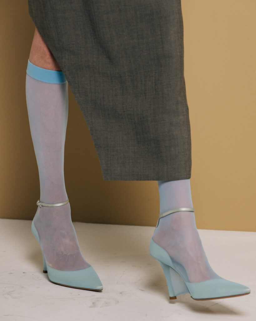 - Escarpins et mules : Des stilettos pointus enveloppés de mailles et des mules avec un embellissement semblable à une fleur.