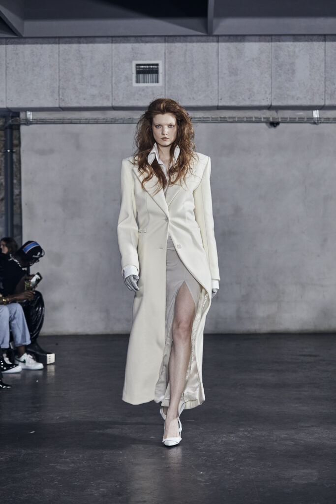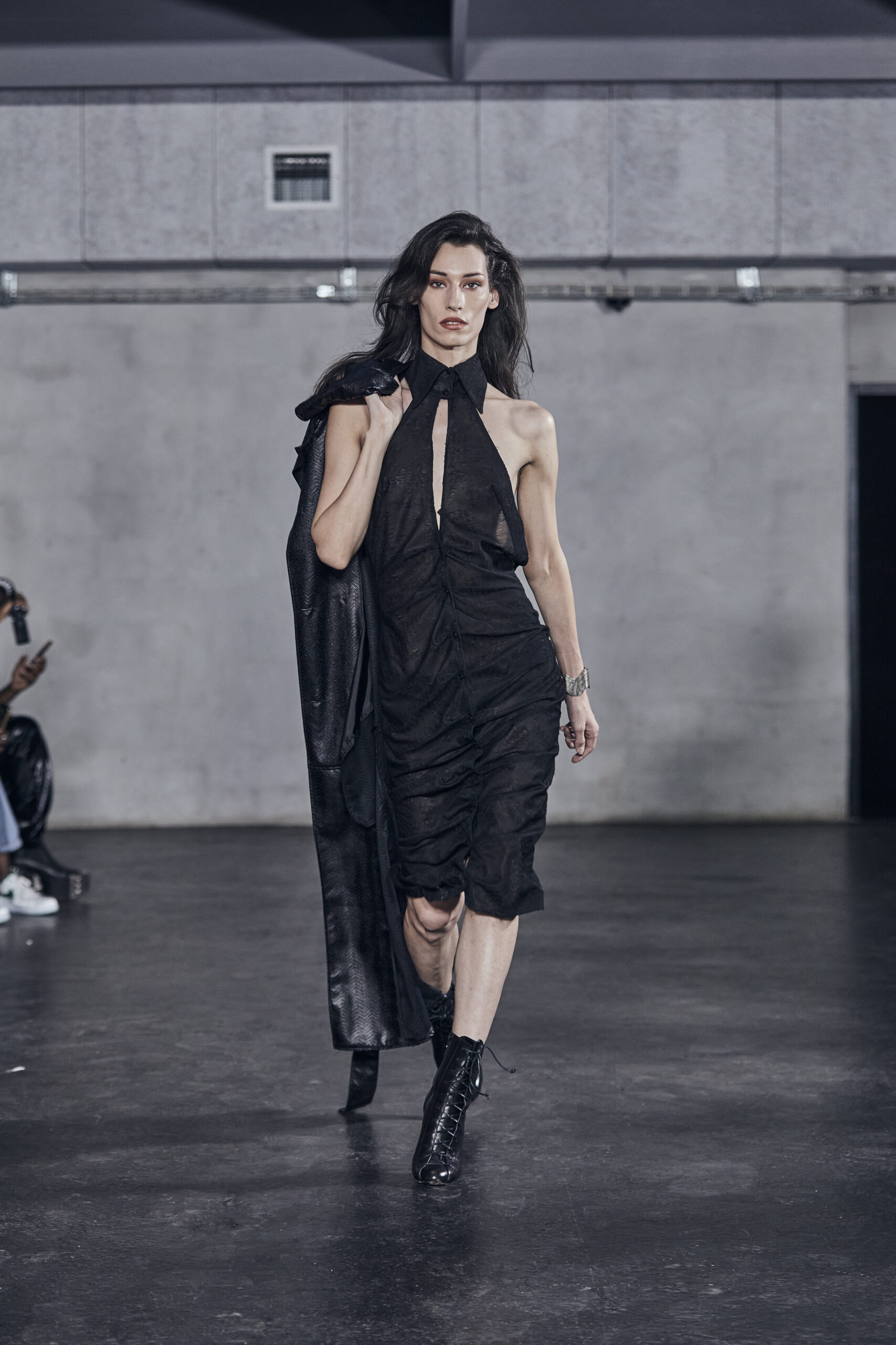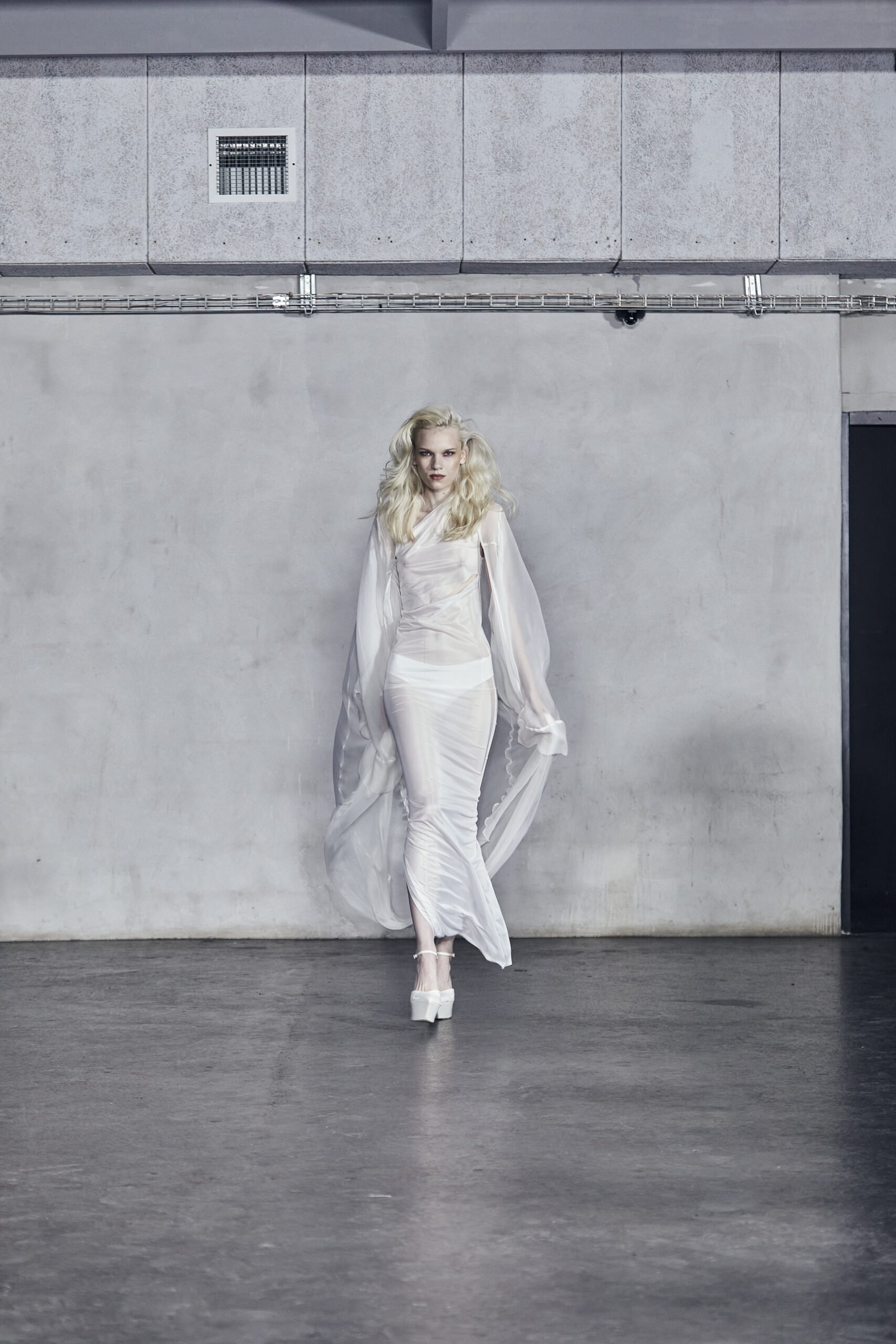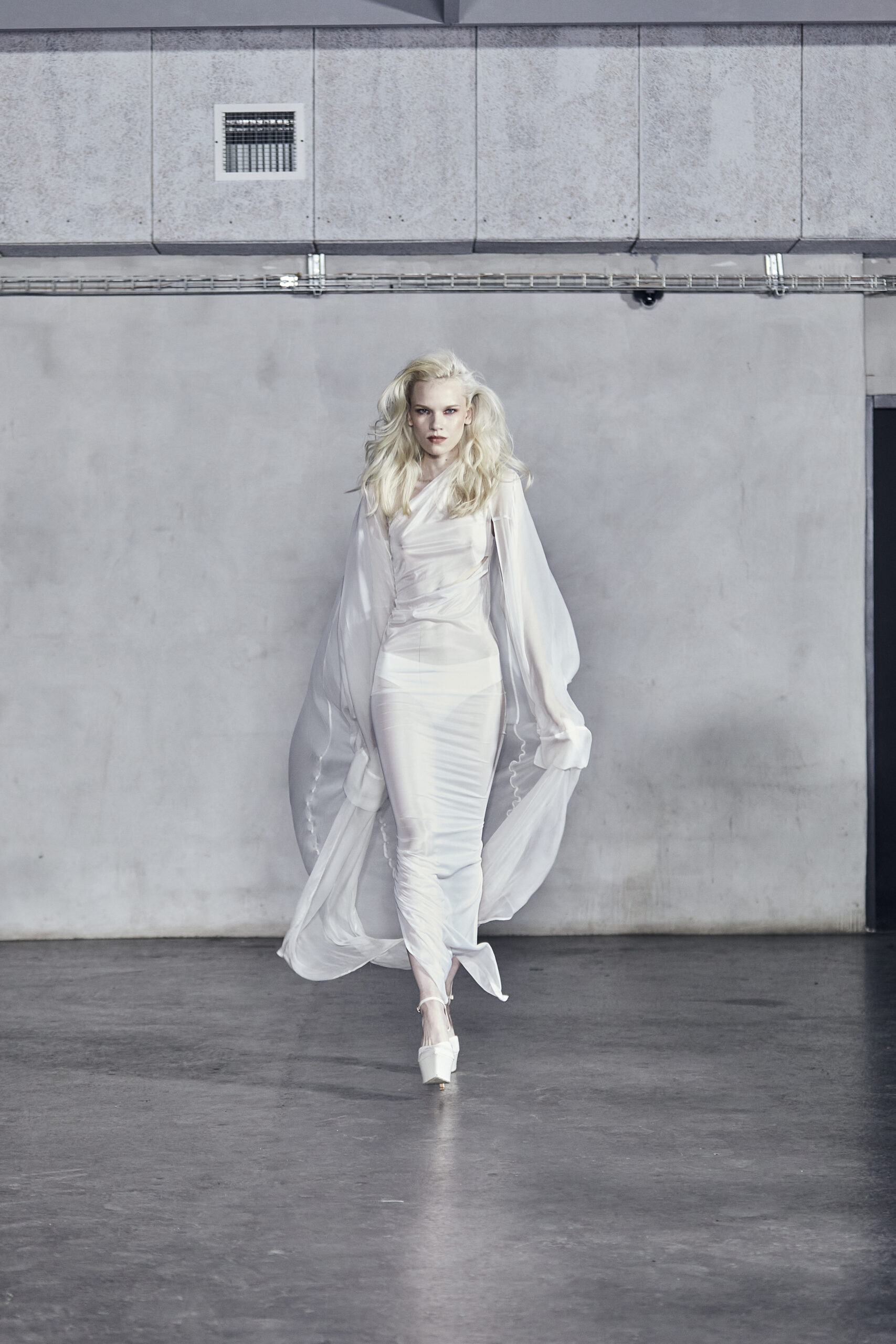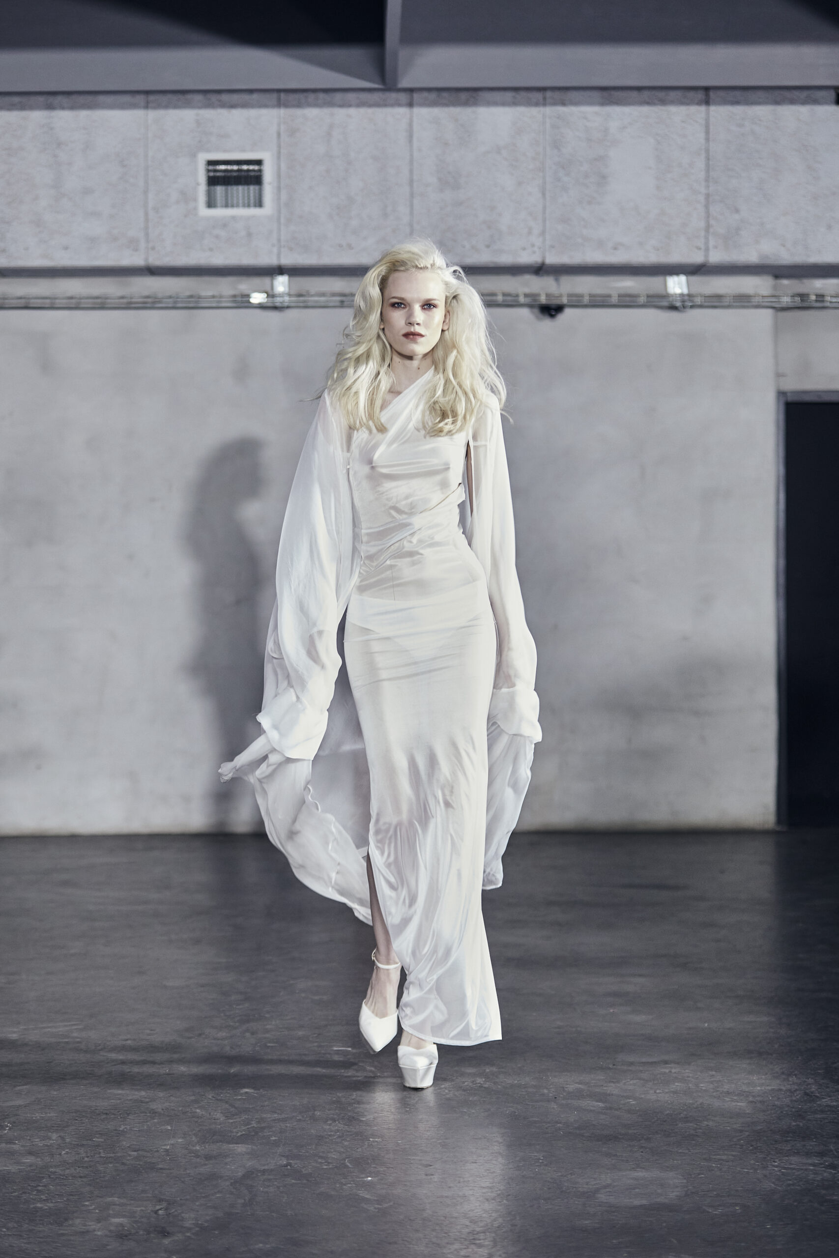 Les robes de la collection, fluides et allongées, jouent avec les superpositions et les proportions. Associées à des vestes couture aux épaules dramatiques, ces robes se démarquent par des cols licou, des dos échancrés, des laçages corsetés et des découpes audacieuses.