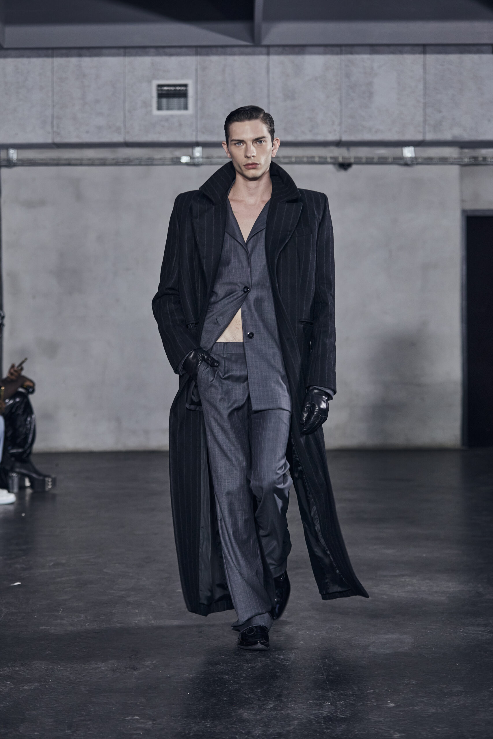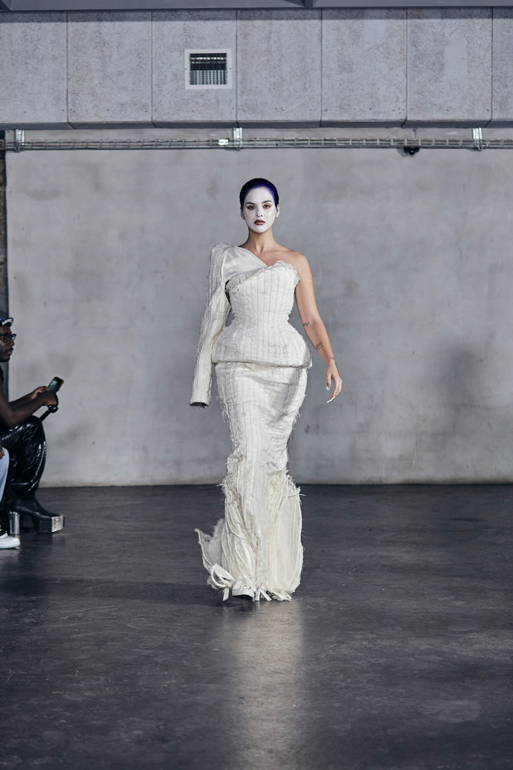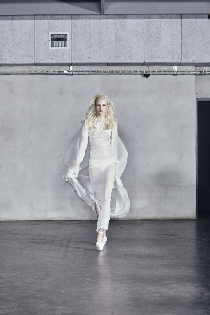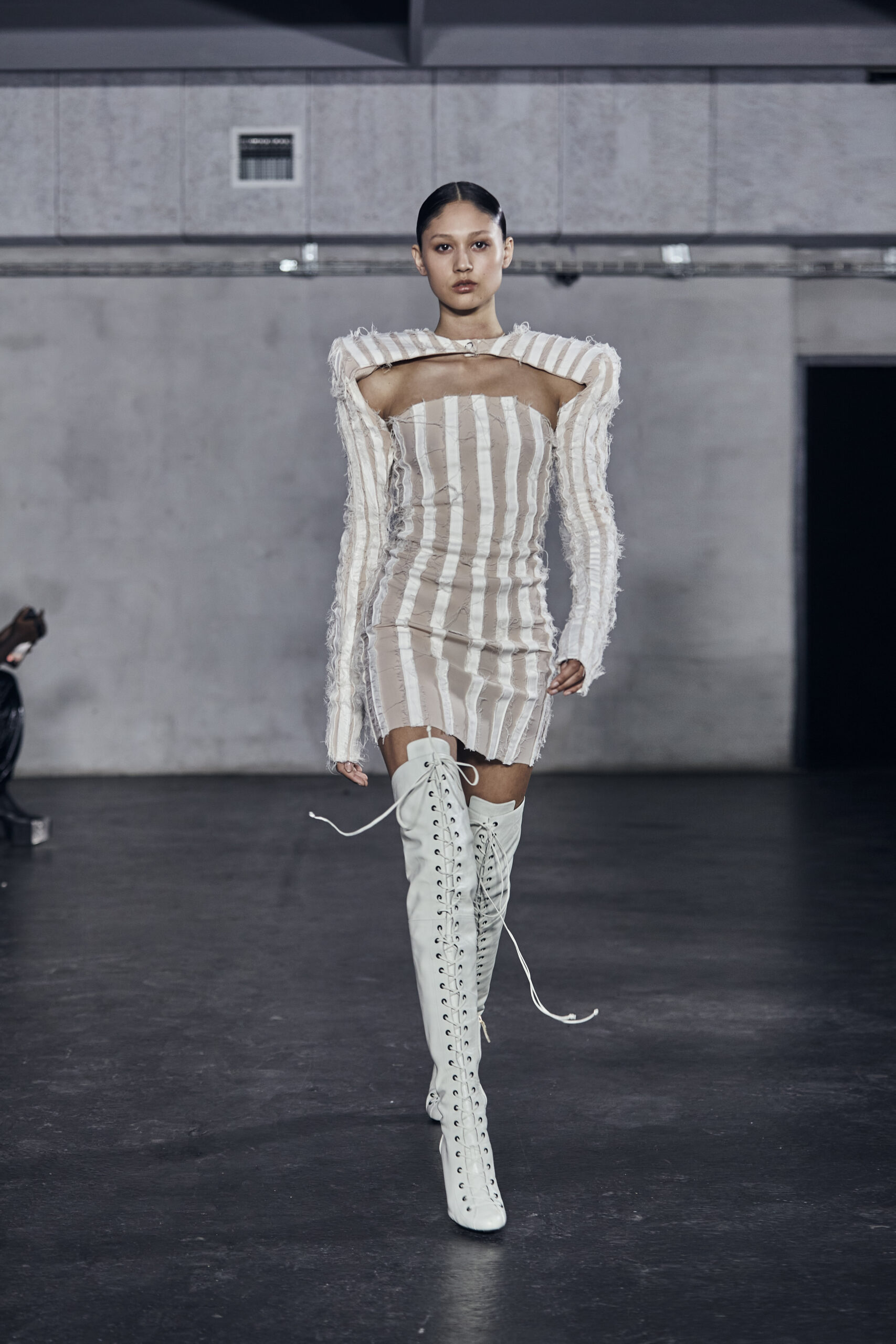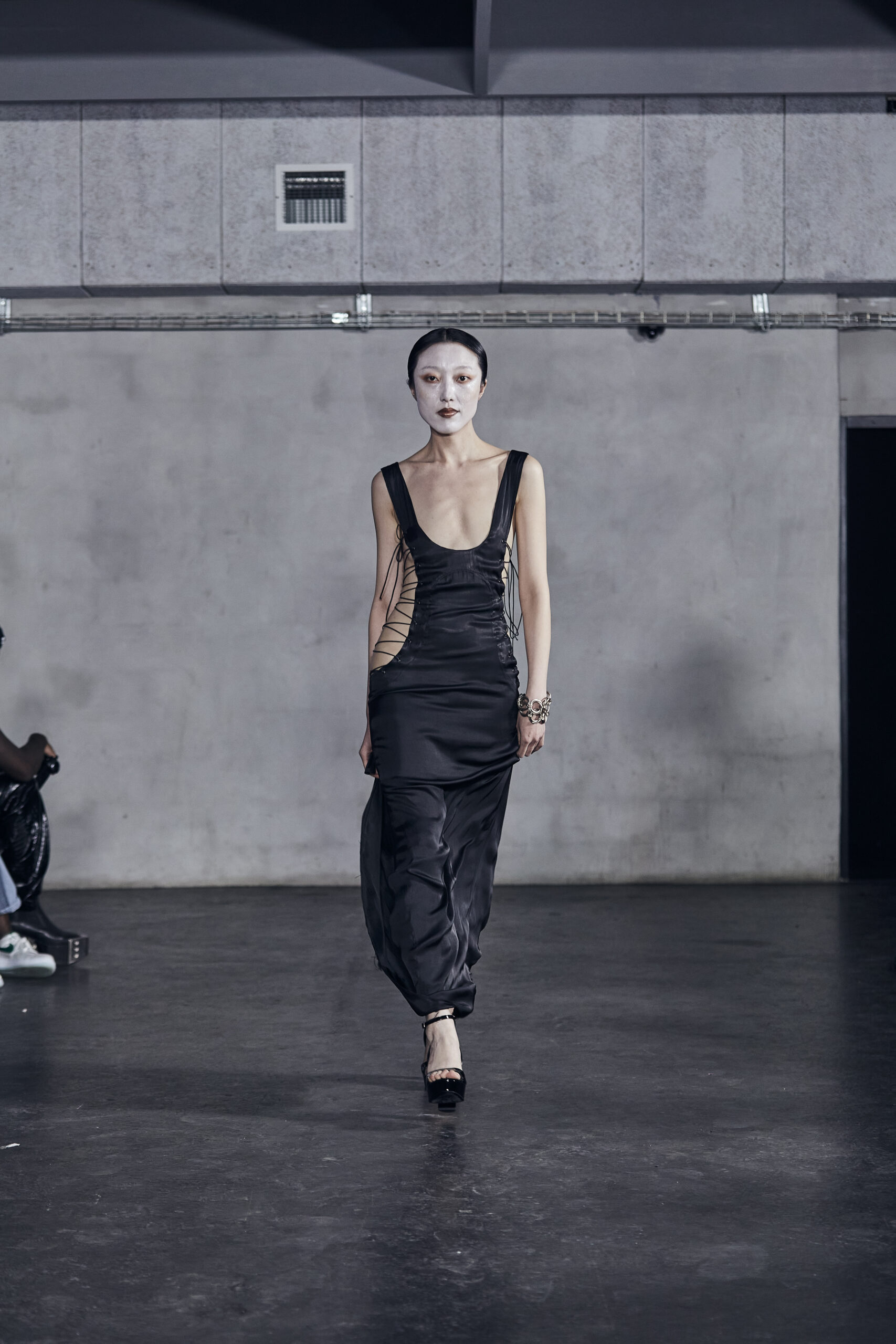 Les robes de la collection, fluides et allongées, jouent avec les superpositions et les proportions. Associées à des vestes couture aux épaules dramatiques, ces robes se démarquent par des cols licou, des dos échancrés, des laçages corsetés et des découpes audacieuses.