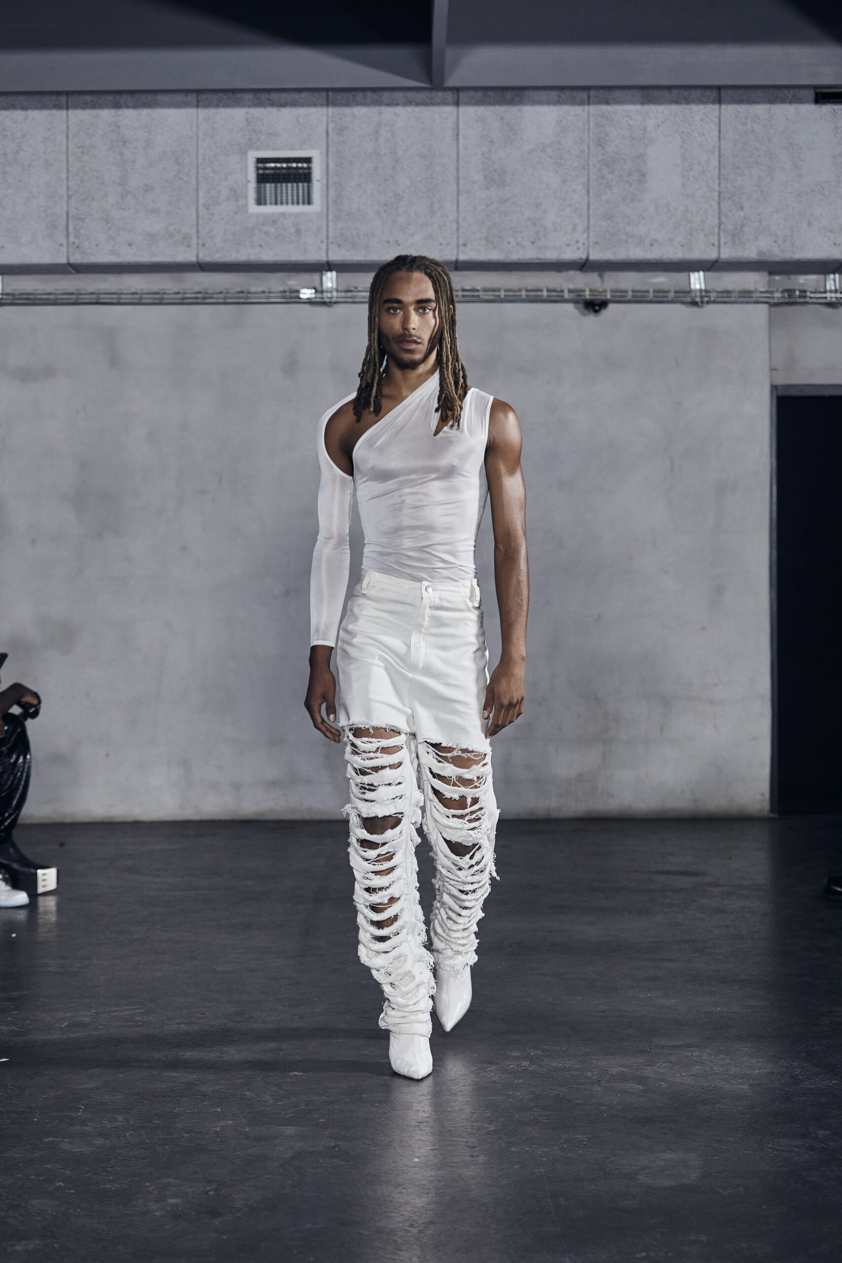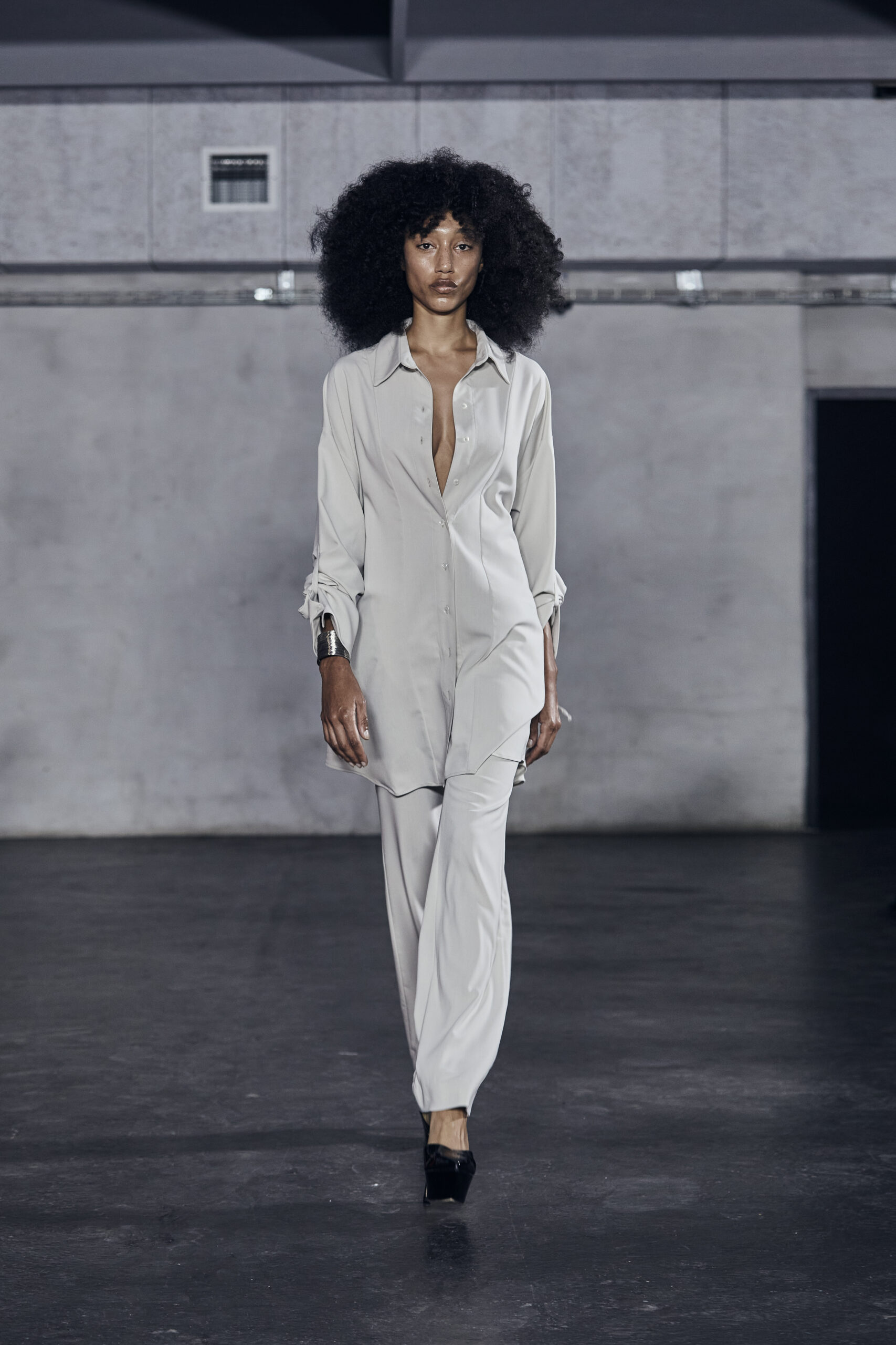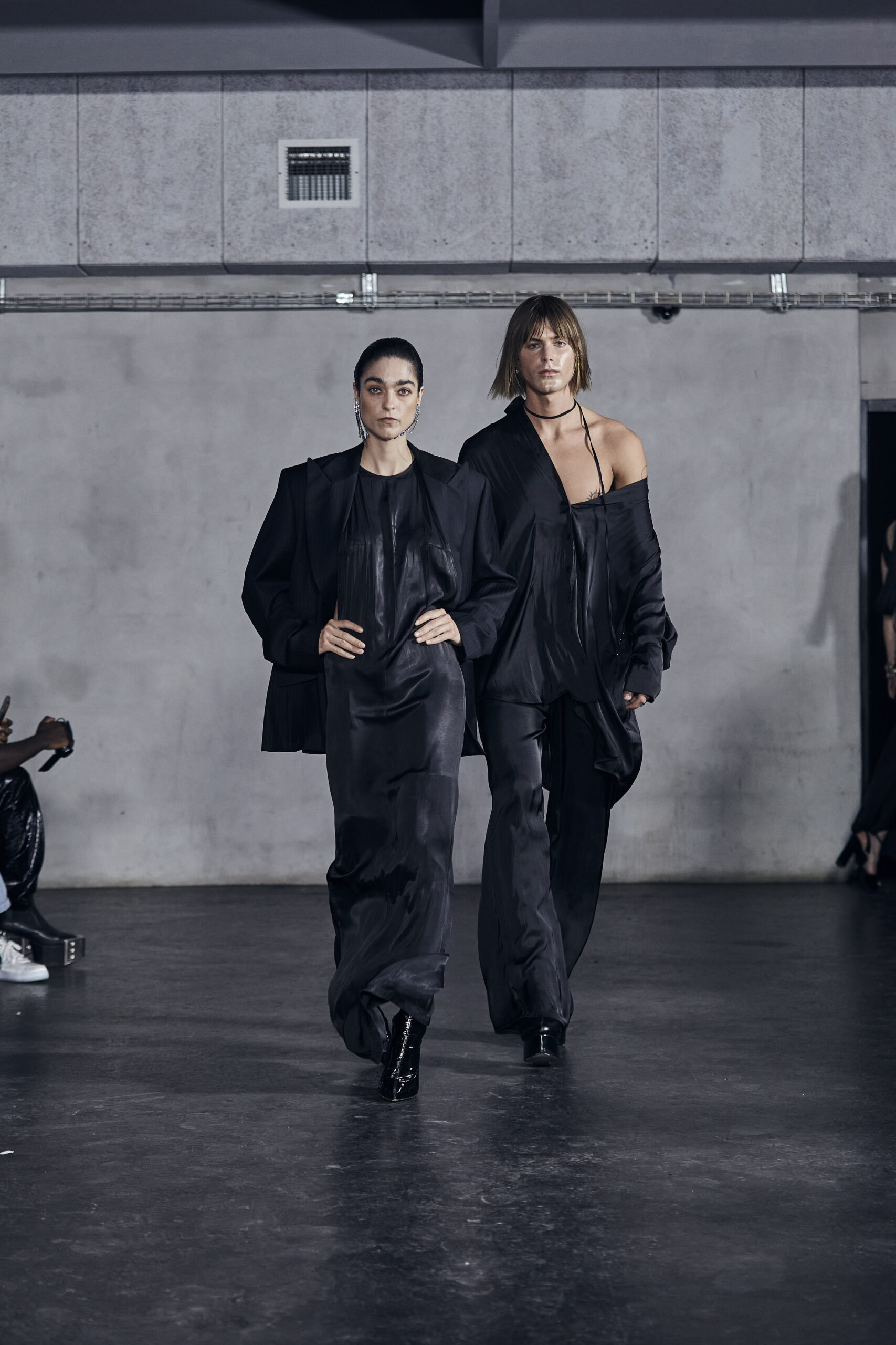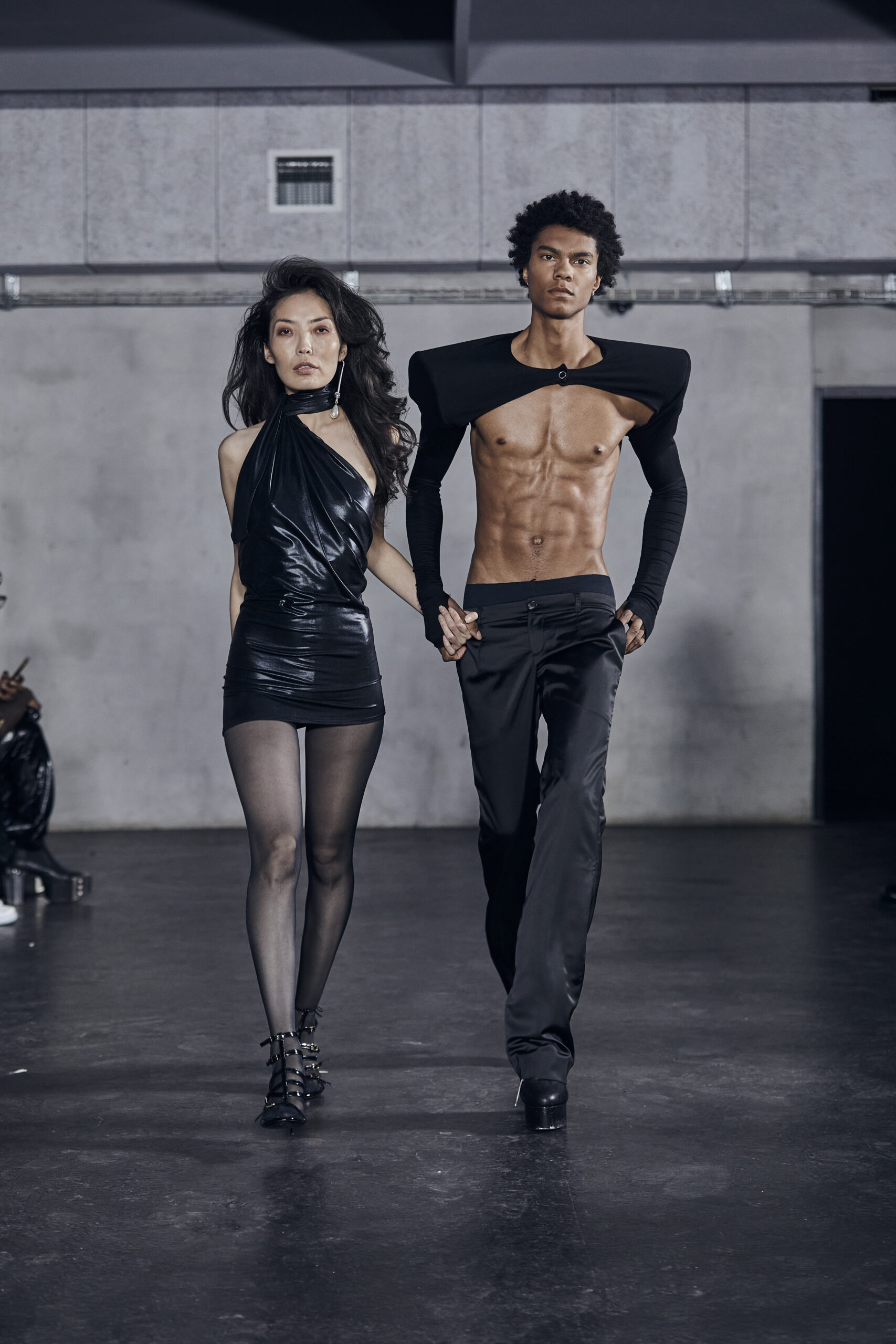 Les silhouettes SS24 s’étendent dans des formes allongées et androgynes, avec une palette de couleurs principalement noire et blanche, incarnant l’ultime chic parisien. Des touches de fuchsia et de violet sont intégrées pour ajouter du glamour. Les matières, choisies pour leur sensualité, comprennent des tissus moulants, transparents et fluides en coton SUPIMA de haute qualité.