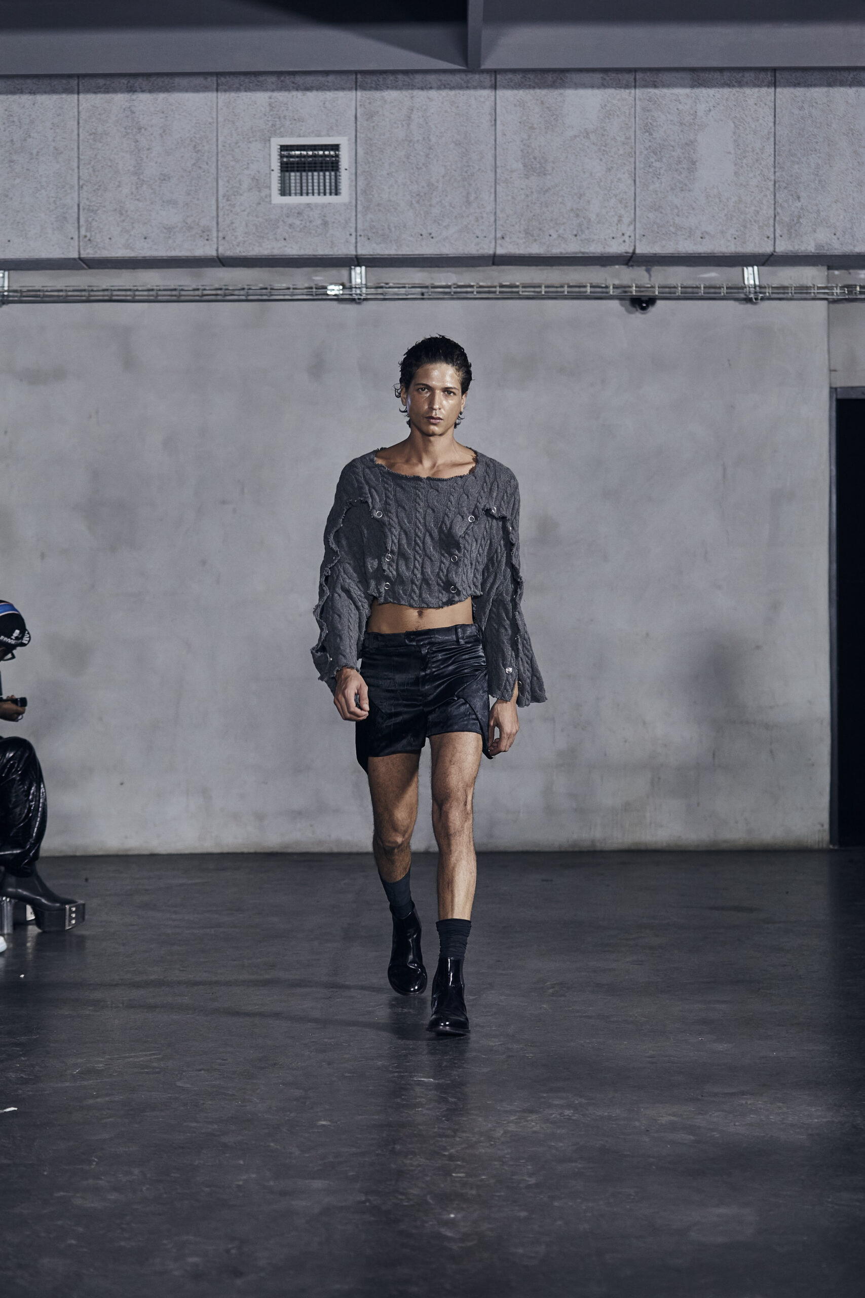 Le choix des hauts dans la collection SS24 est varié : jersey à effet lustré, coton, dentelle et maille. Les designs présentent des drapés asymétriques, des décolletés plongeants et des manches écharpe. Les basiques incluent le débardeur inversé de PRESSIAT, des pulls transformables et des chemises romantiques.